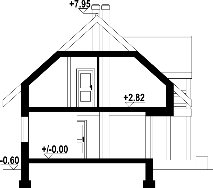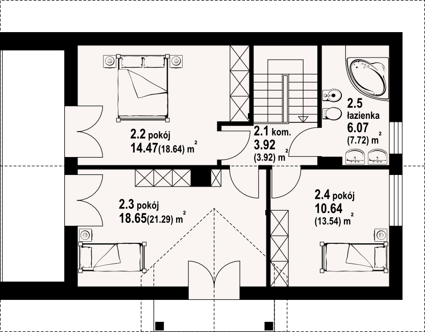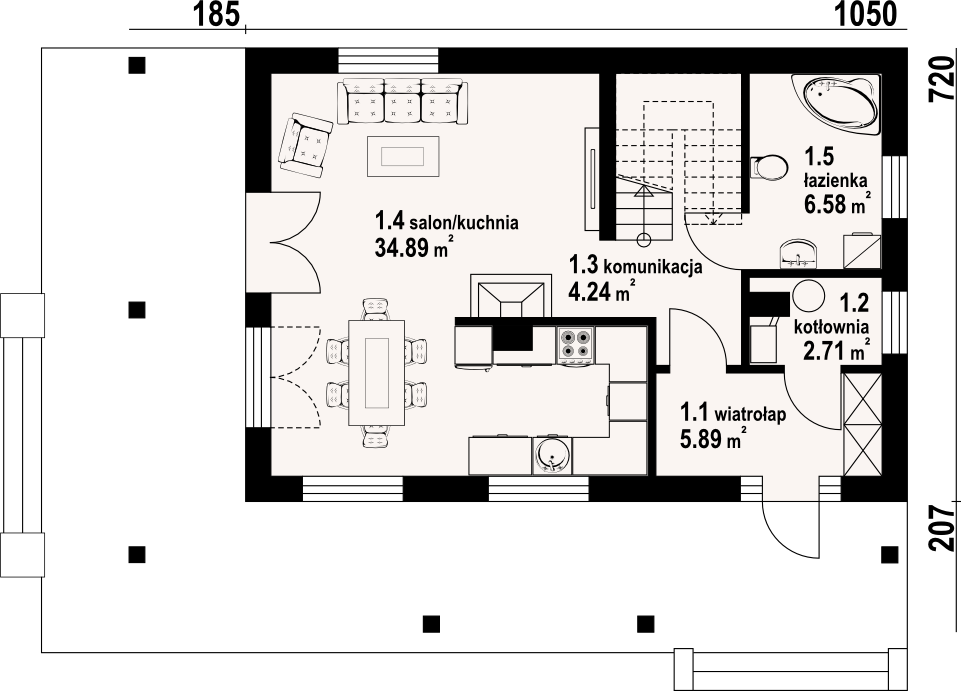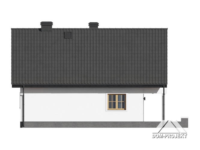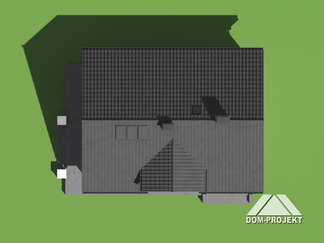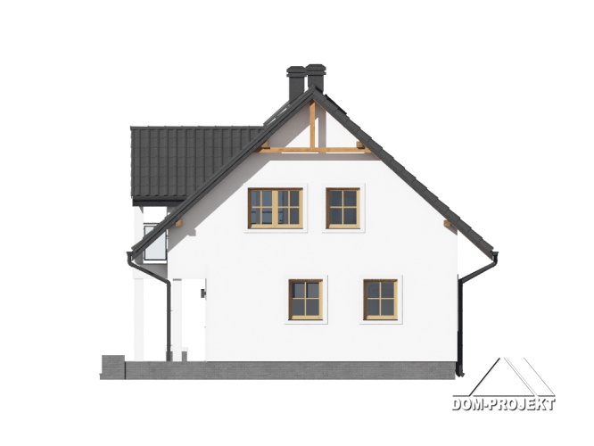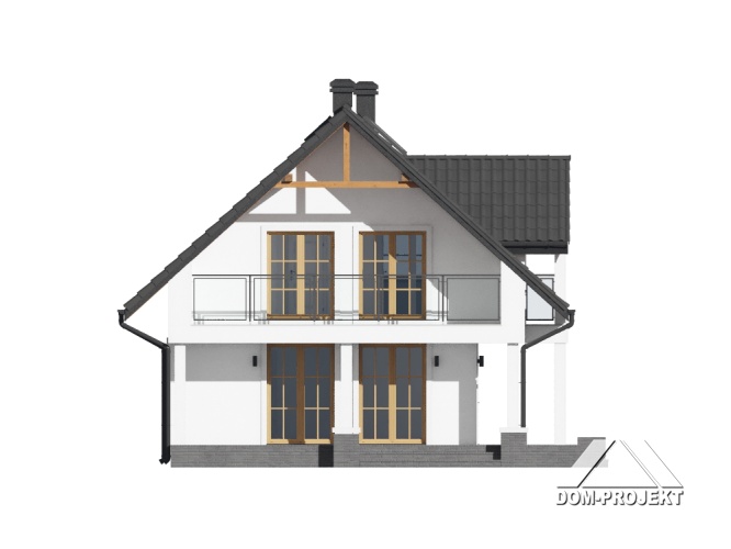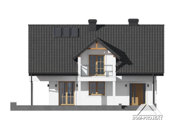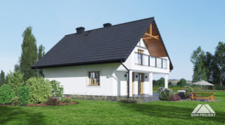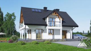 Dom z poddaszem użytkowym. Na parterze salon z kuchnią, kominkiem oraz wyjściem na częściowo zadaszony taras. Łazienka, kotłownia, komunikacja, wiatrołap. Na poddaszu trzy pokoje, łazienka, komunikacja i dwa balkony. Zwarta bryła budynku i dach dwuspadowy sprzyjają szybkiej i taniej budowie oraz niskim kosztom eksploatacji.