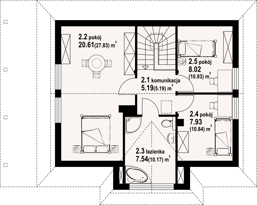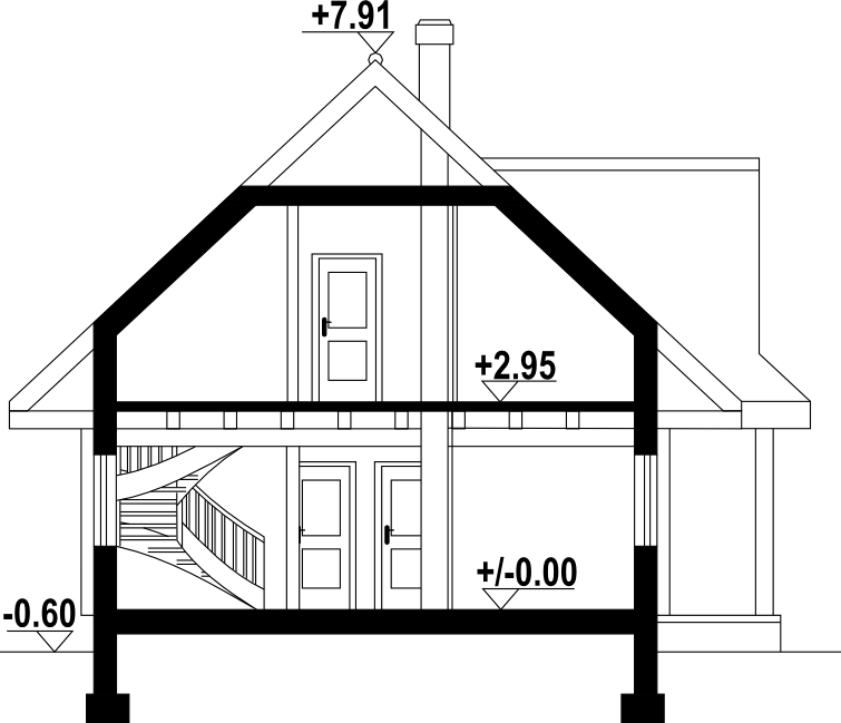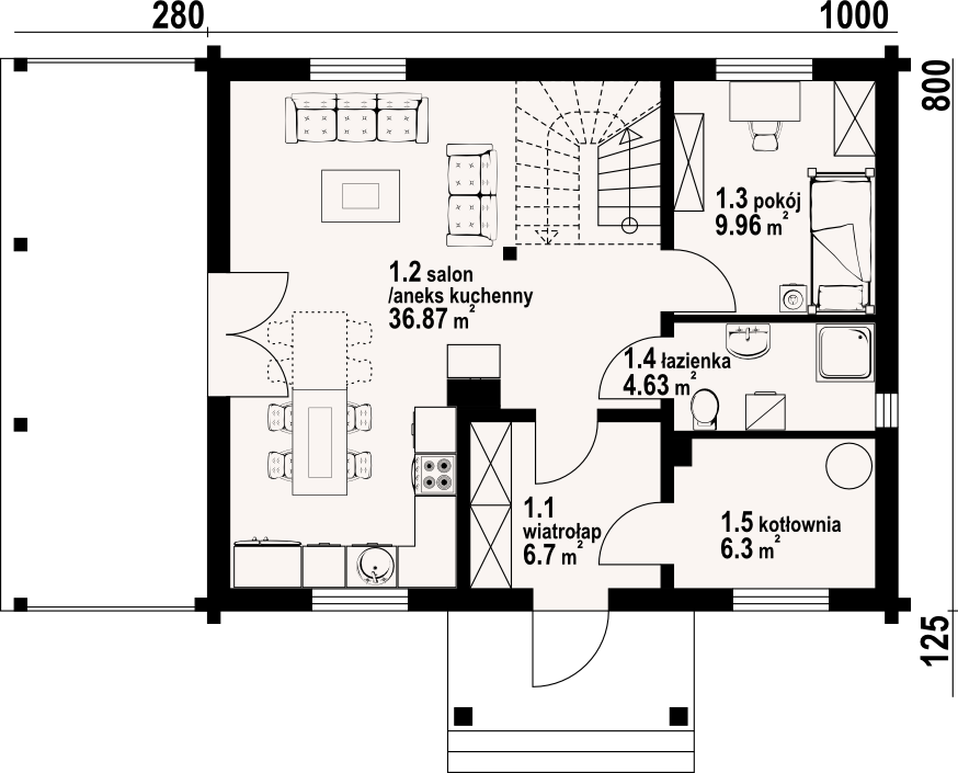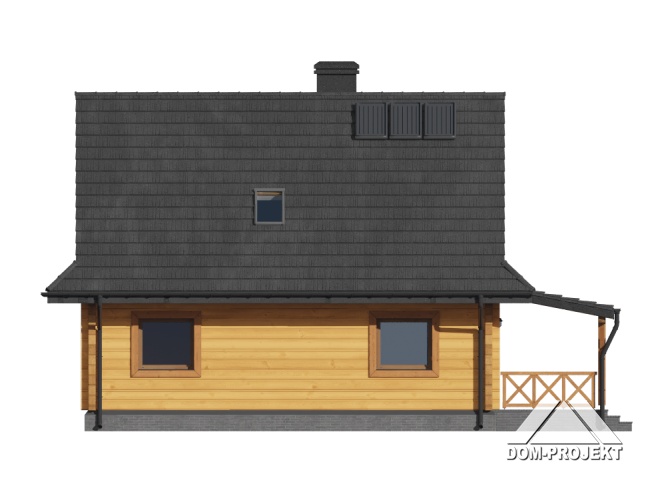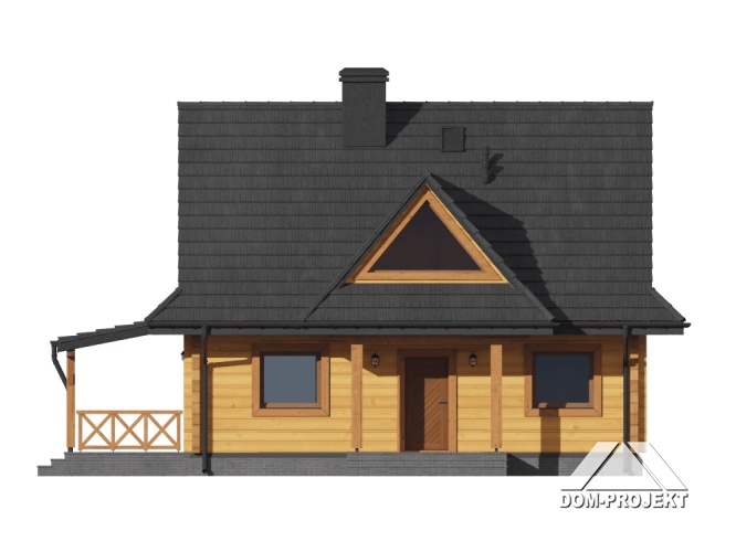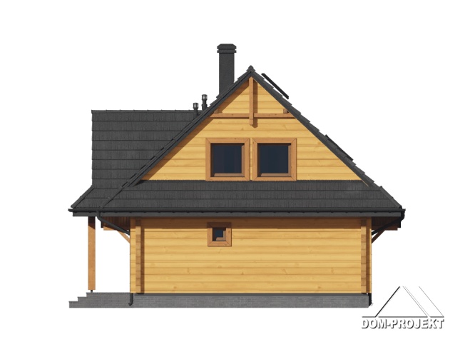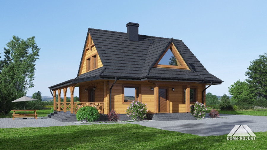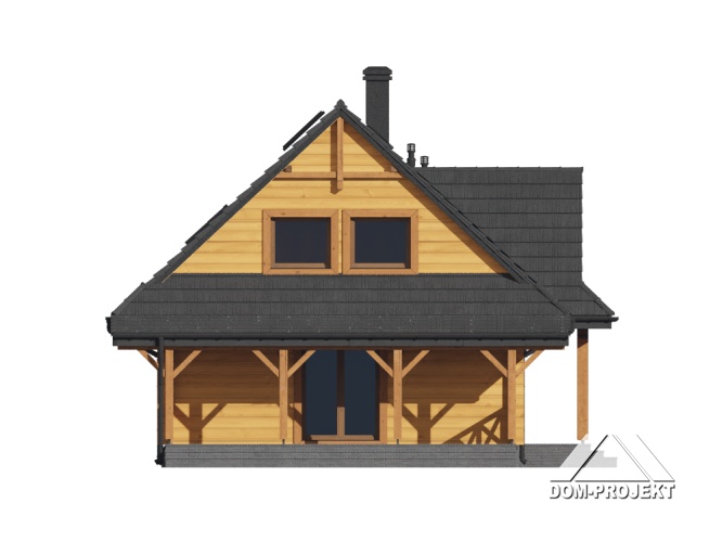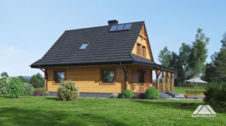 Dom z bali drewnianych. Na parterze duży salon z aneksem kuchennym, kominkiem oraz wyjściem na zadaszony taras i schodami na poddasze. Pokój, łazienka, kotłownia, wiatrołap. Na poddaszu trzy pokoje, łazienka i komunikacja. Zwarta bryła budynku oraz dach dwuspadowy sprzyjają szybkiej i taniej budowie oraz niskim kosztom eksploatacji.