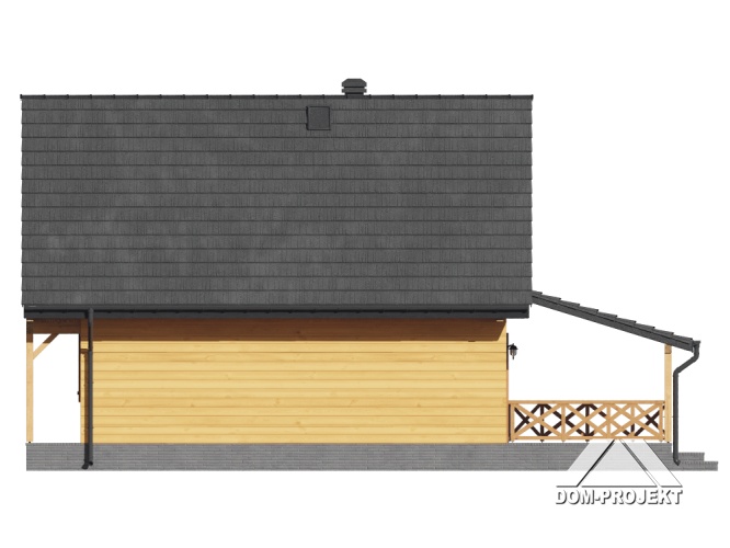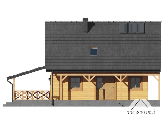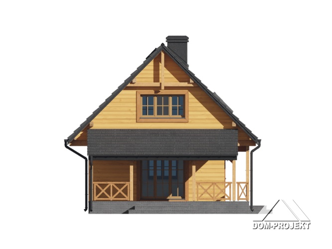 Dom w konstrukcji szkieletu drewnianego. Na parterze duży salon z aneksem kuchennym, kominkiem oraz wyjściem na duży, zadaszony taras. Pokój, łazienka, wiatrołap, schowek pod schodami. Na poddaszu dwa pokoje, garderoba, komunikacja oraz łazienka. Zwarta bryła budynku oraz dach dwuspadowy sprzyjają szybkiej i taniej budowie oraz niskim kosztom eksploatacji.