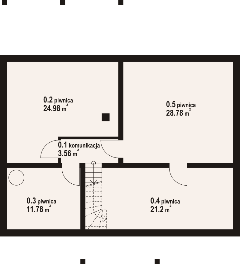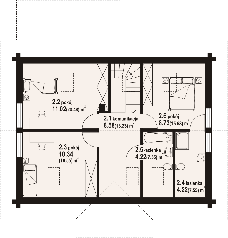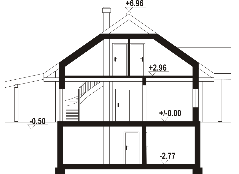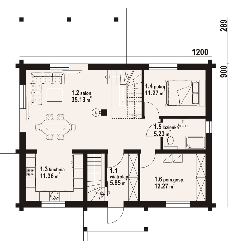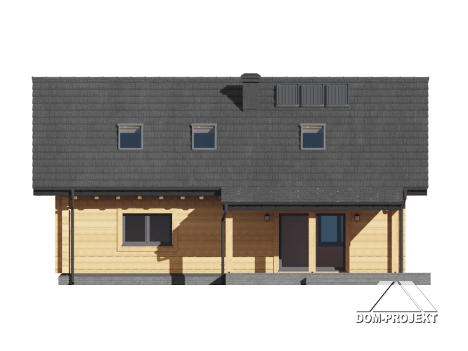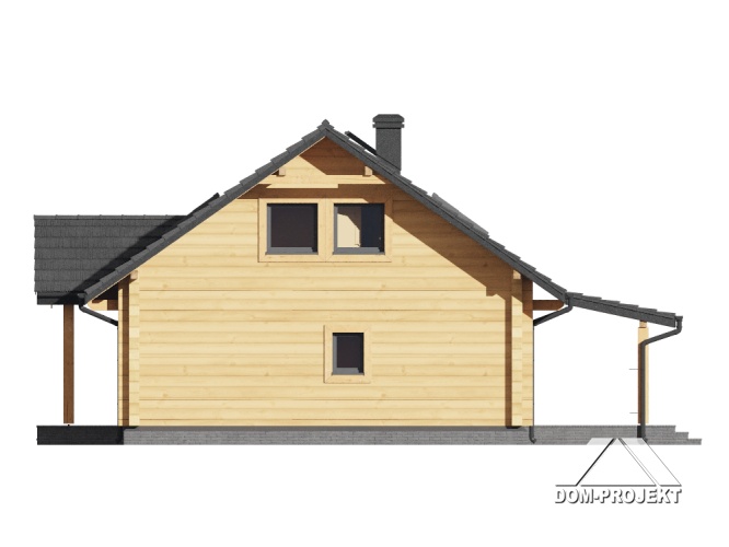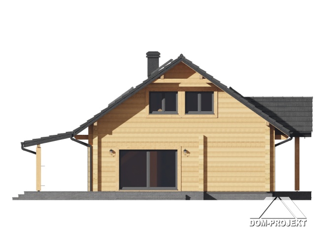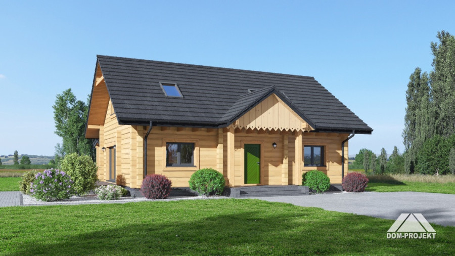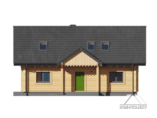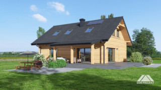 Dom drewniany z poddaszem użytkowym. Podpiwniczony. Na parterze salon z kuchnią, kominkiem oraz wyjściem na duży, zadaszony taras. Na poddaszu trzy pokoje, dwie łazienki, komunikacja. W podpiwniczeniu cztery piwnice oraz komunikacja. Zwarta bryła budynku i dach dwuspadowy sprzyjają szybkiej i taniej budowie oraz niskim kosztom eksploatacji.