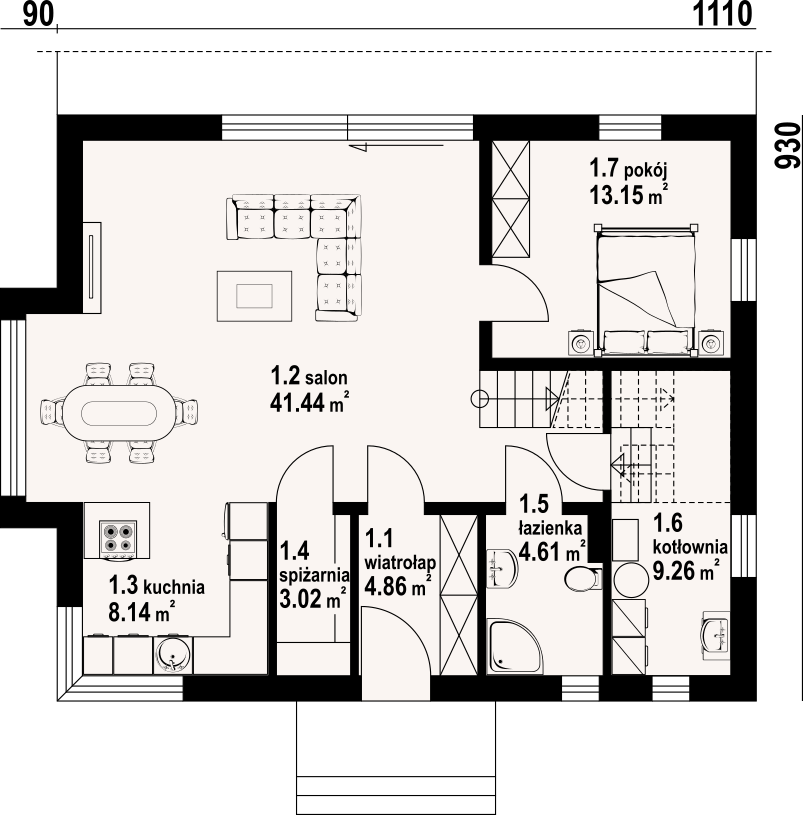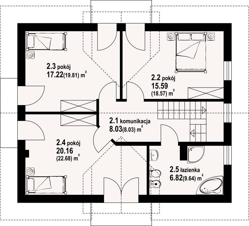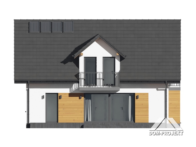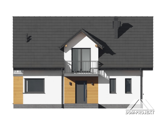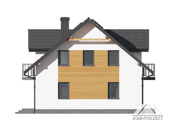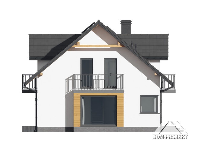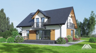 Dom z poddaszem użytkowym. Na parterze duży salon z aneksem kuchennym i wyjściem na taras. Pokój, łazienka, kotłownia, wiatrołap i spiżarnia. Na poddaszu trzy pokoje, łazienka, komunikacja, trzy balkony. Zwarta bryła budynku oraz dach dwuspadowy sprzyjają szybkiej i taniej budowie oraz niskim kosztom eksploatacji.