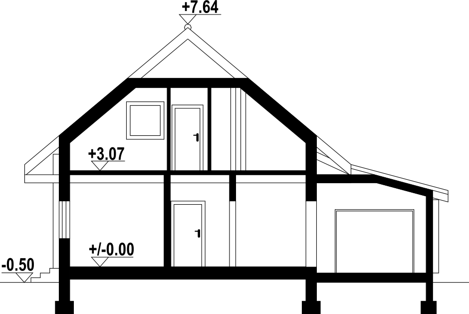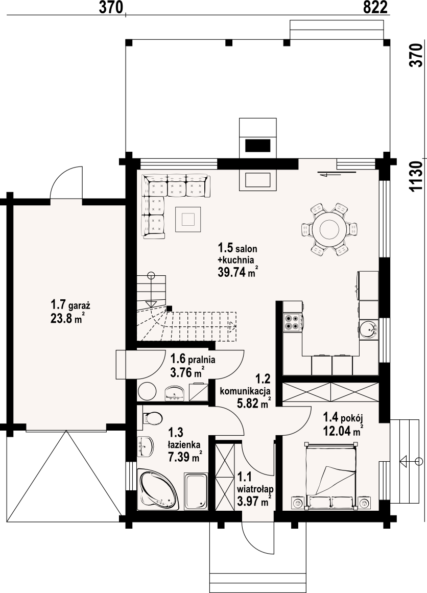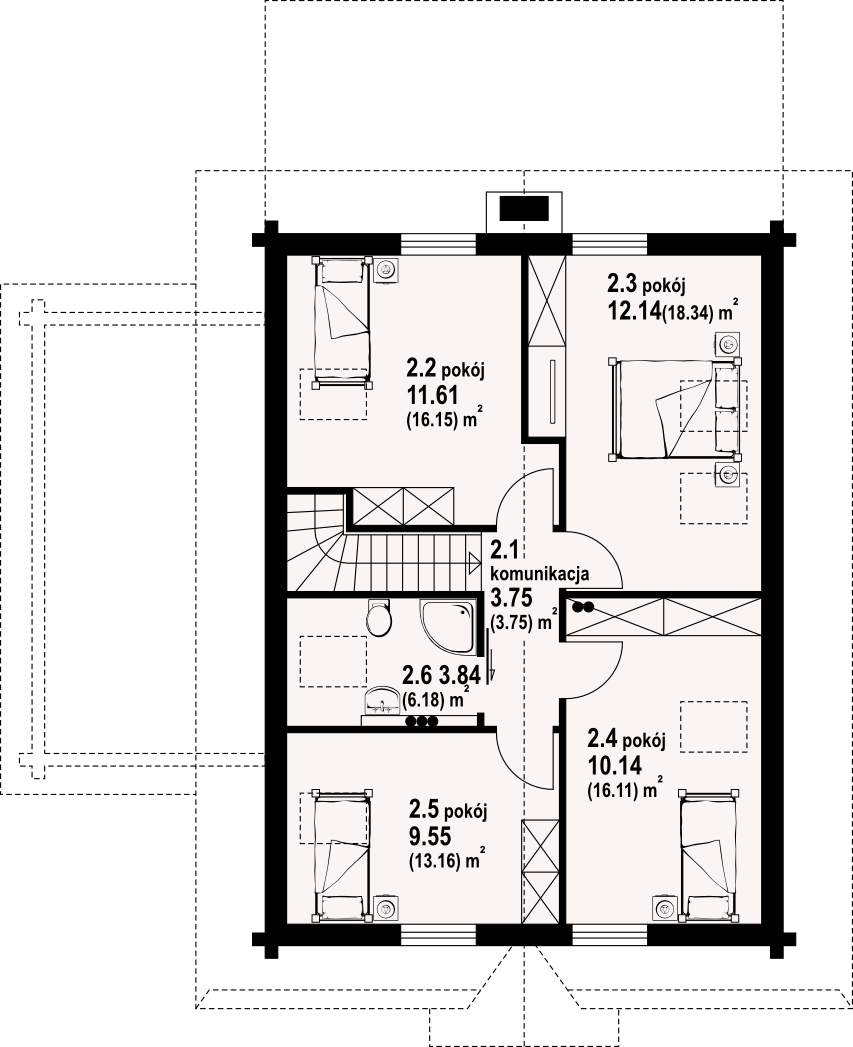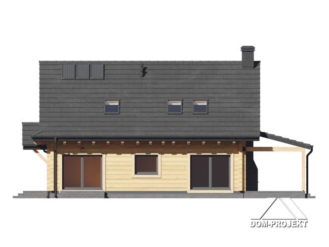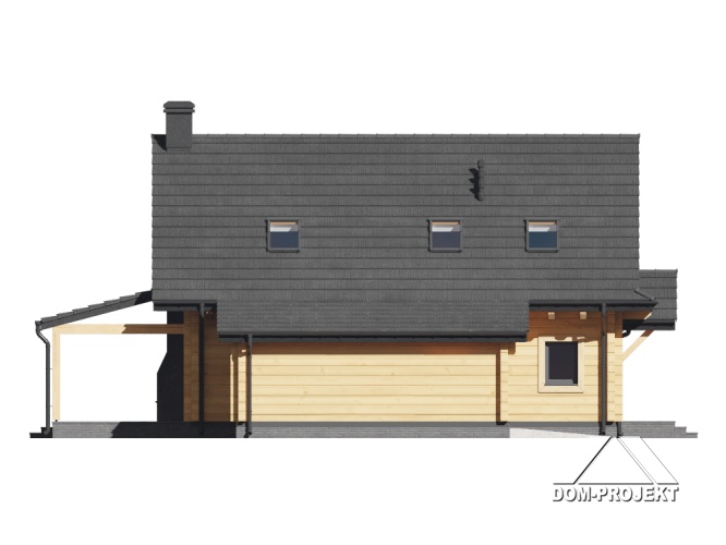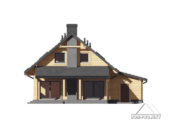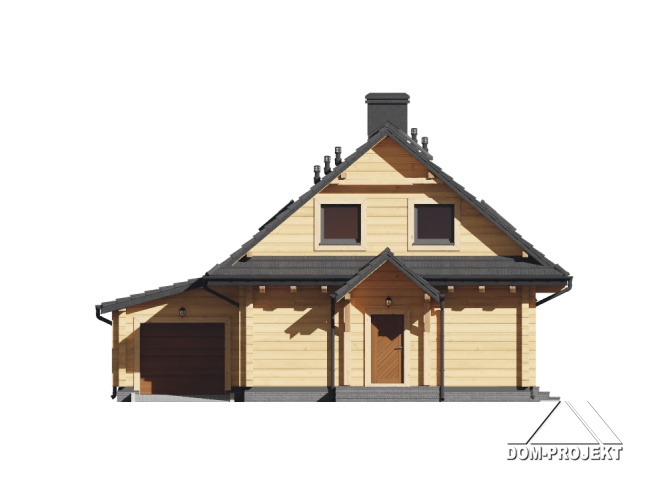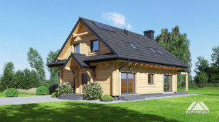 Dom z bali drewnianych. Na parterze duży salon z aneksem kuchennym, kominkiem oraz wyjściem na zadaszony taras. Pokój, łazienka, pralnia, wiatrołap, komunikacja oraz garaż. Na poddaszu cztery wygodne pokoje, łazienka, komunikacja. Zwarta bryła budynku i dach dwuspadowy sprzyjają szybkiej i taniej budowie oraz niskim kosztom eksploatacji.