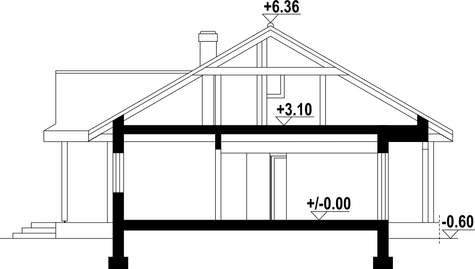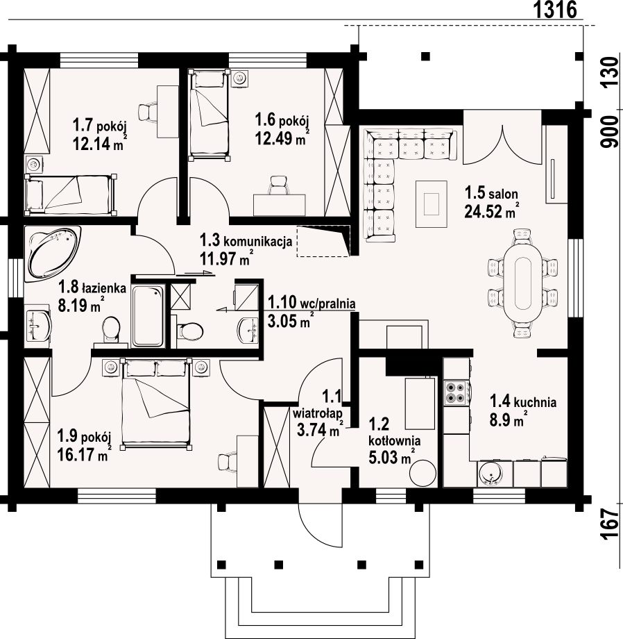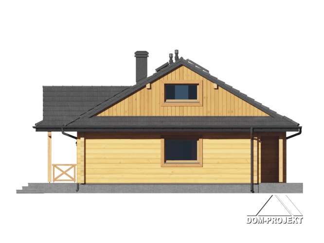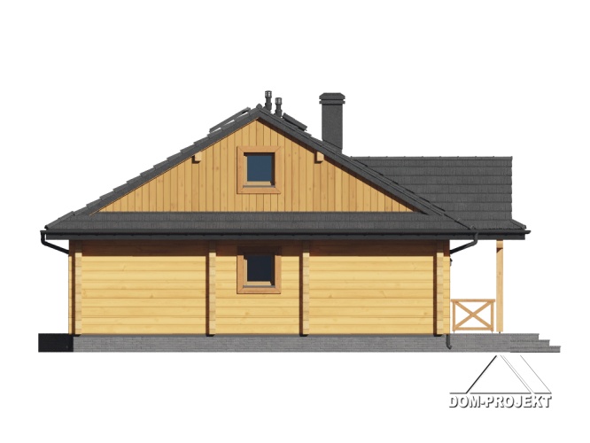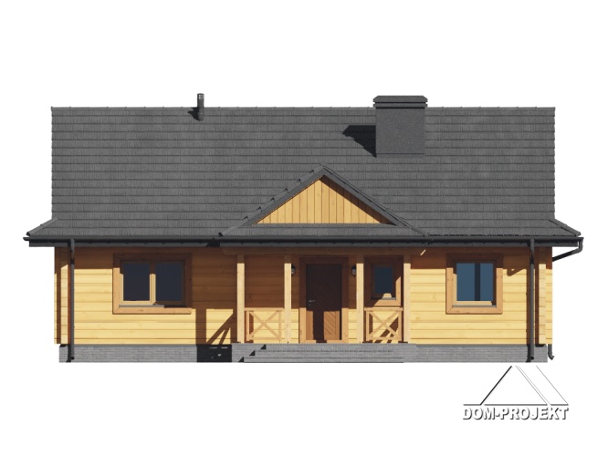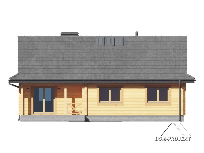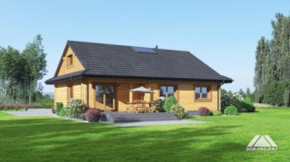 Parterowy dom z bali. Duży salon z kominkiem, wyjściem na częściowo zadaszony taras oraz przejściem do kuchni. Wygodna kuchnia. Trzy pokoje, łazienka, wc/pralnia, komunikacja, wiatrołap oraz kotłownia. Wyjście na poddasze schodami strychowymi rozkładanymi. Zwarta bryła budynku i dach dwuspadowy sprzyjają szybkiej i taniej budowie oraz niskim kosztom eksploatacji.