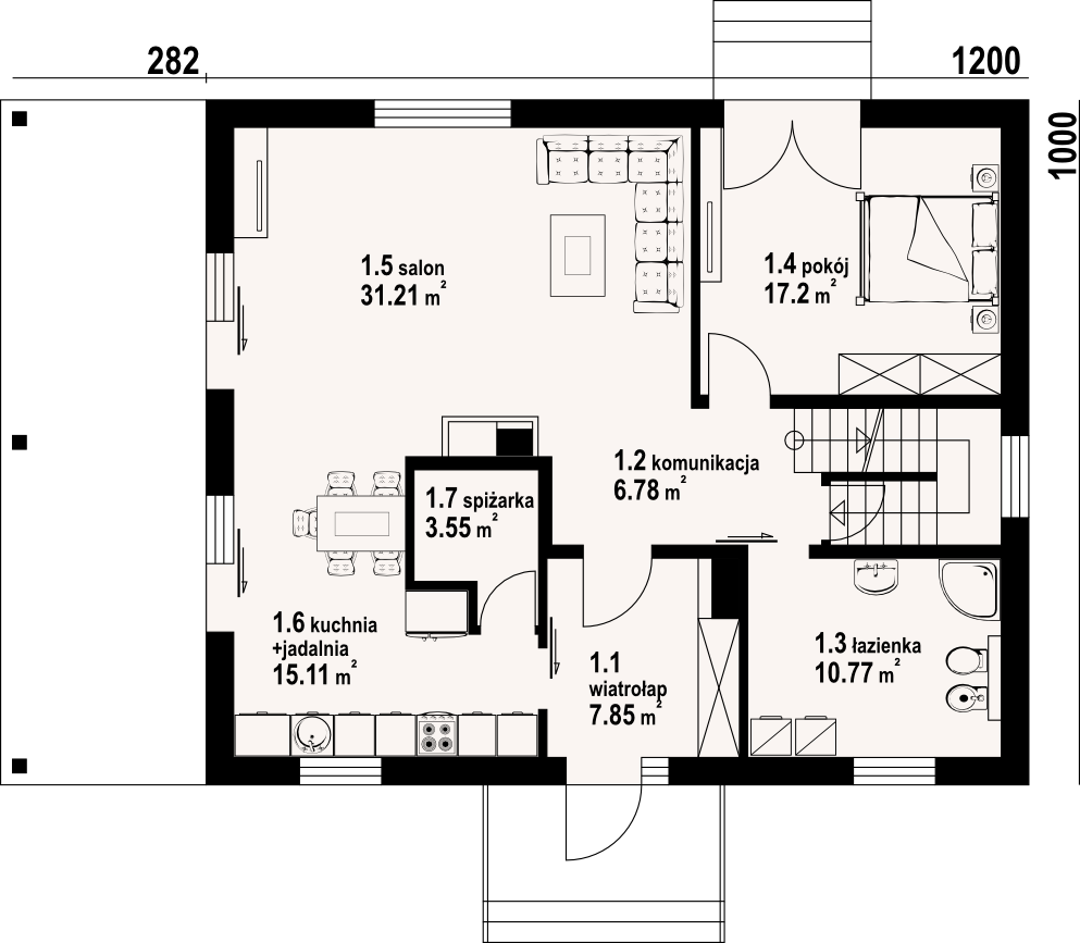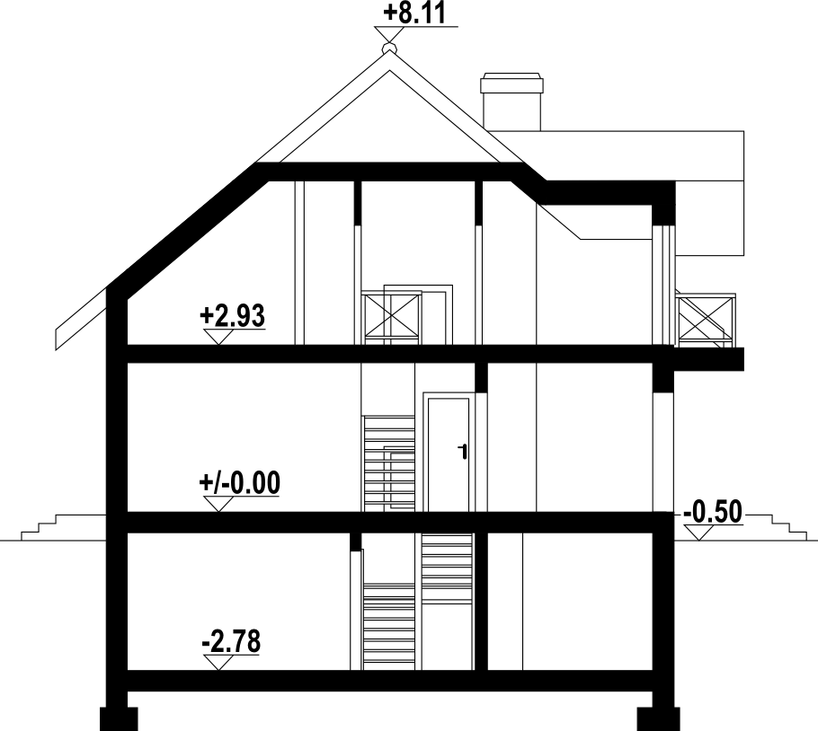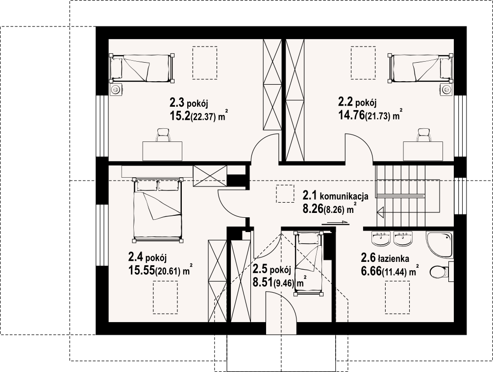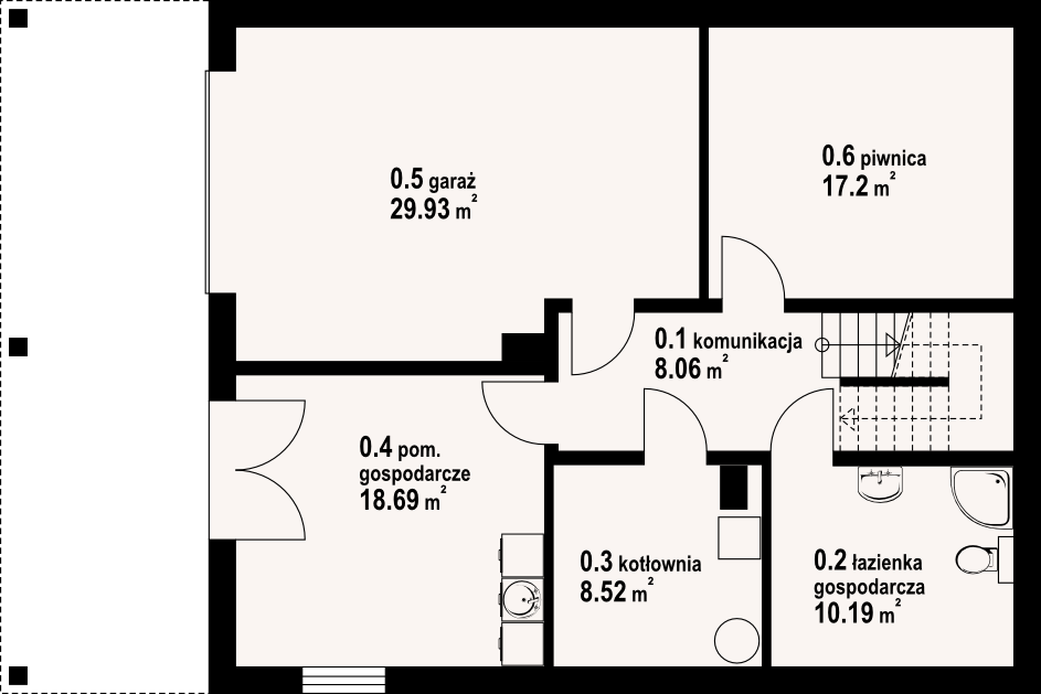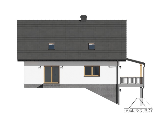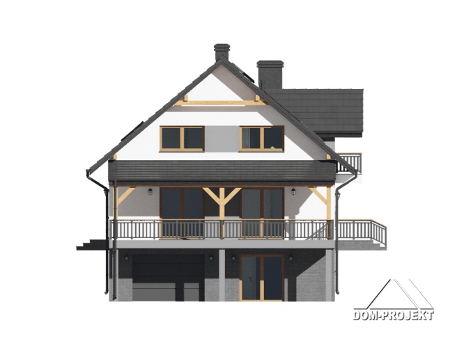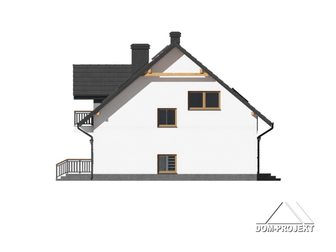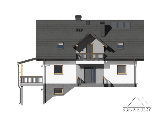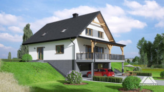 Dom z poddaszem użytkowym. Podpiwniczony. Na parterze duży salon z kominkiem oraz wyjściem na zadaszony taras. Kuchnia z jadalnią, spiżarka, pokój, łazienka, komunikacja, wiatrołap. Na poddaszu cztery pokoje, łazienka, komunikacja. W podpiwniczeniu garaż, pomieszczenie gospodarcze, piwnica, kotłownia, łazienka gospodarcza oraz komunikacja.