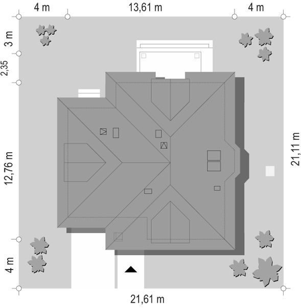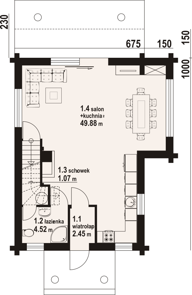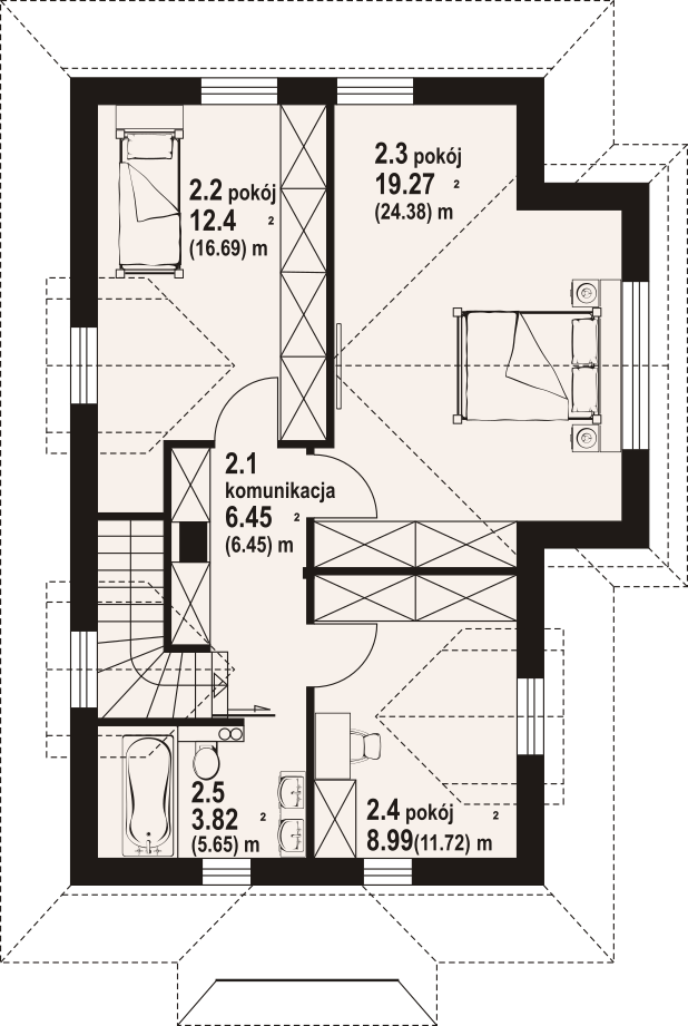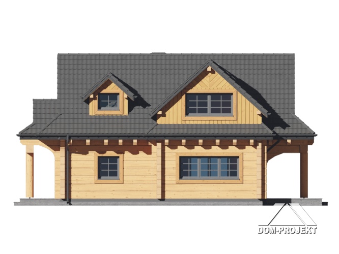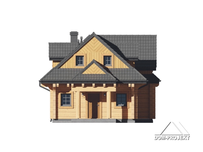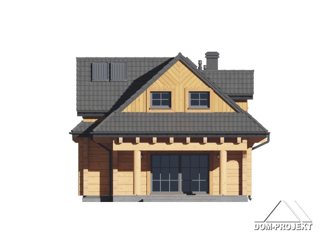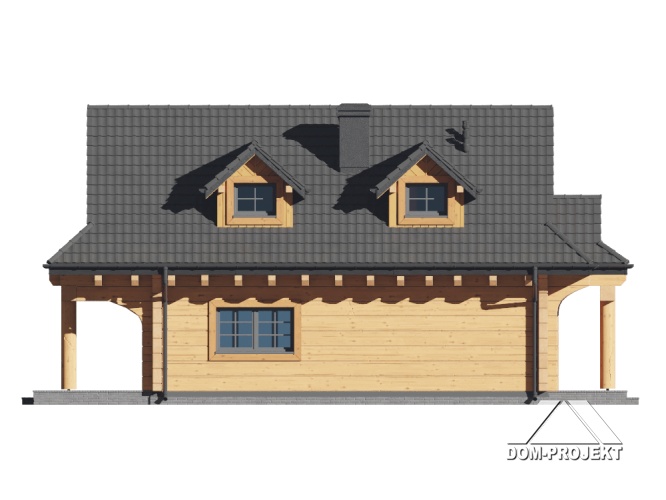 Dom z bali drewnianych. Na parterze duży salon z aneksem kuchennym, kominkiem oraz wyjściem na zadaszony taras. Łazienka, wiatrołap, schowek pod schodami. Na poddaszu trzy pokoje, łazienka, komunikacja. Zwarta bryła budynku oraz dach dwuspadowy sprzyjają szybkiej i taniej budowie oraz niskim kosztom eksploatacji.