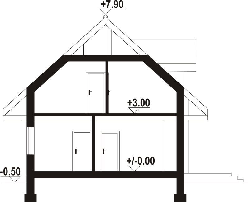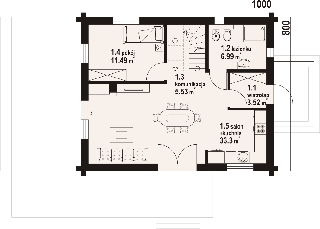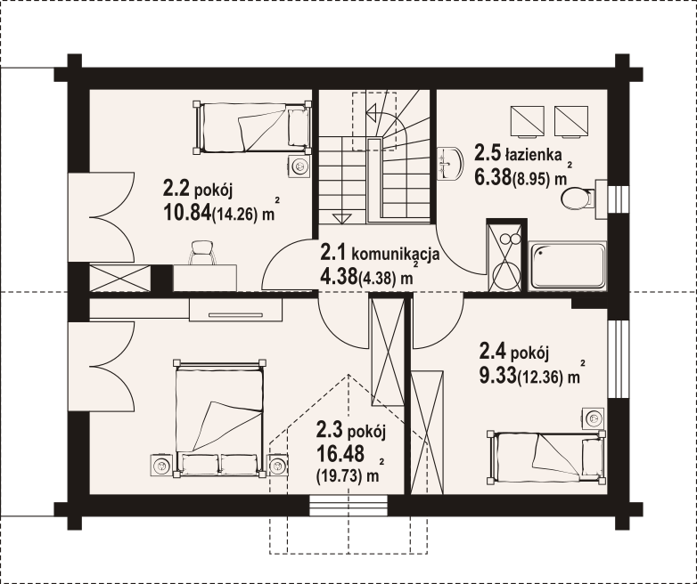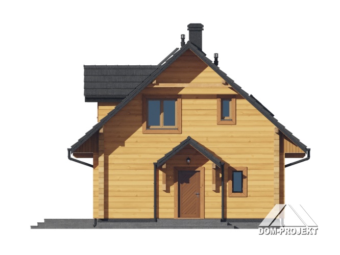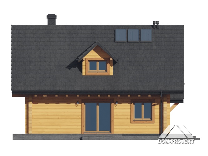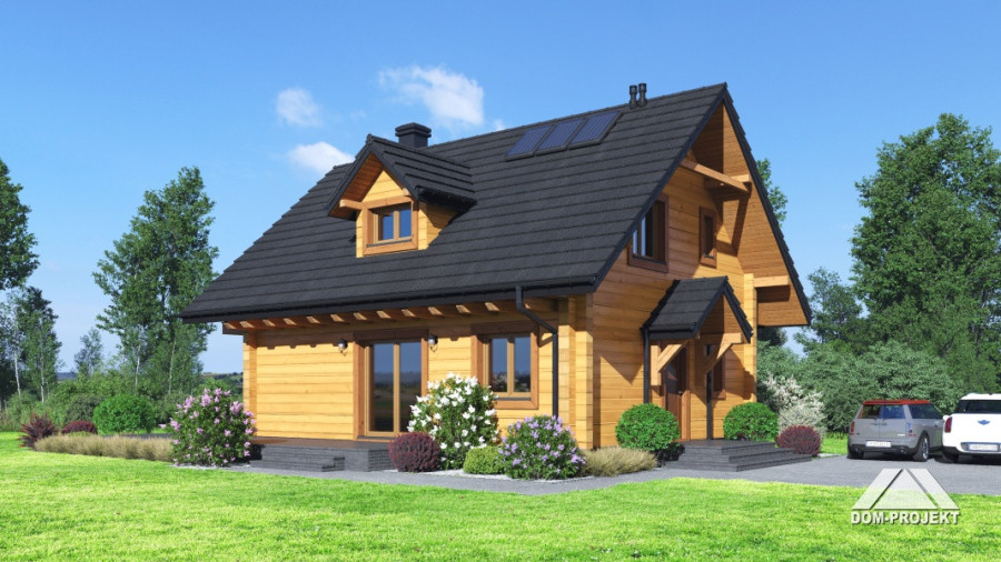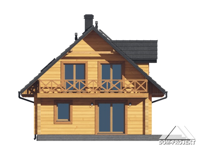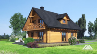 Dom z bali drewnianych. Na parterze duży salon z aneksem kuchennym, kominkiem oraz wyjściem na taras. Pokój, łazienka, komunikacja, wiatrołap. Na poddaszu trzy pokoje, łazienka, komunikacja oraz balkon dostępny z dwóch pokoi. Zwarta bryła budynku oraz dach dwuspadowy sprzyjają szybkiej i taniej budowie oraz niskim kosztom eksploatacji.