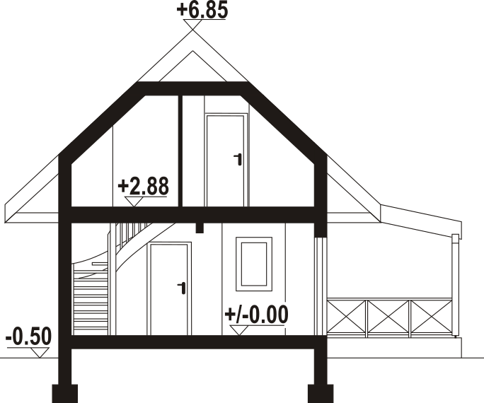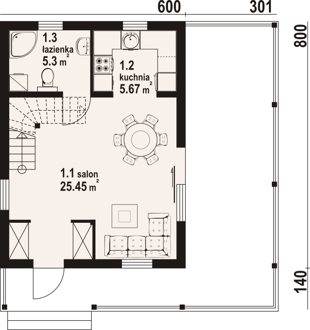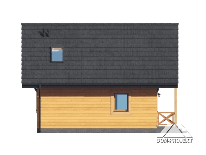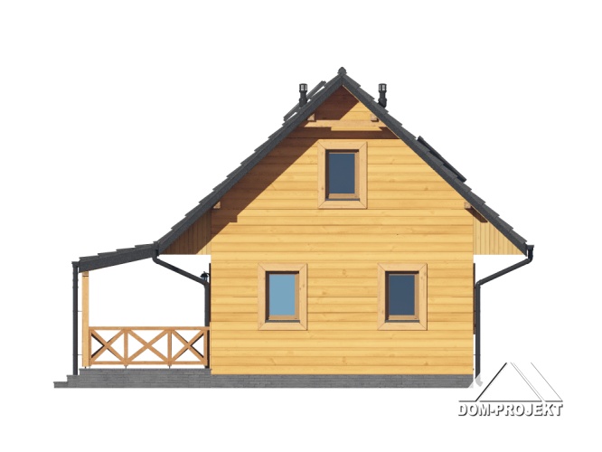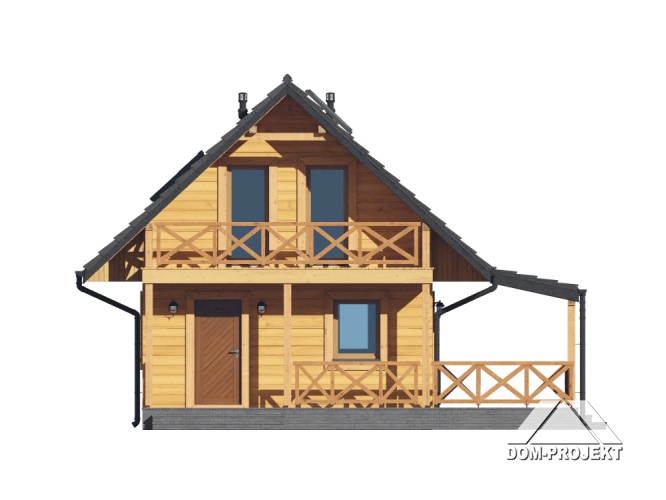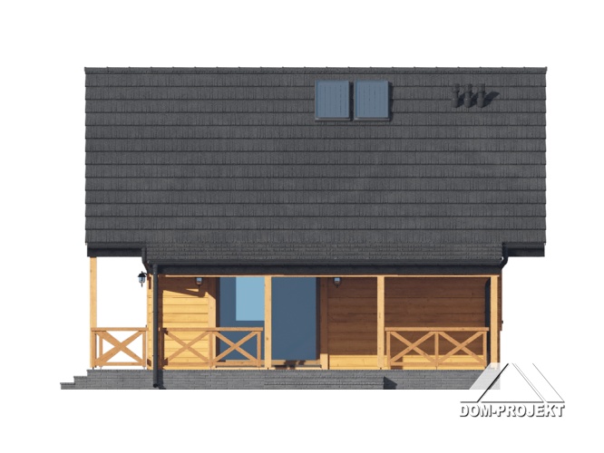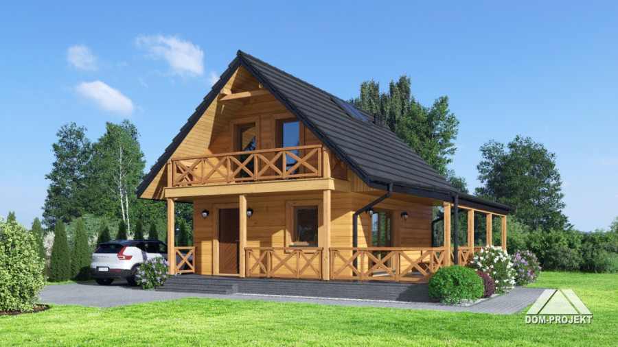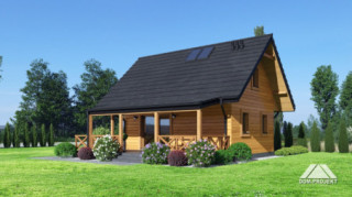 Dom w konstrukcji szkieletu drewnianego. Na parterze salon z kuchnią, schodami na poddasze, wyjściem na duży, zadaszony taras oraz łazienka. Na poddaszu dwa pokoje, łazienka, komunikacja, pomieszczenie gospodarcze oraz balkon dostępny z dwóch pokoi. Zwarta bryła budynku oraz dach dwuspadowy sprzyjają szybkiej i taniej budowie oraz niskim kosztom eksploatacji.