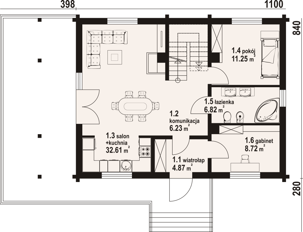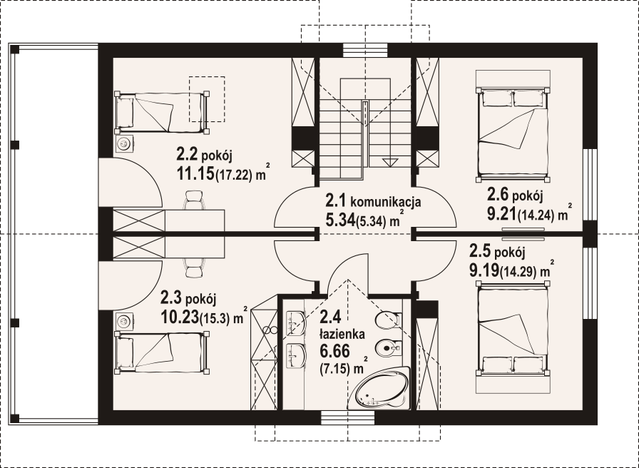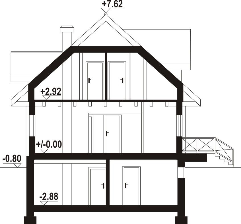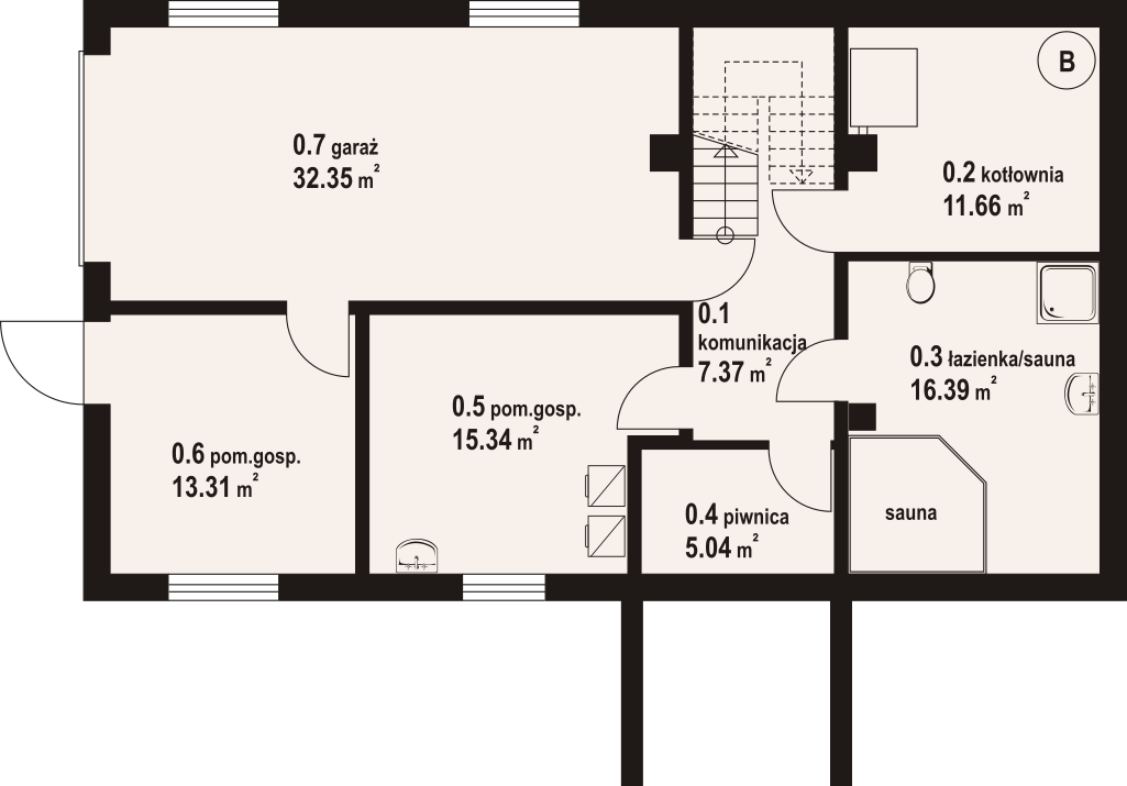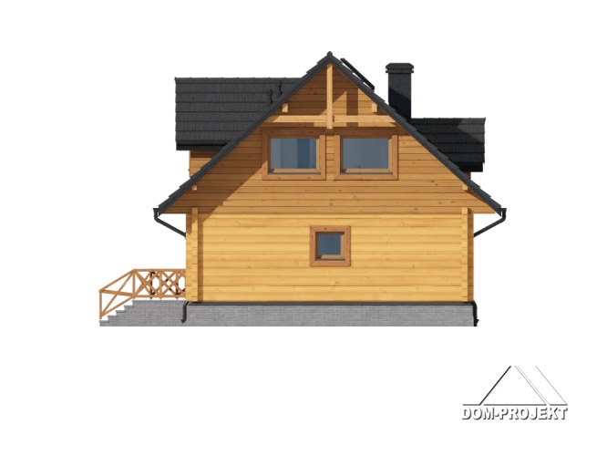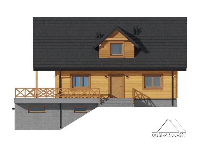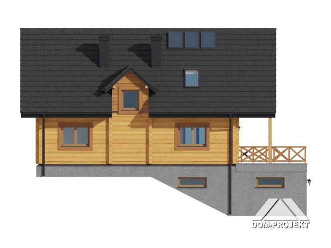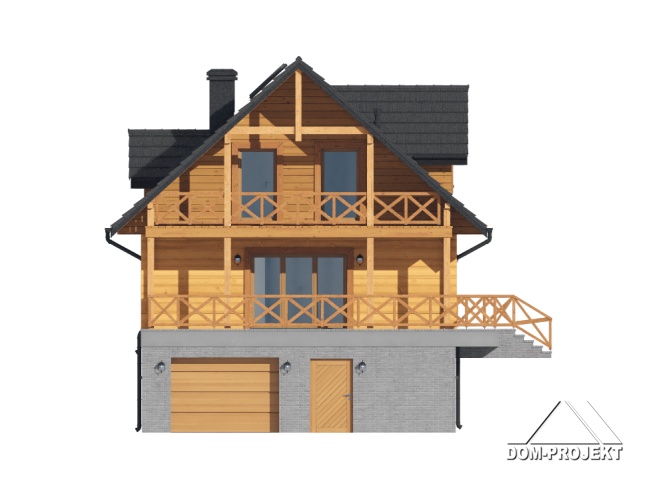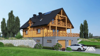 Dom z bali z poddaszem użytkowym. Podpiwniczony. Na parterze salon z aneksem kuchennym, kominkiem oraz wyjściem na duży taras. Komunikacja, pokój, łazienka, gabinet, wiatrołap. Na poddaszu cztery pokoje, łazienka, komunikacja. Duży balkon dostępny z dwóch pokoi. W podpiwniczeniu garaż, dwa pomieszczenia gospodarcze, piwnica, komunikacja, kotłownia oraz łazienka z sauną. Zwarta bryła budynku oraz dach dwuspadowy sprzyjają szybkiej i taniej budowie oraz niskim kosztom eksploatacji.