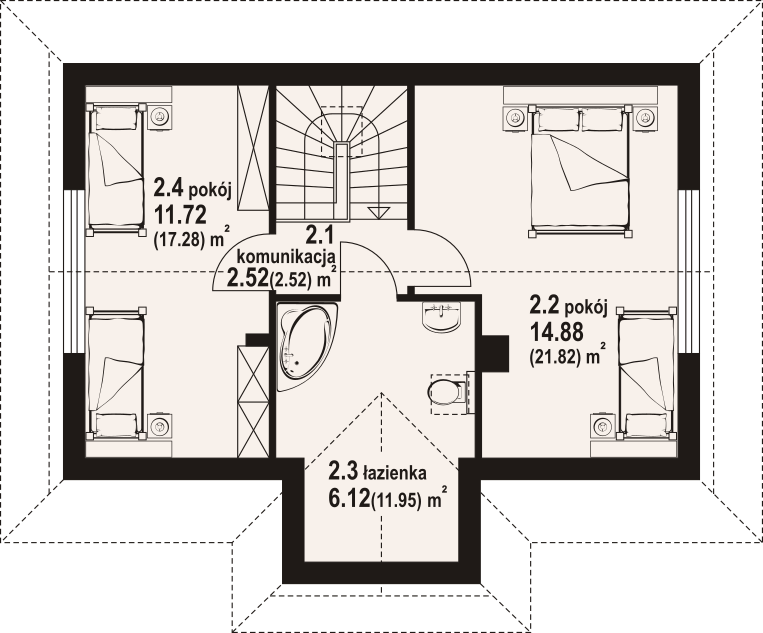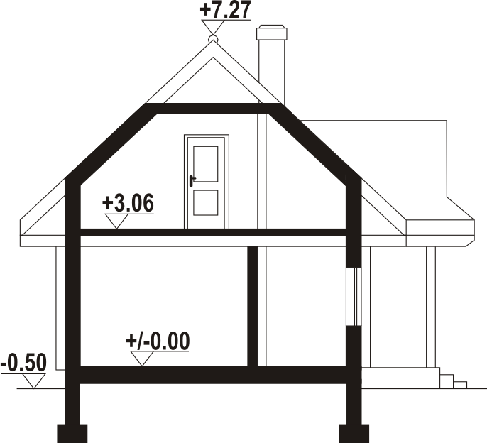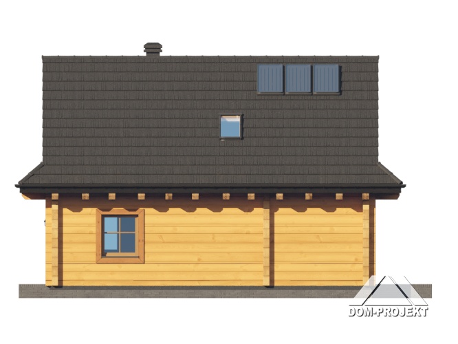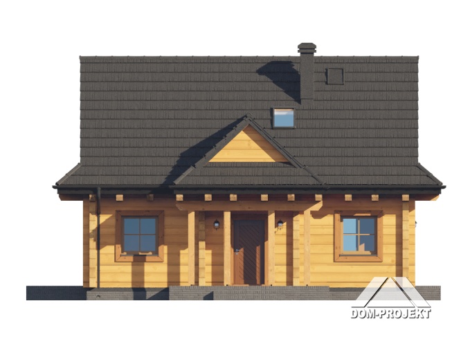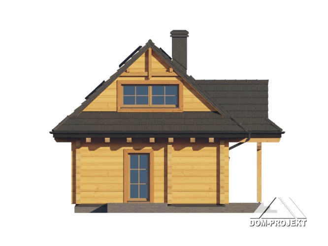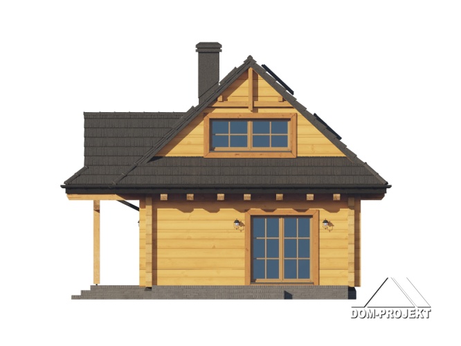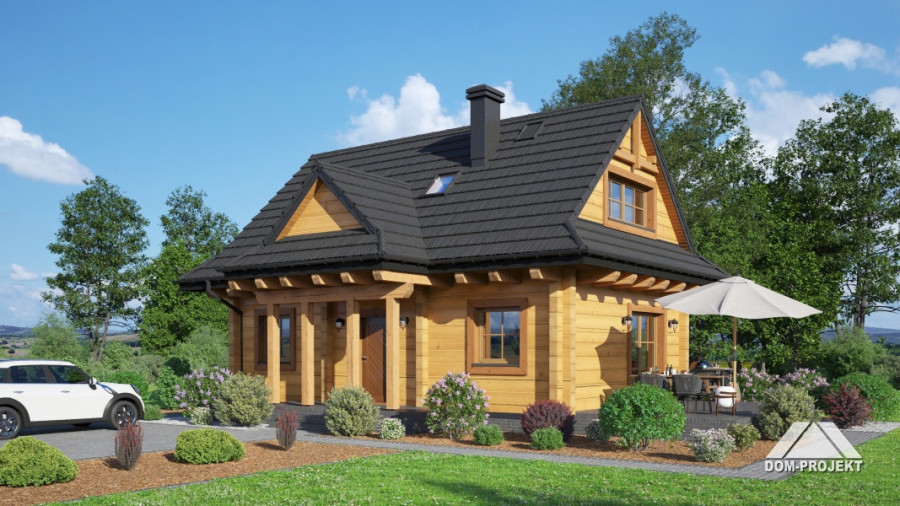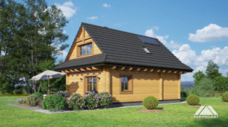 Dom z bali drewnianych. Na parterze salon z aneksem kuchennym, kominkiem oraz wyjściem na taras. Łazienka, wiatrołap i pomieszczenie gospodarcze. Na poddaszu dwa pokoje, łazienka, komunikacja. Zwarta bryła budynku oraz dach dwuspadowy sprzyjają szybkiej i taniej budowie oraz niskim kosztom eksploatacji.
