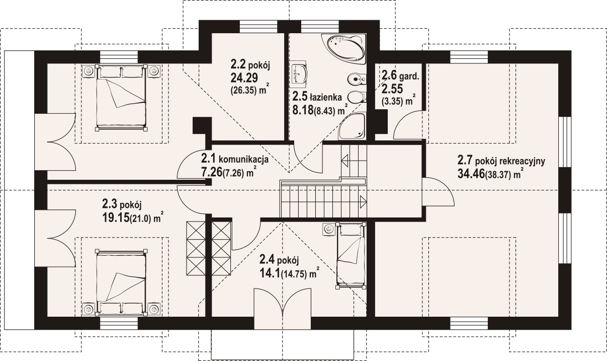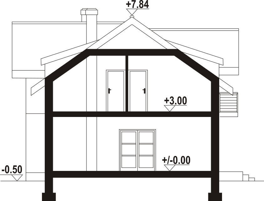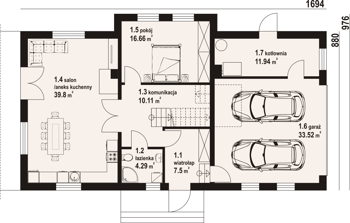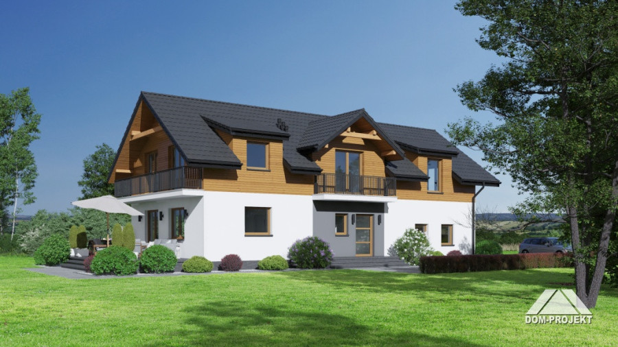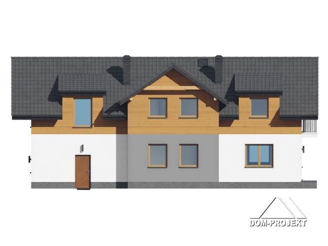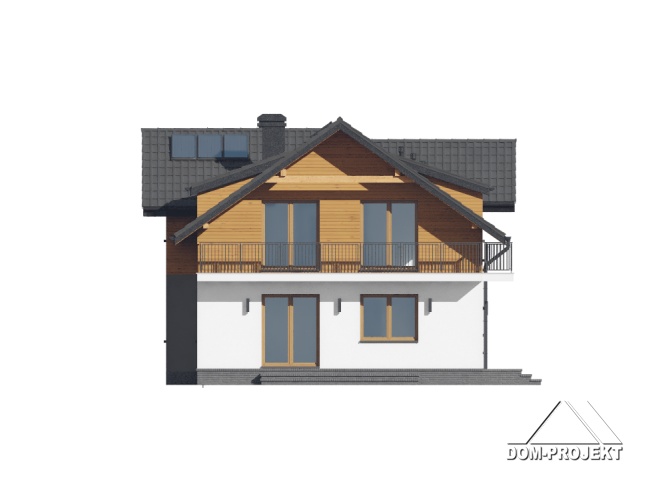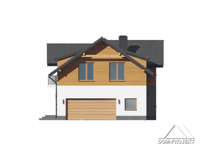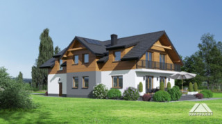 Dom z poddaszem użytkowym. Na parterze duży salon z aneksem kuchennym, kominkiem oraz wyjściem na taras. Pokój, komunikacja, łazienka, wiatrołap, kotłownia oraz garaż na dwa samochody. Na poddaszu cztery pokoje, garderoba, łazienka i komunikacja. Zwarta bryła budynku oraz dach dwuspadowy sprzyjają szybkiej i taniej budowie oraz niskim kosztom eksploatacji.