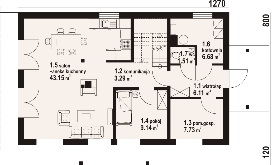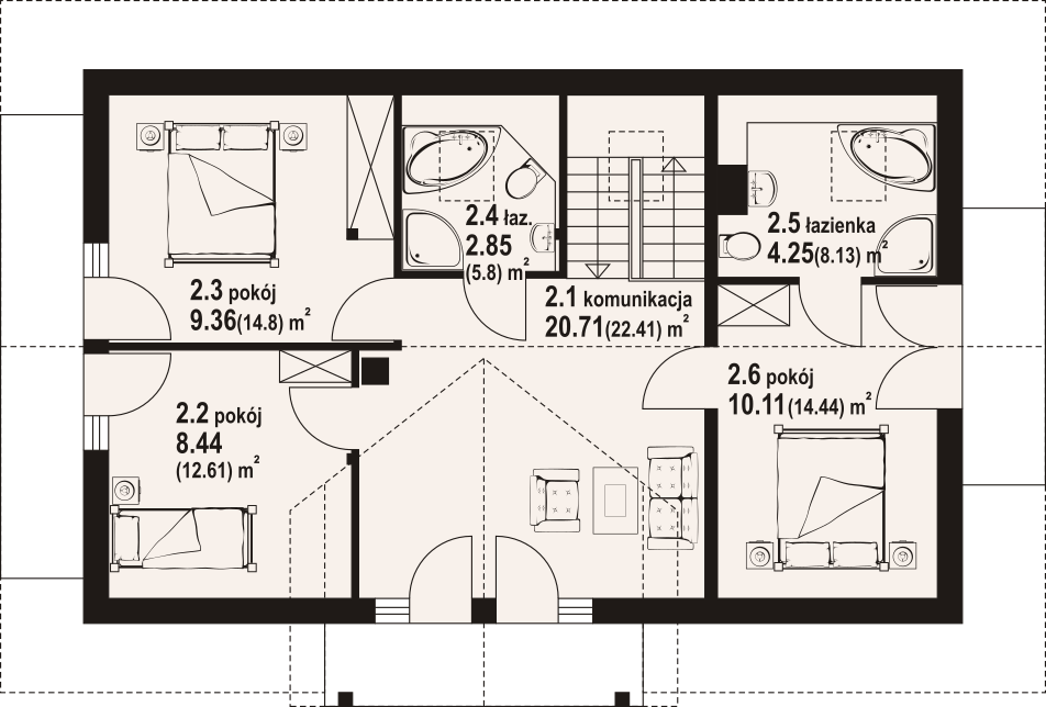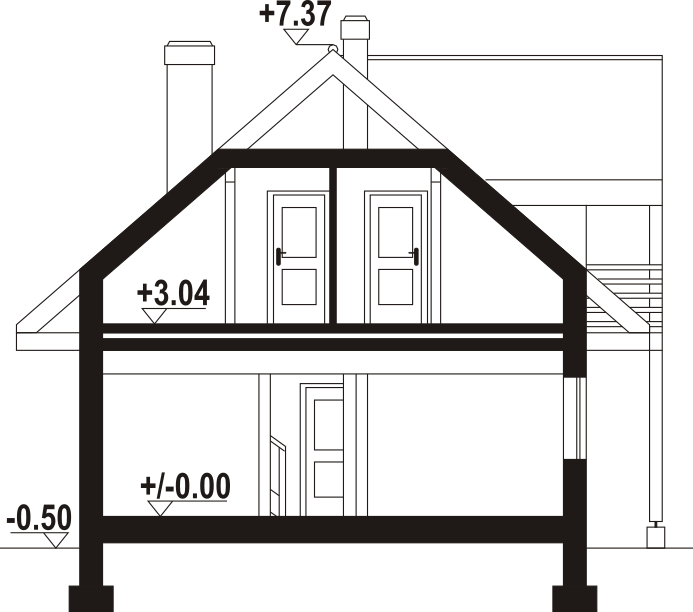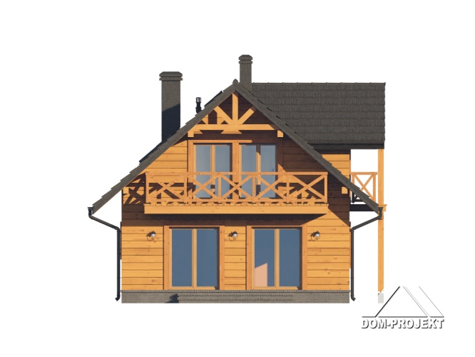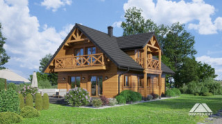 Dom w konstrukcji szkieletu drewnianego. Na parterze duży salon z aneksem kuchennym, kominkiem oraz wyjściem na taras. Pokój, pomieszczenie gospodarcze, komunikacja, wiatrołap, wc, kotłownia. Na poddaszu trzy pokoje, dwie łazienki, duża komunikacja, trzy balkony. Zwarta bryła budynku oraz dach dwuspadowy sprzyjają szybkiej i taniej budowie oraz niskim kosztom eksploatacji.