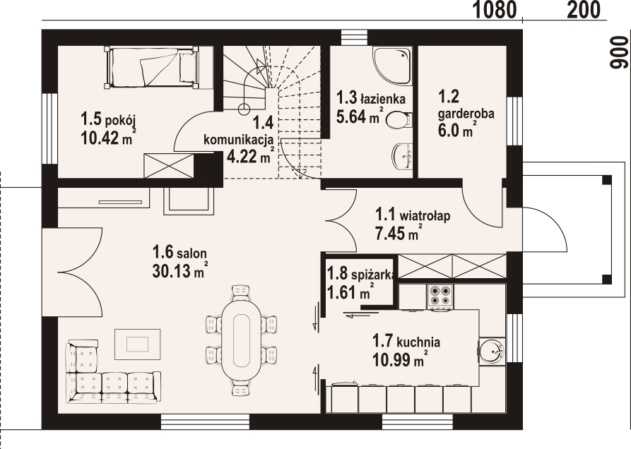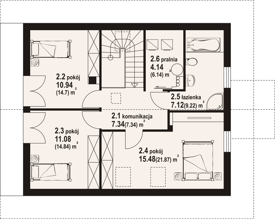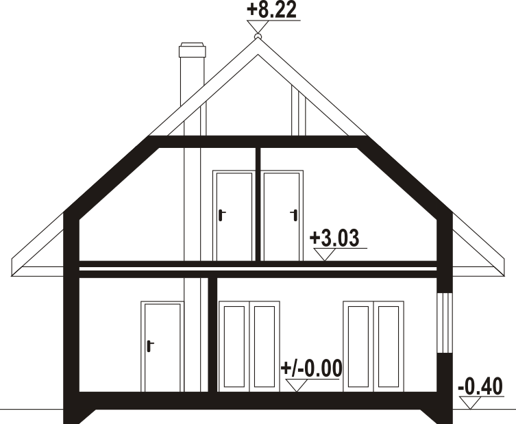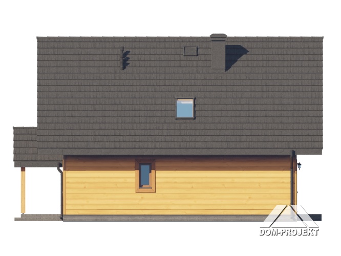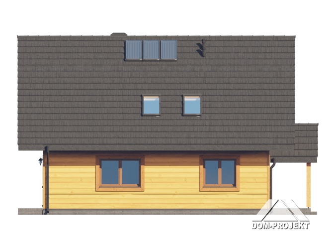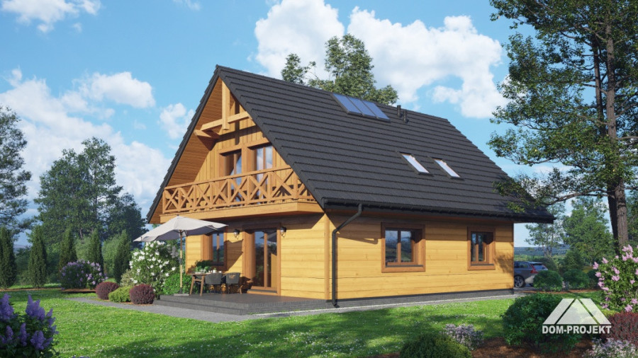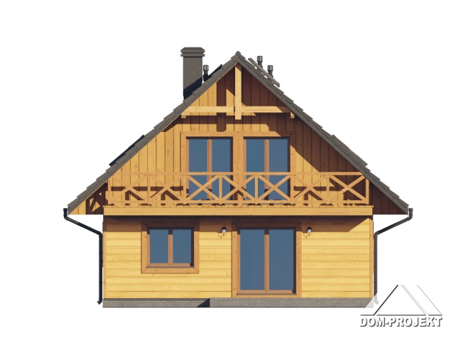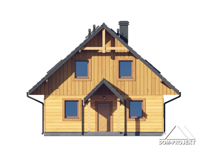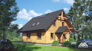 Dom w konstrukcji szkieletu drewnianego. Na parterze duży salon z kominkiem, wyjściem na taras oraz przejściem do kuchni. Spiżarka. Pokój, łazienka, komunikacja, garderoba, wiatrołap. Na poddaszu trzy pokoje, łazienka, pralnia, komunikacja oraz balkon dostępny z dwóch pokoi. Zwarta bryła budynku oraz dach dwuspadowy sprzyjają szybkiej i taniej budowie oraz niskim kosztom eksploatacji.