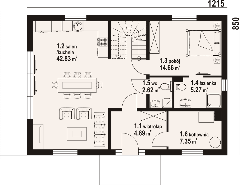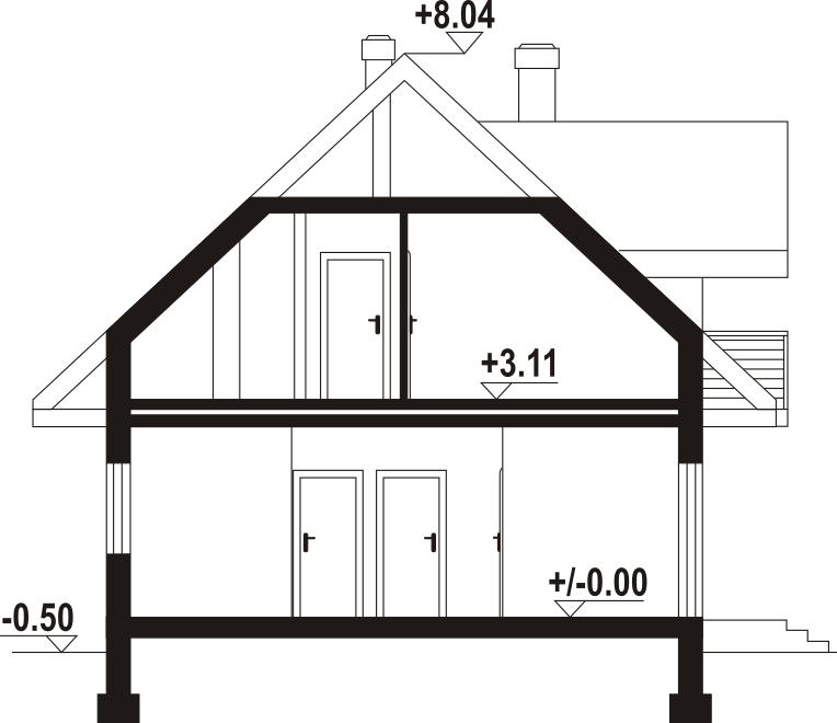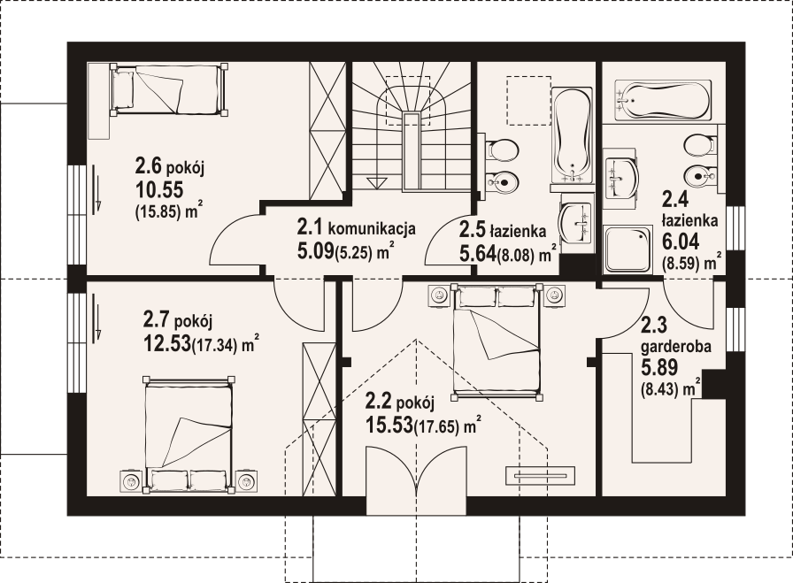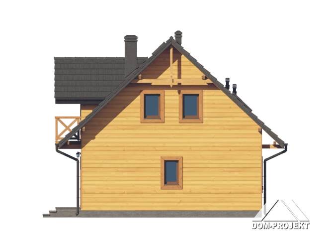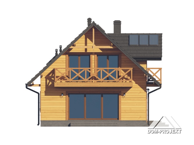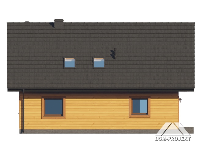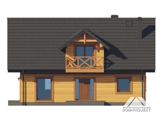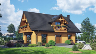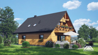 Dom w konstrukcji szkieletu drewnianego. Na parterze salon z aneksem kuchennym oraz wyjściem na taras. Pokój z własną łazienką, wc, wiatrołap, kotłownia. Na poddaszu trzy pokoje, dwie łazienki, garderoba, komunikacja, dwa balkony. Zwarta bryła budynku oraz dach dwuspadowy sprzyjają szybkiej i taniej budowie oraz niskim kosztom eksploatacji.