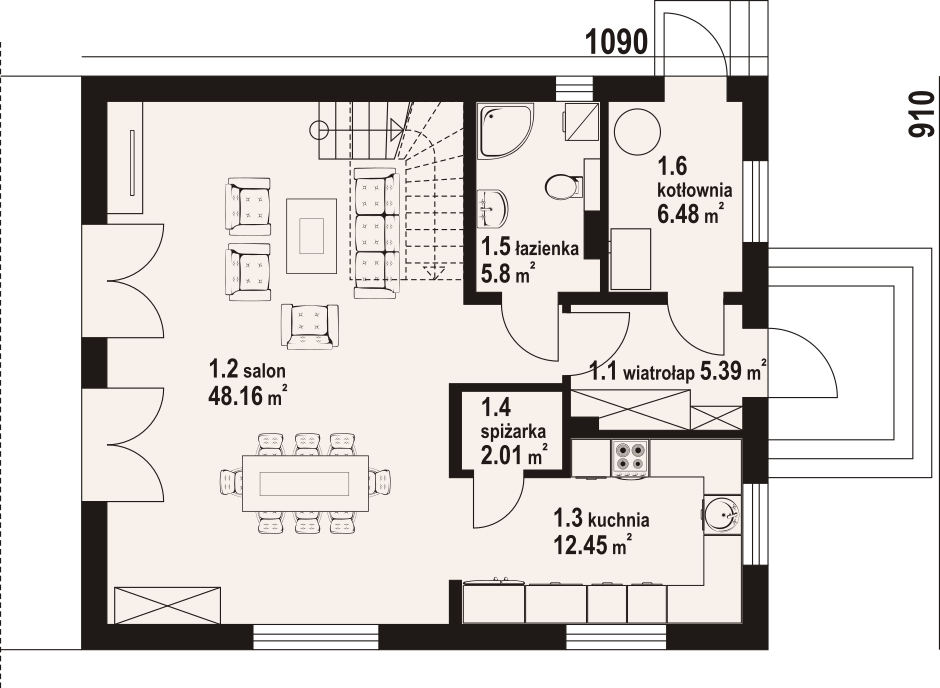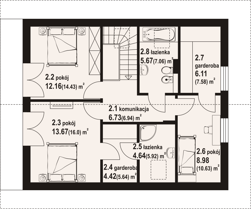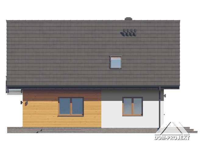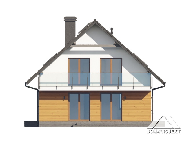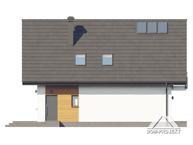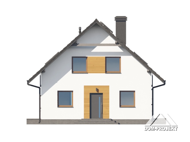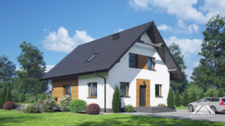 Dom z poddaszem użytkowym. Na parterze duży salon z wyjściem na taras oraz schodami na poddasze. Kuchnia, spiżarka, łazienka, kotłownia, wiatrołap. Na poddaszu trzy pokoje, dwa z nich z własną garderobą, dwie łazienki, komunikacja. Balkon dostępny z dwóch pokoi. Zwarta bryła budynku oraz dach dwuspadowy sprzyjają szybkiej i taniej budowie oraz niskim kosztom eksploatacji.