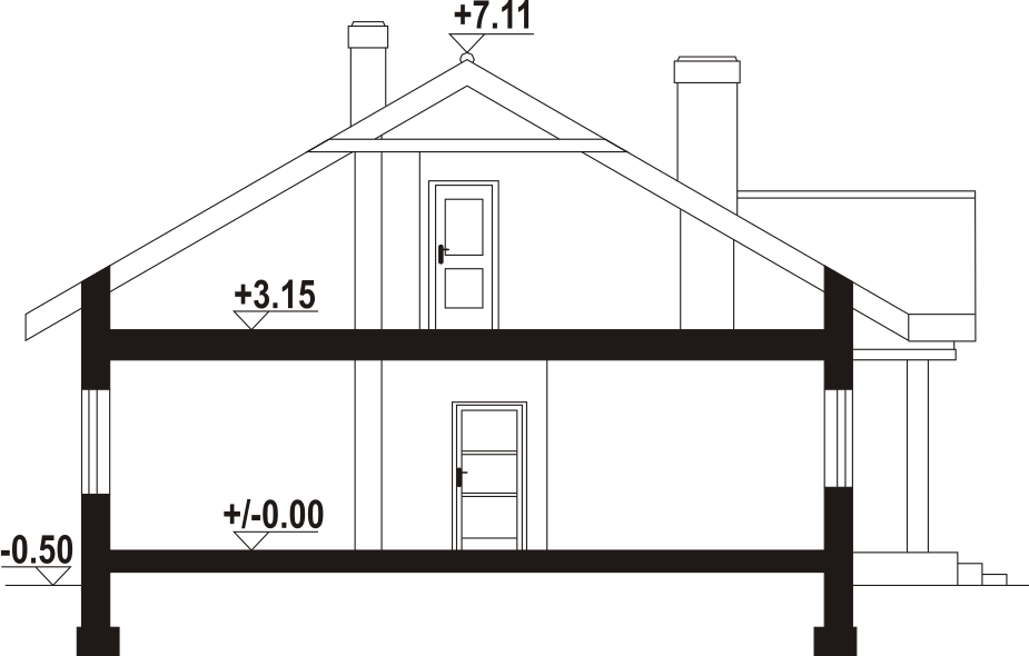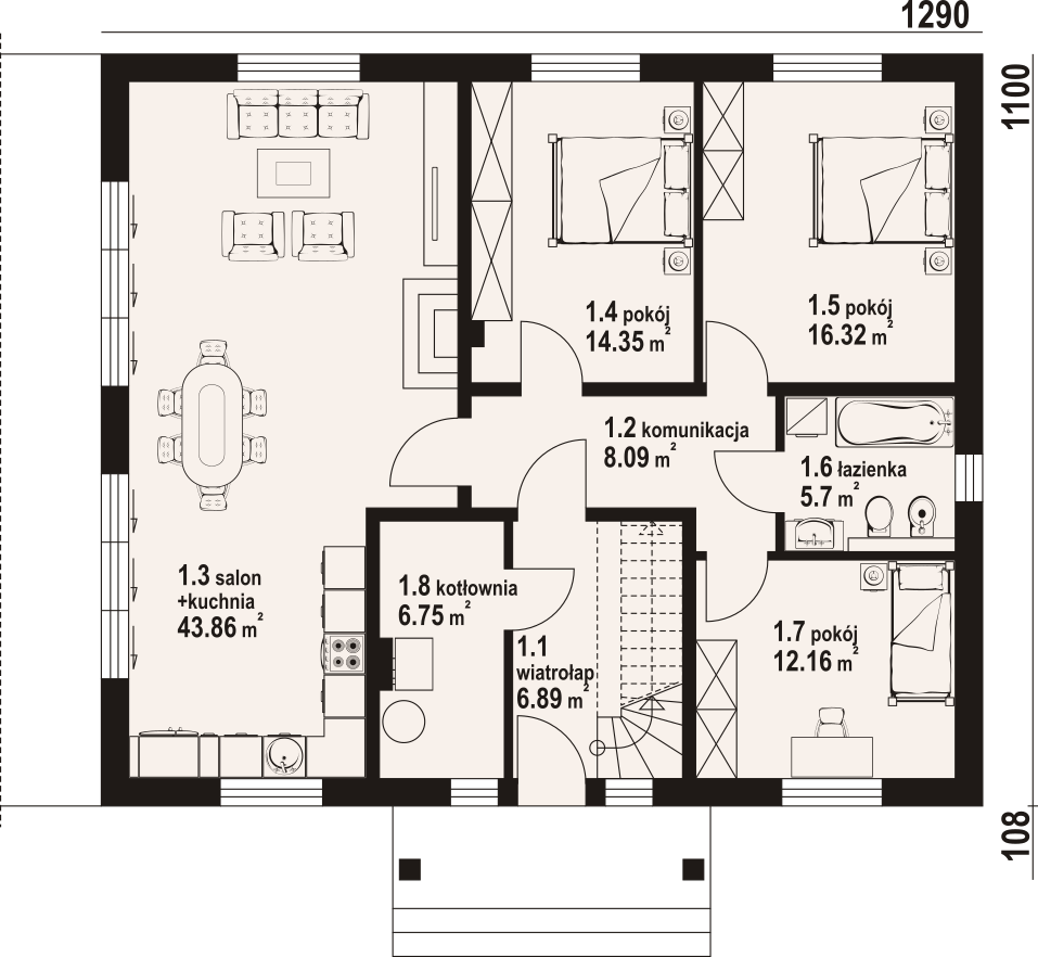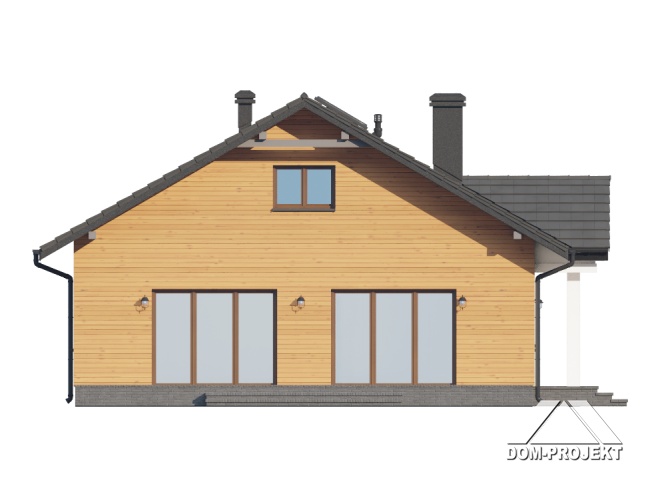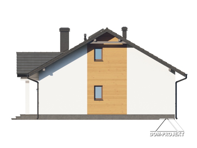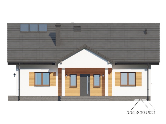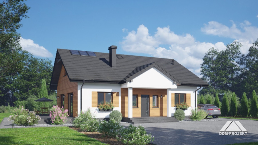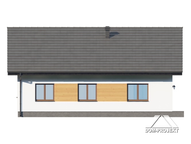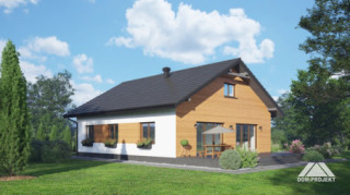 Wygodny dom parterowy. Duży salon z aneksem kuchennym, kominkiem oraz wyjściem na taras. Trzy pokoje, łazienka, komunikacja, kotłownia, wiatrołap. W wiatrołapie schody na poddasze. Na poddaszu strych. Zwarta bryła budynku oraz dach dwuspadowy sprzyjają szybkiej i taniej budowie oraz niskim kosztom eksploatacji.