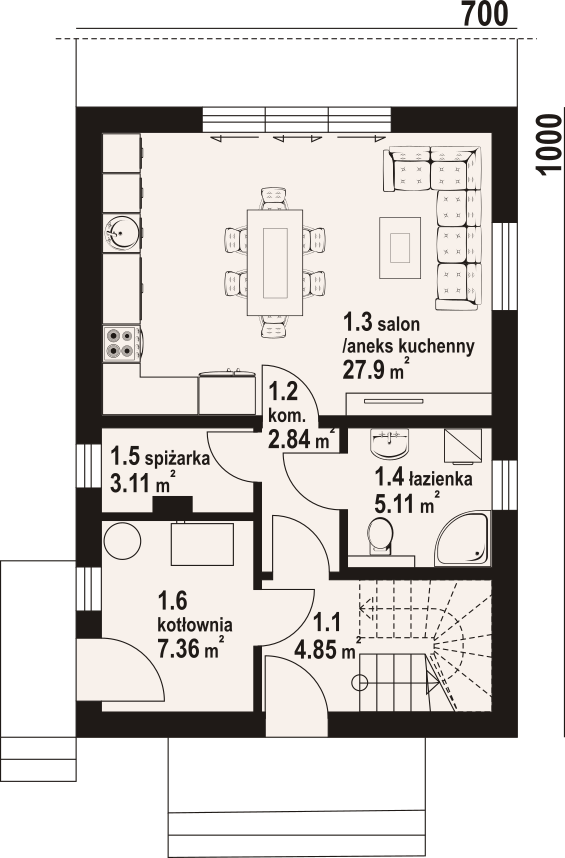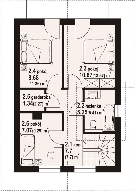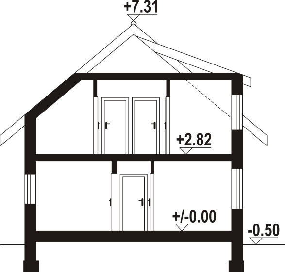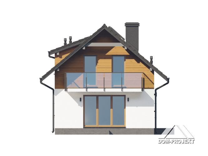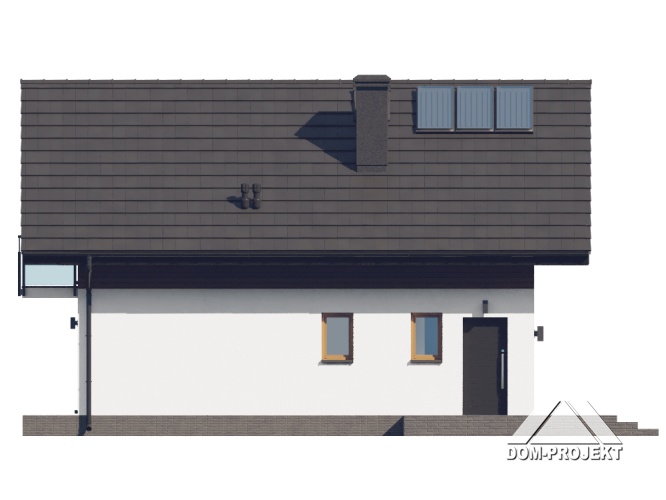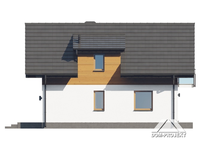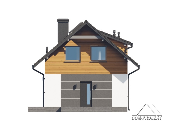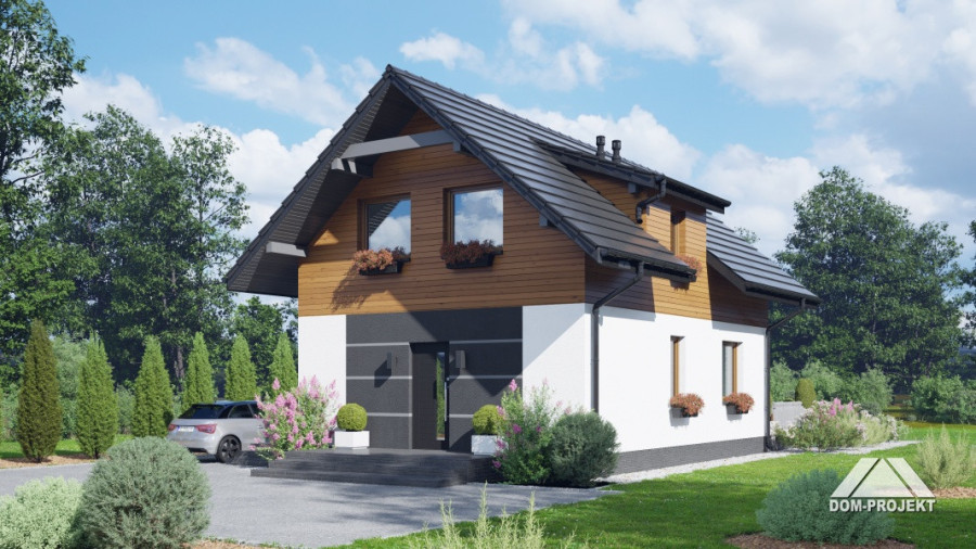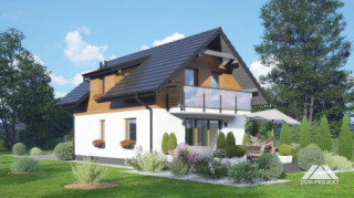 Dom z poddaszem mieszkalnym. Na parterze salon z aneksem kuchennym oraz wyjściem na taras. Łazienka, wiatrołap, komunikacja, spiżarka, kotłownia. Na poddaszu trzy pokoje, łazienka, garderoba, komunikacja. Zwarta bryła budynku oraz dach dwuspadowy sprzyjają szybkiej i taniej budowie oraz niskim kosztom eksploatacji.