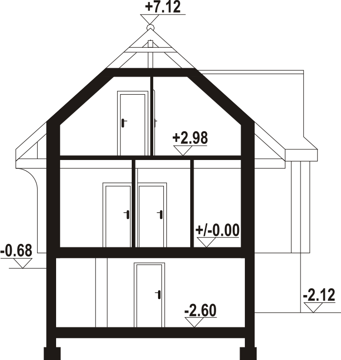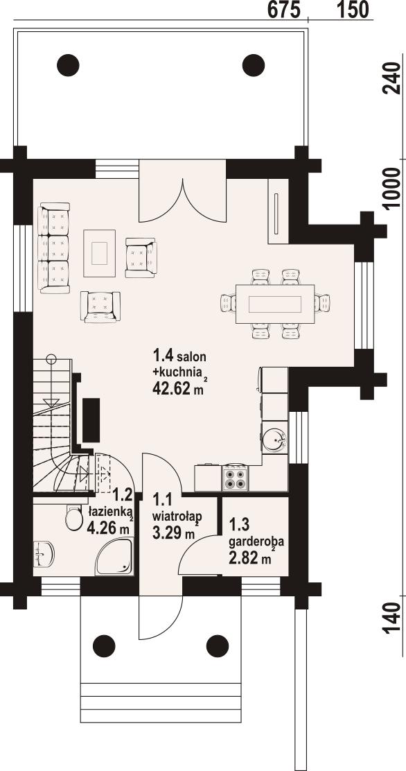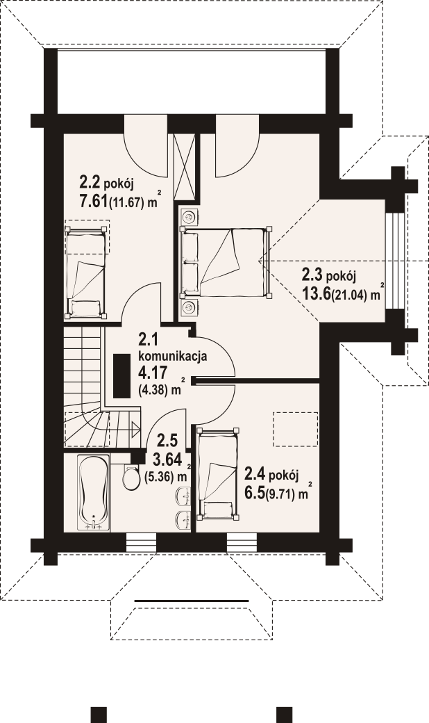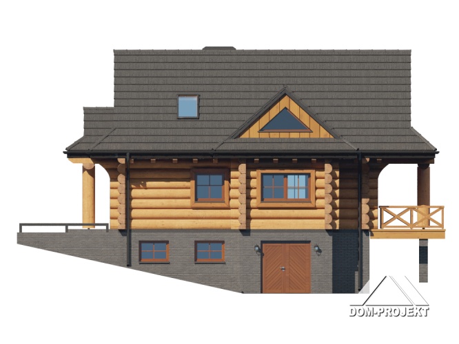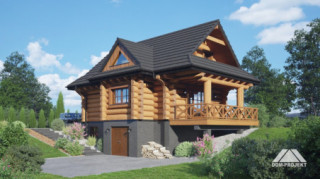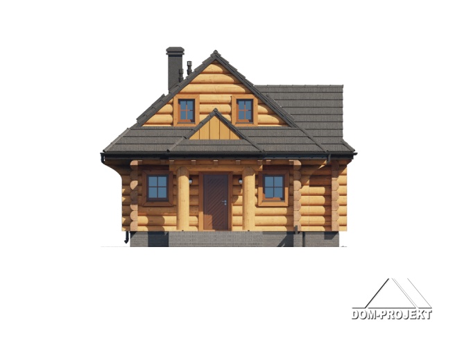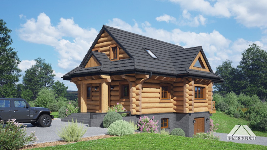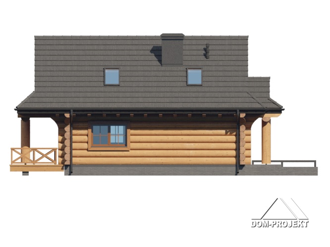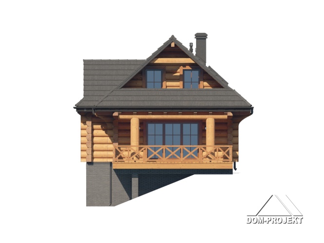 Dom z bali drewnianych. Podpiwniczony. Na parterze salon z kuchnią oraz wyjściem na zadaszony taras. Łazienka, wiatrołap, garderoba. Na poddaszu trzy pokoje, łazienka, komunikacja oraz balkon dostępny z dwóch pokoi. W podpiwniczeniu dwa pomieszczenia gospodarcze. Zwarta bryła budynku oraz dach dwuspadowy sprzyjają szybkiej i taniej budowie oraz niskim kosztom eksploatacji.