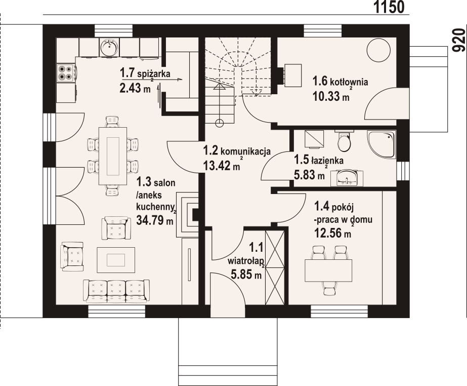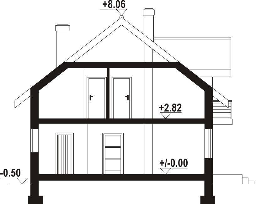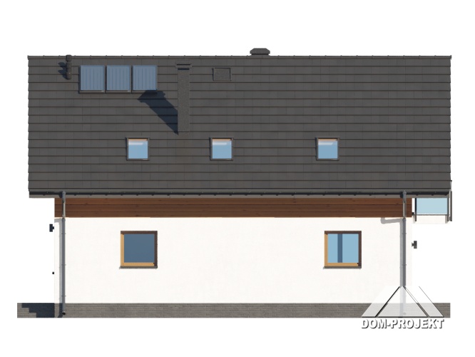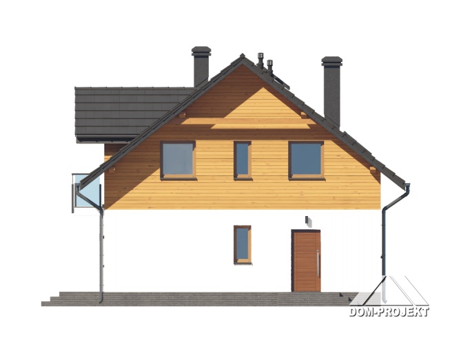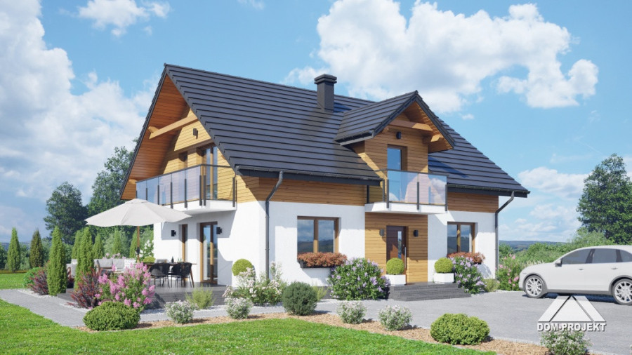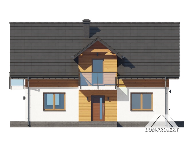 Dom z poddaszem użytkowym. Na parterze salon z aneksem kuchennym, kominkiem oraz wyjściem na taras. Pokój, łazienka, kotłownia, komunikacja oraz wiatrołap. Na poddaszu cztery pokoje (jeden z własną garderobą), łazienka, komunikacja, dwa balkony. Zwarta bryła budynku oraz dach dwuspadowy sprzyjają szybkiej i taniej budowie oraz niskim kosztom eksploatacji.