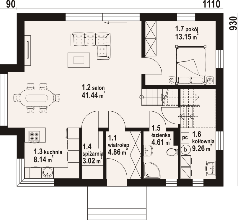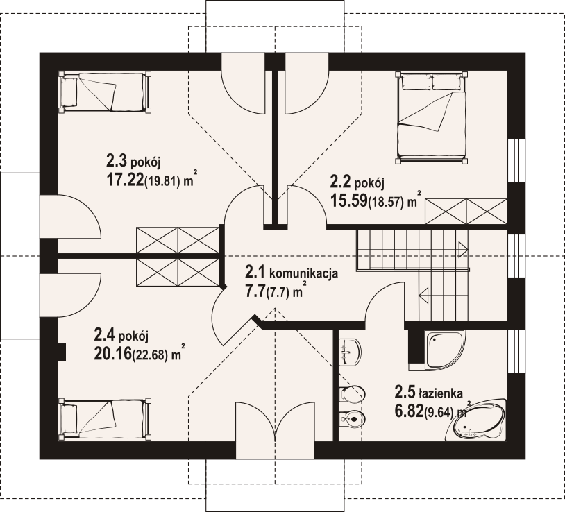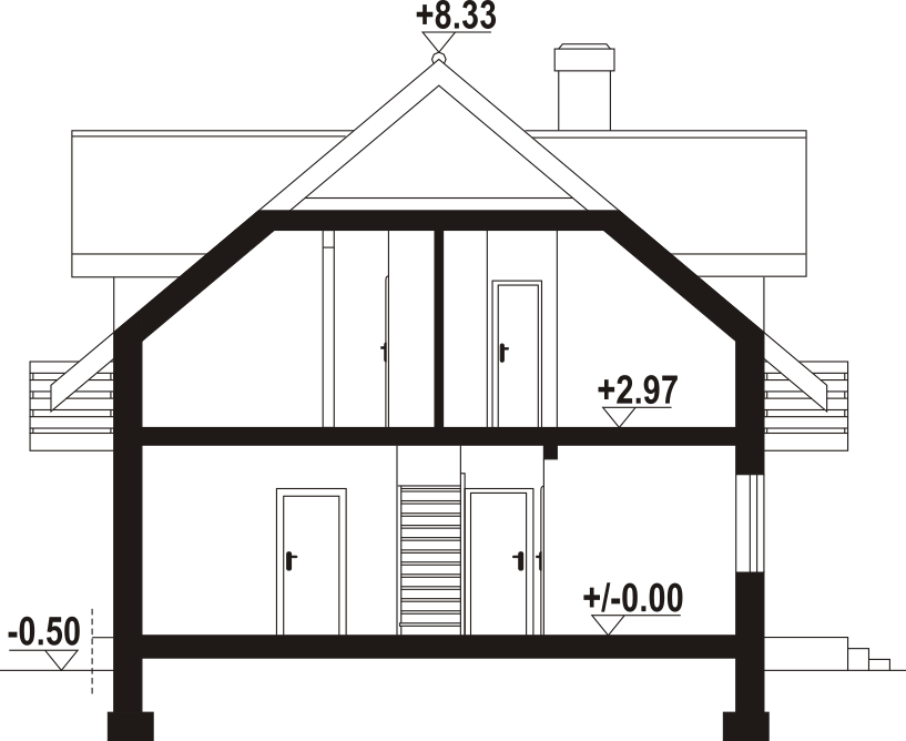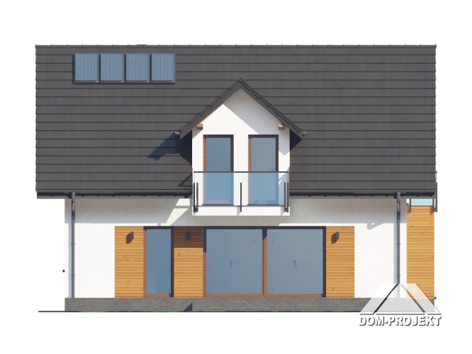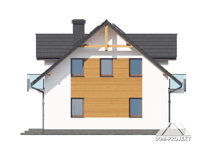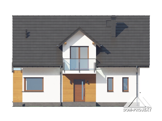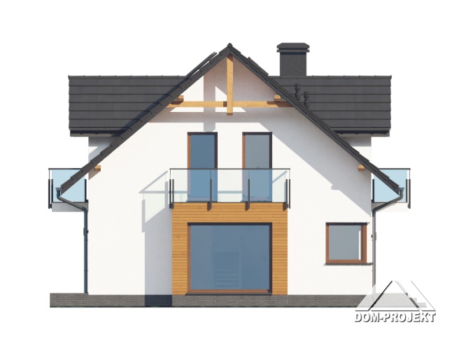 Dom z poddaszem użytkowym. Na parterze duży salon z kuchnią oraz wyjściem na taras. Spiżarka, pokój, wiatrołap, łazienka, kotłownia. Na poddaszu trzy pokoje, każdy z wyjściem na balkon, komunikacja, łazienka. Zwarta bryła budynku oraz dach dwuspadowy sprzyjają szybkiej i taniej budowie oraz niskim kosztom eksploatacji.