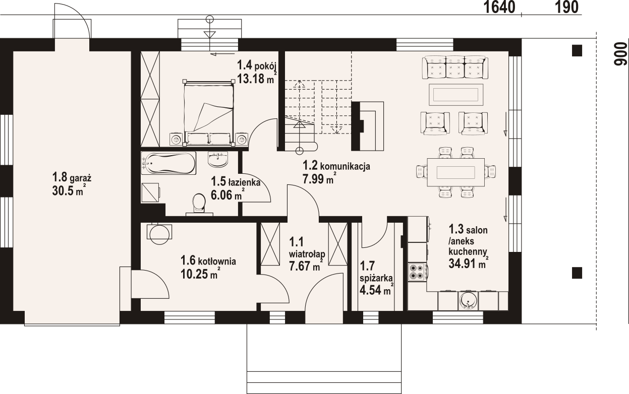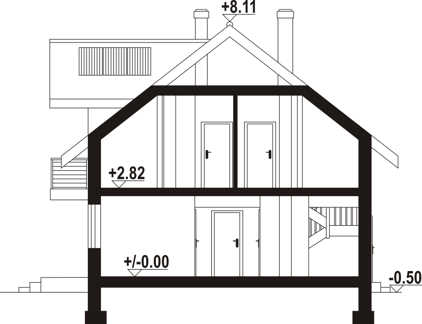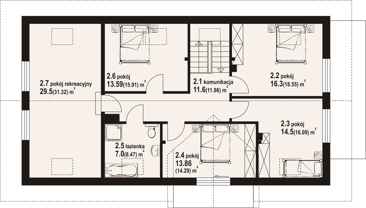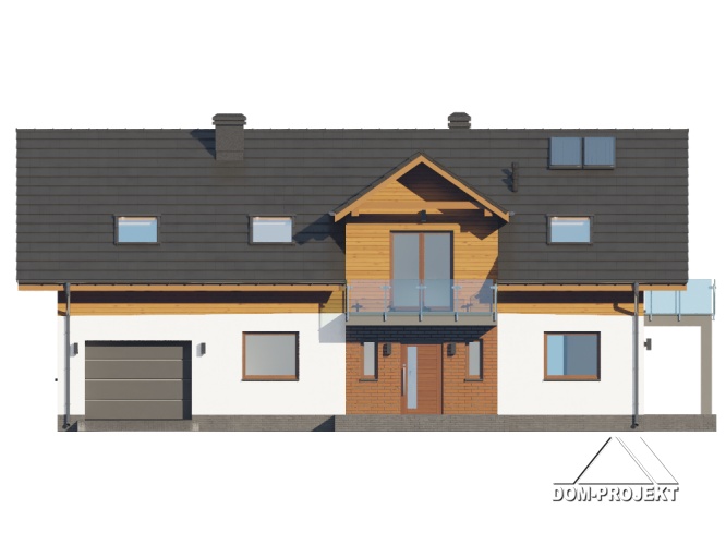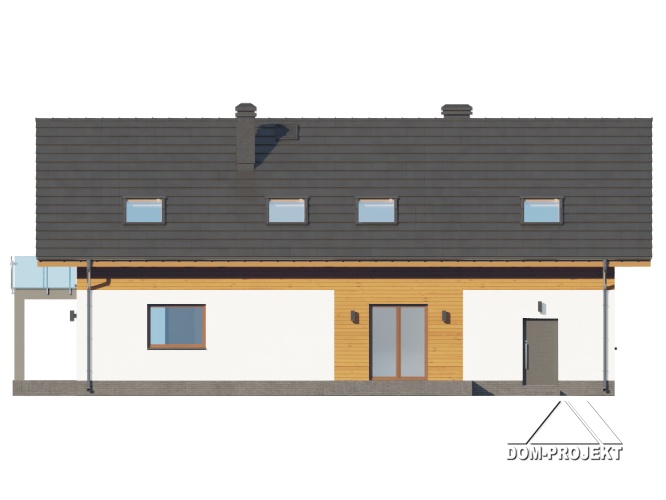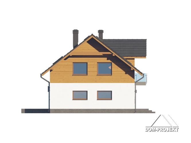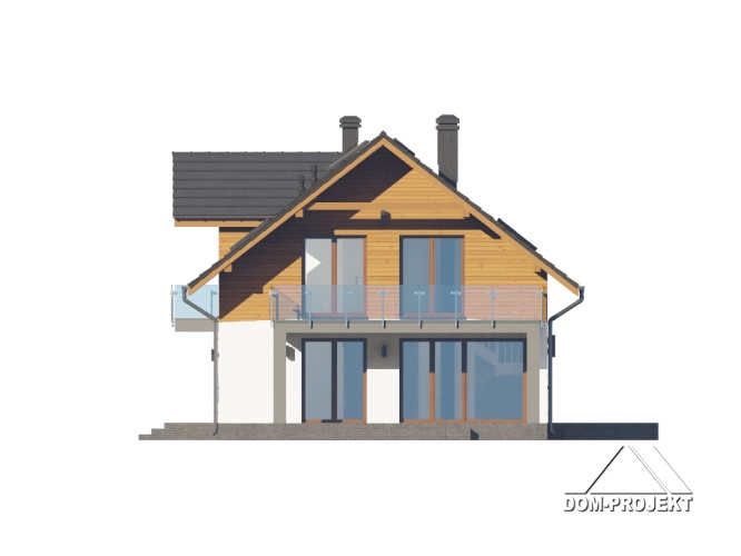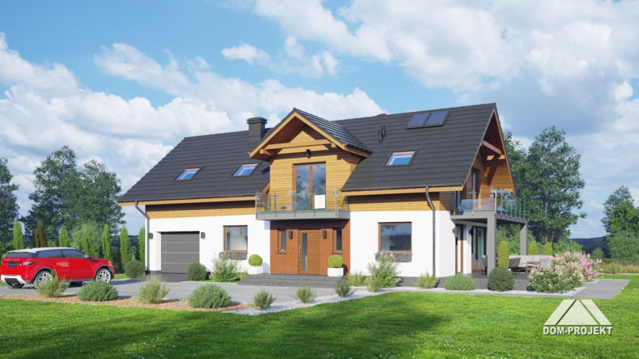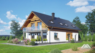 Dom z poddaszem użytkowym. Na parterze salon z aneksem kuchennym, kominkiem oraz wyjściami na taras. Pokój, łazienka, wiatrołap, komunikacja, spiżarka, kotłownia, garaż. Na poddaszu pięć pokoi, łazienka, komunikacja, dwa balkony. Zwarta bryła budynku oraz dach dwuspadowy sprzyjają szybkiej i taniej budowie oraz niskim kosztom eksploatacji.