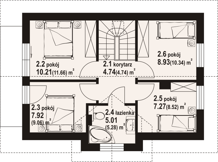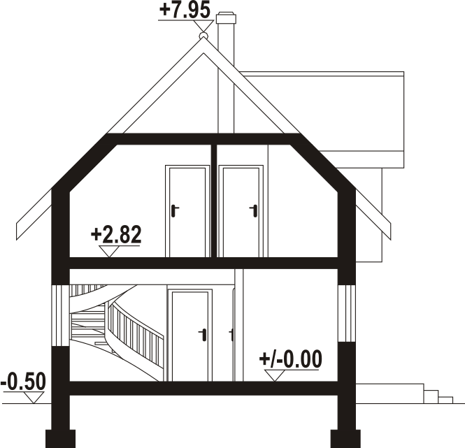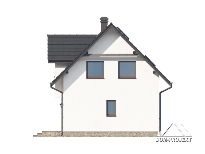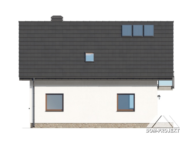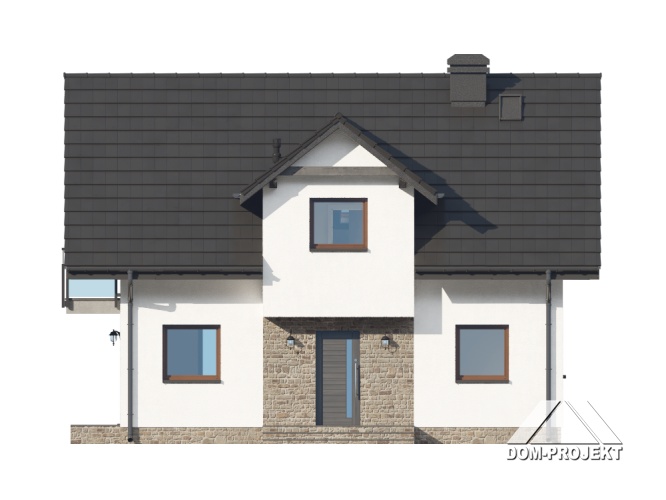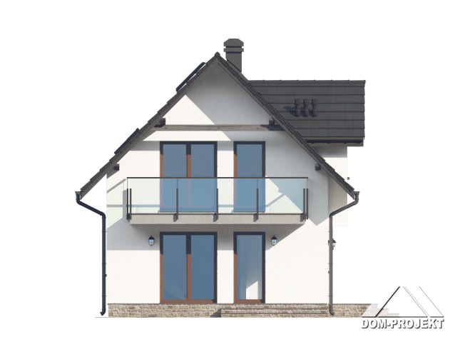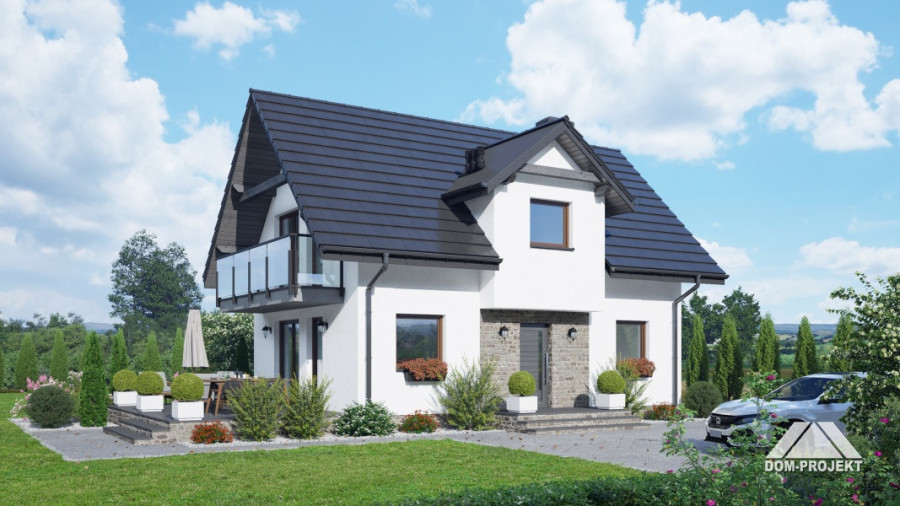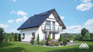 Dom z poddaszem użytkowym. Na parterze salon z aneksem kuchennym, schodami na poddasze oraz wyjściem na taras. Pokój do pracy, wc, kotłownia, wiatrołap. Na poddaszu cztery pokoje, korytarz, łazienka oraz balkon. Zwarta bryła budynku oraz dach dwuspadowy sprzyjają szybkiej i taniej budowie oraz niskim kosztom eksploatacji.