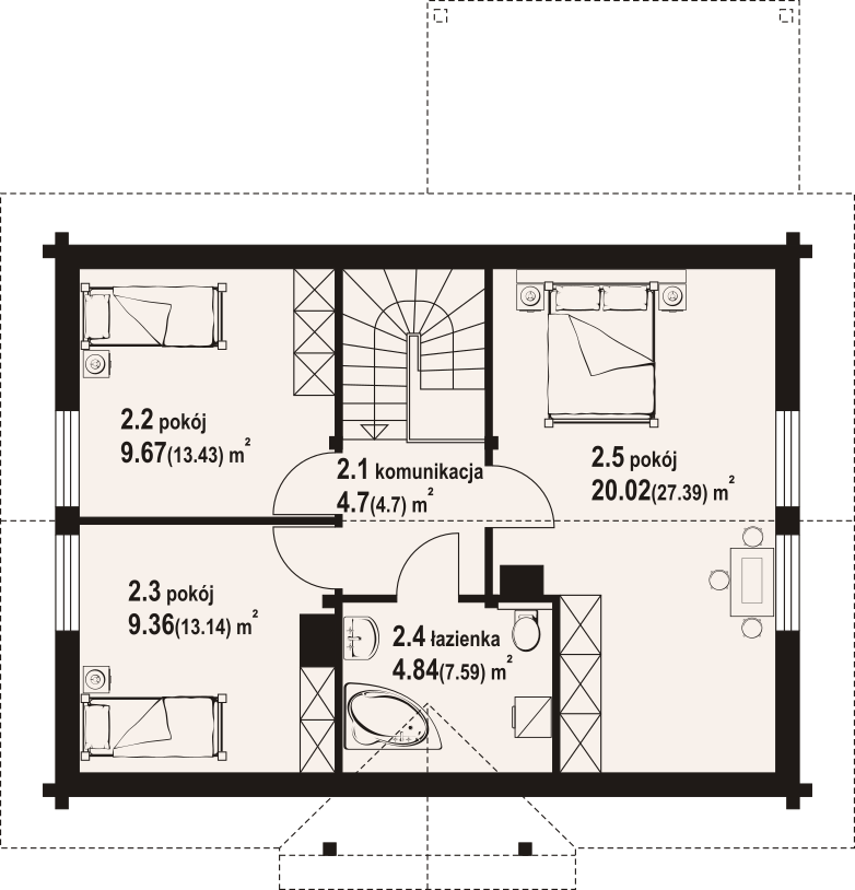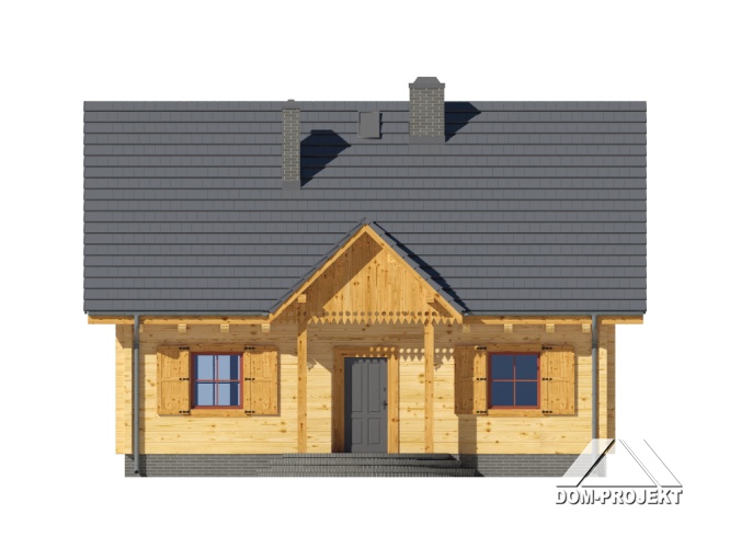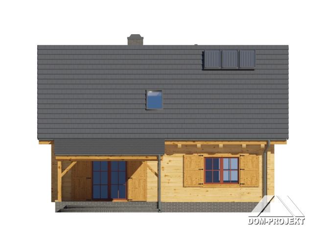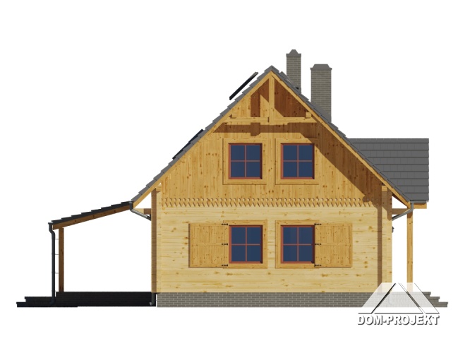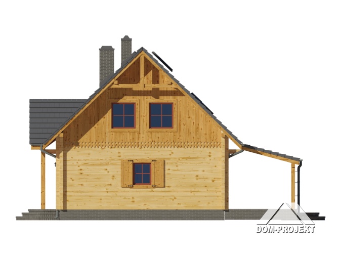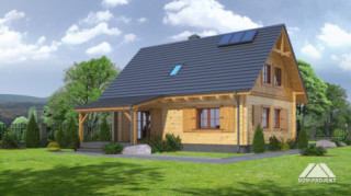 Dom z bali. Na parterze salon z aneksem kuchennym, kominkiem oraz wyjściem na duży, zadaszony taras. Pokój, łazienka, kotłownia, wiatrołap. Na poddaszu trzy pokoje, łazienka, komunikacja. Zwarta bryła budynku oraz dach dwuspadowy sprzyjają szybkiej i taniej budowie oraz niskim kosztom eksploatacji.