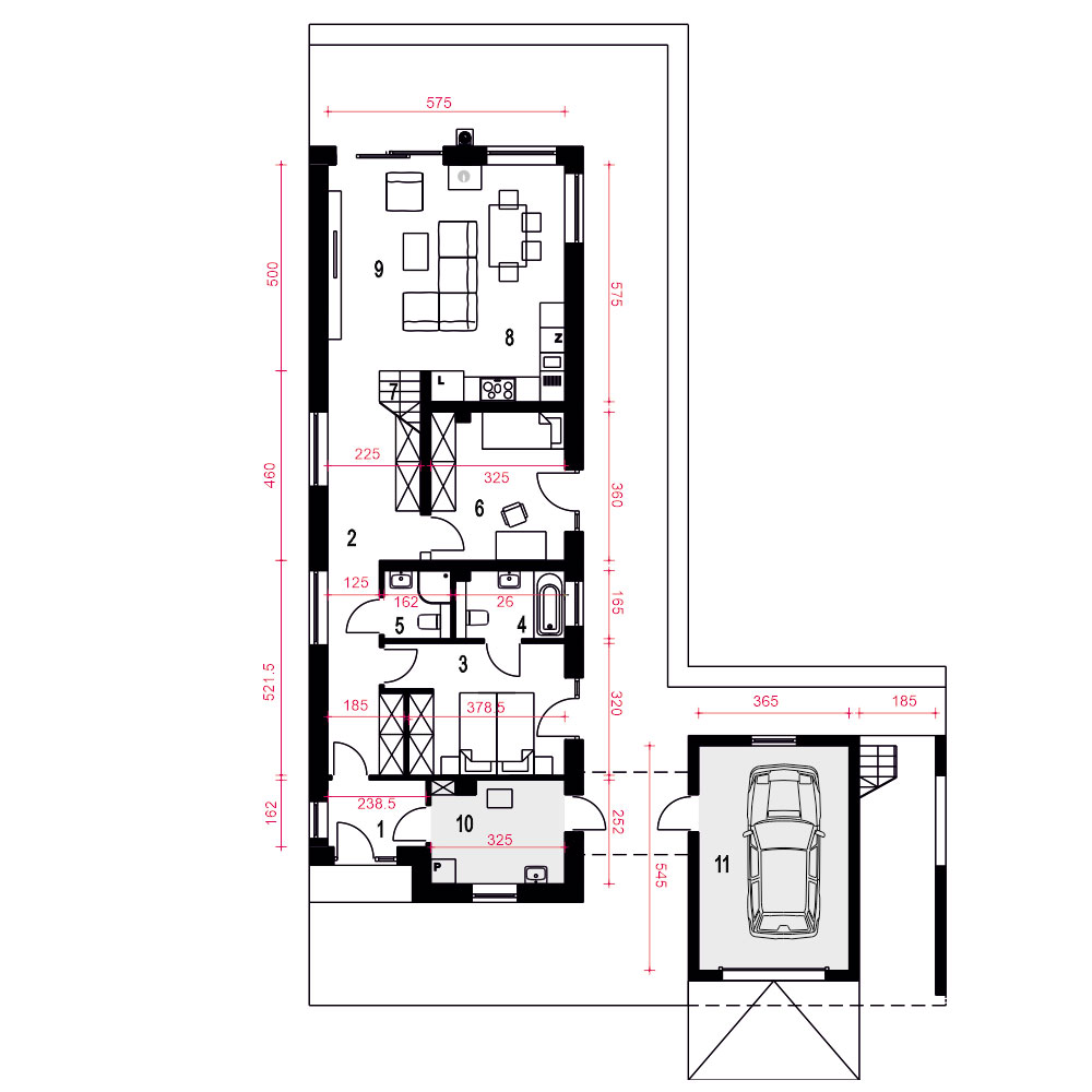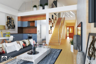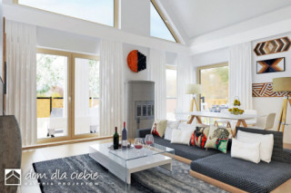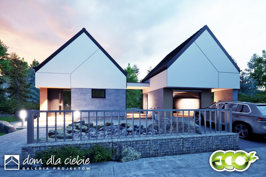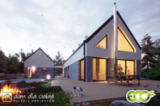Chmiel to ciekawy projekt domu jednorodzinnego, bardzo długiego i wąskiego. Dom jest przewidziany dla 3-4 osobowej rodziny. Bryła budynku oparta jest na prostokątnym rzucie i przekryta jest dachem dwuspadowym o kącie nachylenia 45 st. Obok budynku mieszkalnego zaproponowano część gospodarczą i garażową o podobnej architekturze zewnętrznej. Po wejściu do budynku wchodzimy do wiatrołapu, obok którego jest pomieszczenie techniczne z piecem CO. W części mieszkalnej na parterze są dwie sypialnie (jedna z nich ma indywidualna łazienkę), korytarz, schody. Na końcu budynku jest salon, kuchnia oraz jadalnia. Salon ma duże przeszklenia i otwarcie aż do dachu oraz anytesolę i kominek. Na poddaszu mieści się spora przestrzeń do indywidualnego zagospodarowania. Architektura i przemyślana funkcja są atutami tego nowoczesnego domu.fundamenty: BETONOWE ściany zewnętrzne: POROTHERM+STYROPIAN TERMO ORGANIKA ściany wewnętrzne: POROTHERM rodzaj stropu: TERIVA elewacje: TYNK STRUKTURALNY, CEGŁA KLINKIEROWA pokrycie dachu: DACHÓWKA CERAMICZNA