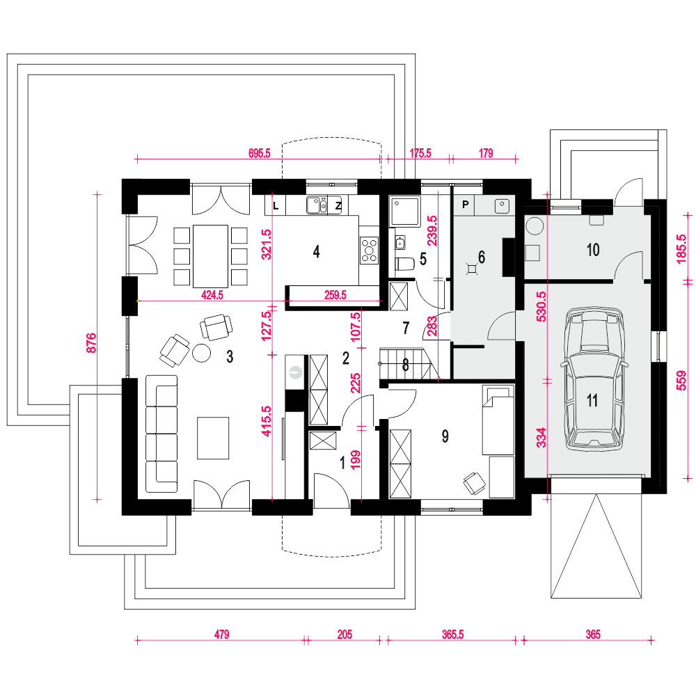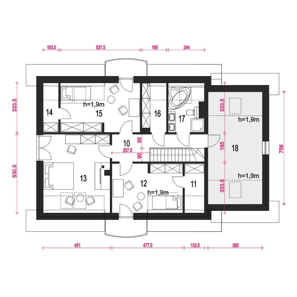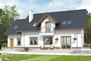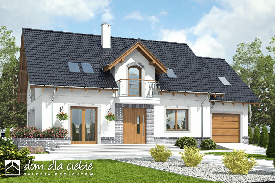 Dom Dla Ciebie 10 z garażem jednostanowiskowym to większa - poszerzona wersja popularnego projektu Dom Dla Ciebie 1, z podcieniem dostępnym z jadalni. Dom Dla Ciebie 10 to projekt domu o popularnej po,. To projekt z użytkowym poddaszem, o tradycyjnej więźbie drewnianej ze ścianką kolankową o wysokości około 1m. Przeznaczony jest dla 4ro osobowej rodziny i tak jak pozostałe projekty z tej serii zaprojektowany został z zachowaniem podziału na dwie strefy: ogólnie dostępną i prywatną. Strefa ogólnie dostępna przewidziana jest na parterze. Mamy tu zaprojektowany wiatrołap z wnękowymi szafami, hol, kuchnię ze spiżarnią, salon z kominkiem, jadalnię z wyjściem na ogród, oraz pokój od frontu, który może służyć jako gabinet. Ponadto jest tu nieduża łazienka z prysznicem oraz przechodnia pralnia z której dostaniemy się do garażu. Za garażem, od strony ogrodu zaprojektowana jest kotłownia, która dodatkowo może spełnić funkcję pomieszczenia gospodarczego. Na poddasze prowadzą jednobiegowe schody, którymi dostaniemy się do przedpokoju prowadzącego do trzech wygodnych i dobrze oświetlonych pokoi z balkonami. Dwa z tych pokoi posiadają wygodne garderoby. Bezpośrednio ze schodów możemy się dostać do nieużytkowego strychu, który z łatwością możemy zaadaptować na cele mieszkaniowe. Na poddaszu jest też przewidziana ogólnie dostępną łazienka z narożną wanną i prysznicem. Projekt domu Dom Dla Ciebie 10, to propozycja dla szukających projektu domu tradycyjnego o stylowej architekturze, funkcjonalnym wnętrzu i o energooszczędnych parametrach.fundamenty: BETONOWE ściany zewnętrzne: POROTHERM+STYROPIAN TERMO ORGANIKA rodzaj stropu: TERIVA I elewacje: TYNK STRUKTURALNY, OKŁADZINA KLINKIEEROWA pokrycie dachu: DACHÓWKA CEMENTOWA, CERAMICZNA lub BLACHA DACHÓWKO PODOBNA