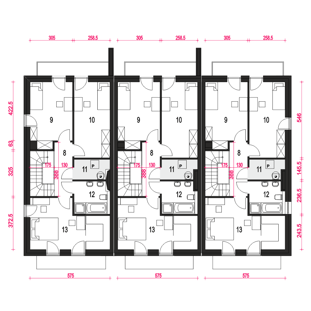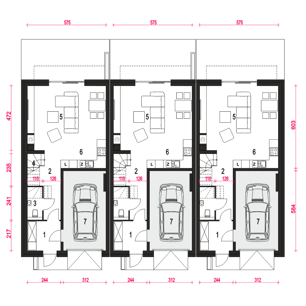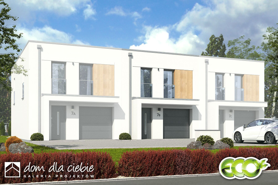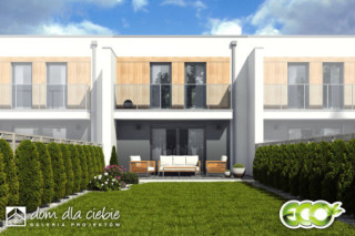 Projekt domu Jukka II w zabudowie szeregowej, to atrakcyjny dom piętrowy z płaskim dachem. To idealny projekt na wąskie działki o bardzo prostej i zwartej formie budynku oraz o niedużej powierzchni użytkowej - około 104 m2 - co przekłada się na niski koszt budowy i niskie koszty eksploatacji domu. Projekt Jukka II zaprojektowany jest dla 4-5cio osobowej rodziny. To dom o tradycyjnej konstrukcji z pustaków ceramicznych izolowanych styropianem, przykryty płaskim dachem. Na funkcję domu składa się część ogólnodostępna i prywatna, zgodnie z podziałem na parter i poddasze. W części ogólnodostępnej zaprojektowano część wejściową z wiatrołapem, holem, WC i schodami prowadzącymi na poddasze. Mamy tu też przewidziany jenostanowiskowy garaż. Dalej mamy zaprojektowany ustawny salon z kominkiem i jadalnią, oraz wygodny aneks kuchenny. Z salonu dostaniemy się na przydomowy ogród. Część prywatna zlokalizowana na poddaszu i obejmuje przedpokój z którego dostaniemy się do 3 sypialni, wspólnej łazienki oraz pomieszczenia pralni z piecem gazowym c.o. Jukka II w zabudowie szeregowej, to projekt domu energooszczędnego, bardzo prostego w realizacji i idealnego dla inwestycji deweloperskich.fundamenty: BETONOWE ściany zewnętrzne: POROTHERM+STYROPIAN TERMO ORGANIKA rodzaj stropu: TERIVA I elewacje: TYNK STRUKTURALNY/OKŁ. DREWNOPODOBNA pokrycie dachu: BITUMICZNE