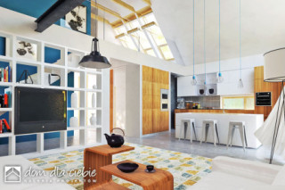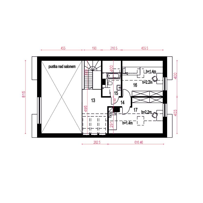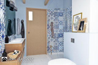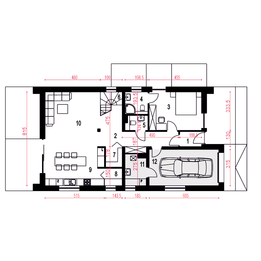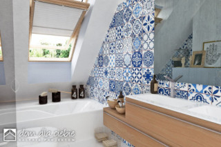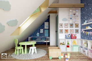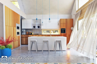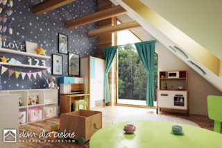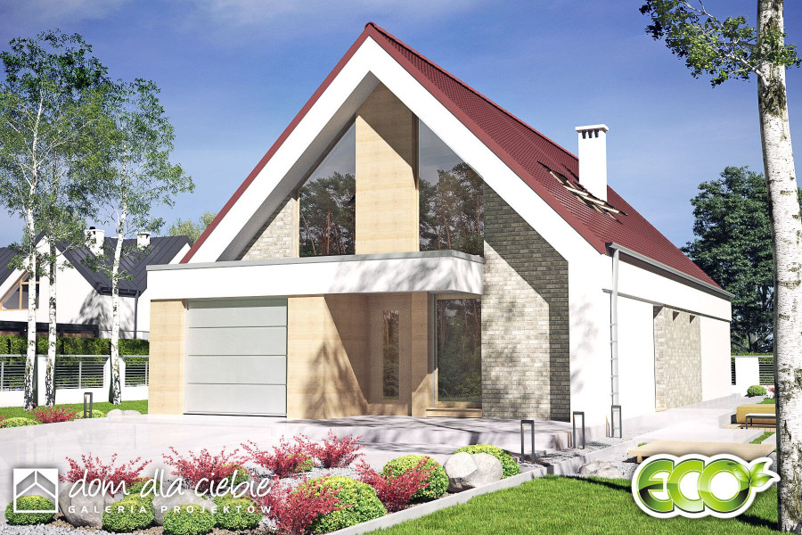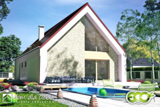 Projekt domu jednorodzinnego oparty na rzucie prostokąta z dachem dwuspadowym o kącie nachylenie dachu 45 st. Charakterystyczne duże przeszklenia i podkreślone okapy nadają budynkowi charakterystyczny wygląd. Wykończenie elewacji to naturalne materiały: drewno i okładzina ceramiczna lub kamienna. Do budynku wchodzi się przez wiatrołap. Długi korytarz, prowadzi do poszczególnych pomieszczeń: garażu (z nim pomieszczenie techniczne), sypialni dwuosobowej z indywidualna łazienką, garderoby, WC, na schody oraz do strefy dziennej. Salon z jadalnią i kuchnią oraz z antresolą doświetloną dużymi balkonowymi oknami połaciowymi to strefa dzienna. Na kondygnacji drugiej zaproponowano dwa pokoje oraz wspólną łazienkę. Dzięki jętkowej, bezsłupowej konstrukcji dachu piętro może być zaaranżowane dowolnie według potrzeb. Obok kuchni zaproponowano wygodną spiżarnię na domowe zapasy. Dom przewidziano dla 4 osobowej rodziny. Sobótka nadaje się na wąskie działki dzięki niewielkiej szerokości elewacji frontowej.fundamenty: BETONOWE ściany zewnętrzne: POROTHERM+STYROPIAN TERMO ORGANIKA ściany wewnętrzne: POROTHERM rodzaj stropu: TERIVA elewacje: TYNK STRUKTURALNY, CEGŁA KLINKIEROWA pokrycie dachu: DACHÓWKA CERAMICZNA