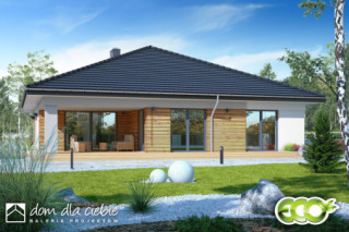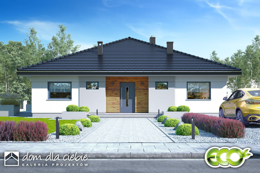 Projekt domu parterowego Klara II bez garażu to idealna propozycja dla 4 do 5cio osobowej rodziny. Dom zaprojektowany jest w technologii murowanej z tradycyjną więźbą dachową, przekryty spadzistym dachem kopertowym. To funkcjonalny projekt domu parterowego, łączący strefę ogólnodostępną i prywatną na jednej kondygnacji. Projekt jest większą wersją projektu Klara i został powiększony o jedną dodatkową sypialnię, w wyniku czego posiada 5 pokoi w tym salon. W części wejściowej mamy zaprojektowany wygodny wiatrołap i hol z szafami wnękowymi, pralnię oraz toaletę. W części ogólnodostępnej przewidziano przestronny i dobrze doświetlony salon z miejscem na wygodny stół jadalniany, z widokiem na ogród. Dzięki dużym drzwiom tarasowym od strony ogrodowej, dostaniemy się wprost na taras zewnętrzny, zadaszony podcieniem. W strefie ogólnodostępnej projekt przewiduje również wygodną kuchnię z wyspą i praktyczną spiżarnią. Kuchnia z układem mebli w kształcie litery "L", zapewnia wygodną przestrzeń do pracy, a duże frontowe okno doświetla idealnie przestrzeń roboczą. Do części prywatnej domu dostaniemy się przez korytarz dostępny z holu wejściowego. W części prywatnej mamy zaprojektowane cztery pokoje sypialne w tym jeden typu master bedroom. Znajdziemy tu też wygodną, wspólną łazienkę z wanną oraz pomieszczenie techniczne z piecem CO. Klara II to atrakcyjna propozycja domu energooszczędnego, o nowoczesnym wyglądzie. To projekt domu z serii "eco" - ekonomiczny w budowie i w utrzymaniu - idealna propozycja dla rodzin planujących budowę pierwszego domu.fundamenty: BETONOWE ściany zewnętrzne: POROTHERM+STYROPIAN TERMO ORGANIKA rodzaj stropu: TERIVA I elewacje: TYNK STRUKTURALNY pokrycie dachu: DACHÓWKA CEM. lub CER.