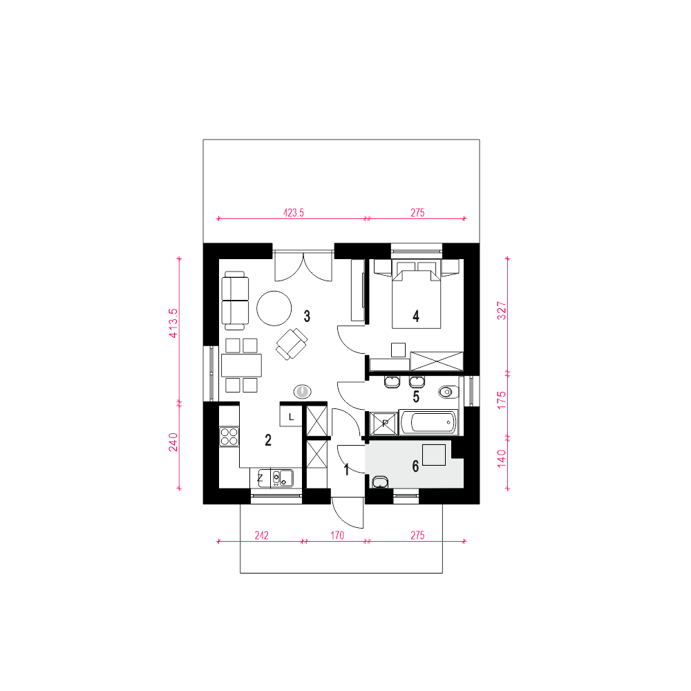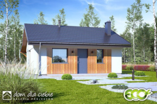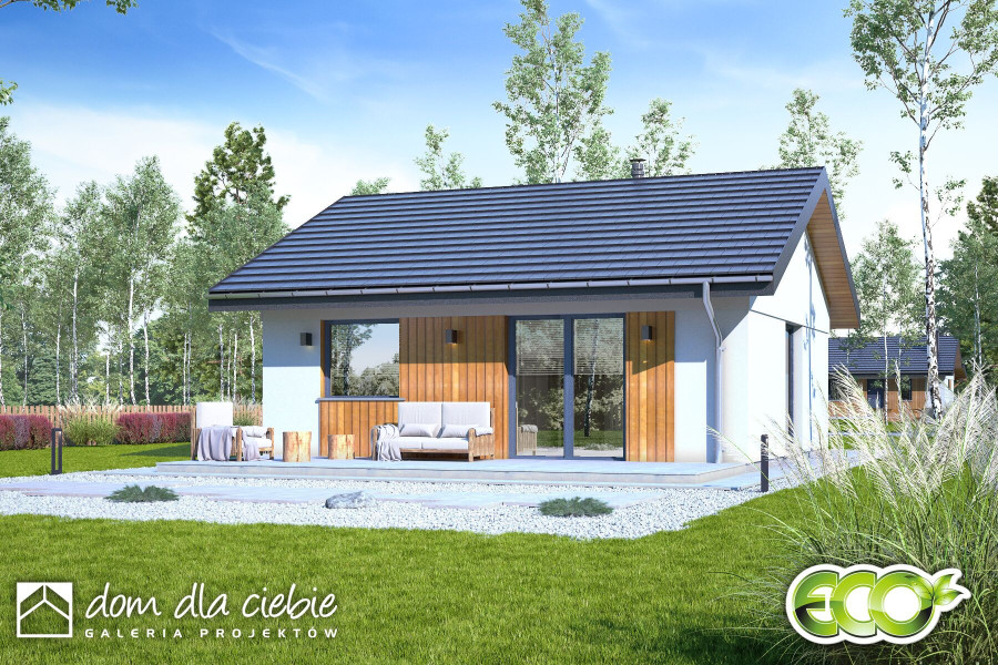 Projekt domu Bratek B1 to wariant bez zadaszenia tarasu ogrodowego. Bratek to mały domek parterowy dla 2-3 osobowej rodziny. Prosta konstrukcja i forma budynku w tym dwuspadowy dach sprawiają, że jest to dom bardzo ekonomiczny w budowie i w użytkowaniu. Projekt domu Bratek można z powodzeniem wykorzystać jako dom rekreacyjny do użytku własnego lub inwestycyjnie. Na funkcję domu składa się wiatrołap z wnękową szafą, kuchnia, salon z jadalnią, sypialnia, wygodna łazienka oraz kotłownia, na paliwo stałe. W kotłowni z powodzeniem można zastosować również piec na paliwo gazowe, w tym celu możemy opracować stosowny aneks. Projekt domu Bratek to ekonomiczna propozycja domu energooszczędnego o powierzchni do 50m2.