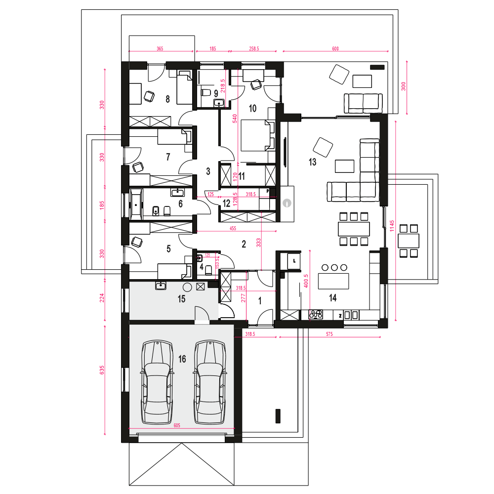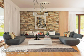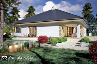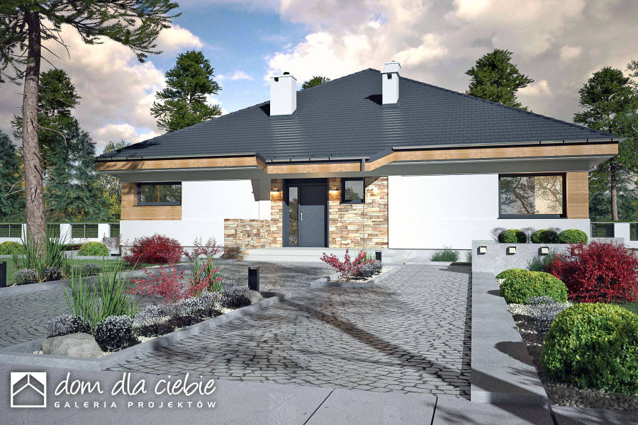 Czarnuszka to projekt dużego, bazkompromisowego w funkcji domu jednorodzinnego dla 4-5 osobowej rodziny. Główna bryła Czarnuszki jest założona na planie kwadratu przekryta regularnym dachem o kącie nachylenia 30 stopni. Strefa wejściowa znajduje się pośrodku elewacji frontowej zaakcentowana jest naturalną okładziną kamienną. Podobnie podcień tarasowy ozdobiony jest kamienną okładziną. Elewacje budynku są na przeważającej powierzchni białe z drewnianymi i kamiennymi detalami. Wewnątrz Czarnuszki zaprojektowano cztery sypialnie. Trzy z nich mają identyczne powierzchnie, własne wyjścia balkonowe na tarasy i wspólną łazienkę a czwarta jest większa posiada własną garderobę oraz indywidualna łazienkę. Największa sypialnia, usytuowana w centralnej, tylnej części budynku ma własne wyjście na ogród poprzez taras, podobnie części - w założeniu dwuosobowa, posiada indywidualną garderobę, łazienkę i osobne wyjście na taras ogrodowy. Przy dużej kuchni, otwartej na jadalnię i salon, przewidziano wygodną spiżarnię. Duży salon z kominkiem posiada duże przeszklenie z wyjściem na zadaszony taras. Z jadani można wyjść na osobny taras na którym nożna ustawić stolik. W holu przewidziano miejsce na garderobę wnękową a w holu wnęka na szafę oraz WC. W centralnej strefie znajduje się niewielka pralnia. Do kotłowni wchodzi się bezpośrednio z wiatrołapu. Cały projekt zawiera wszystko co niezbędne dla komfortowego życia dla nowoczesnej rozwojowej rodziny. Polecamy go do budowy na nowych osiedlach.fundamenty: BETONOWE ściany zewnętrzne: POROTHERM+STYROPIAN TERMO ORGANIKA ściany wewnętrzne: POROTHERM rodzaj stropu: PREFABRYKOWANE WIĄZARY DACHOWE/MITEK elewacje: TYNK STRUKTURALNY, OKŁADZINA DREWNOPODOBNA I KAMINNA pokrycie dachu: DACHÓWKA CERAMICZNA