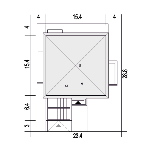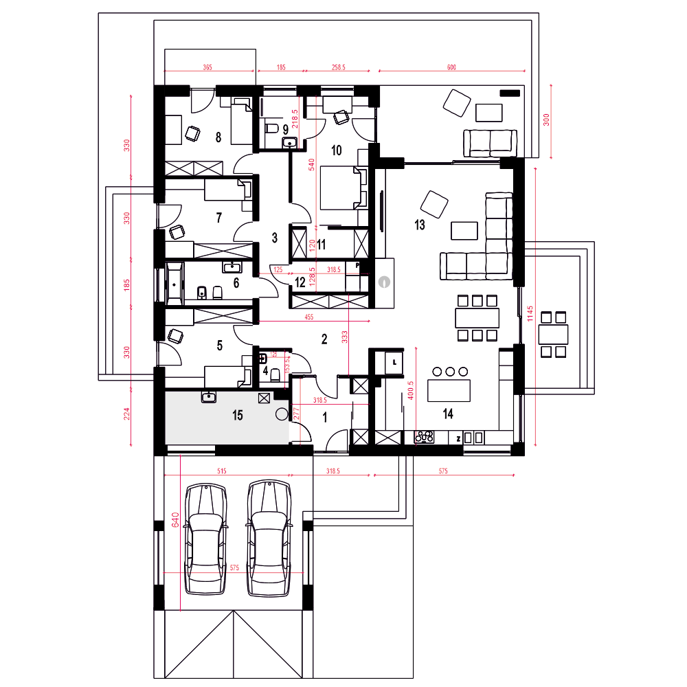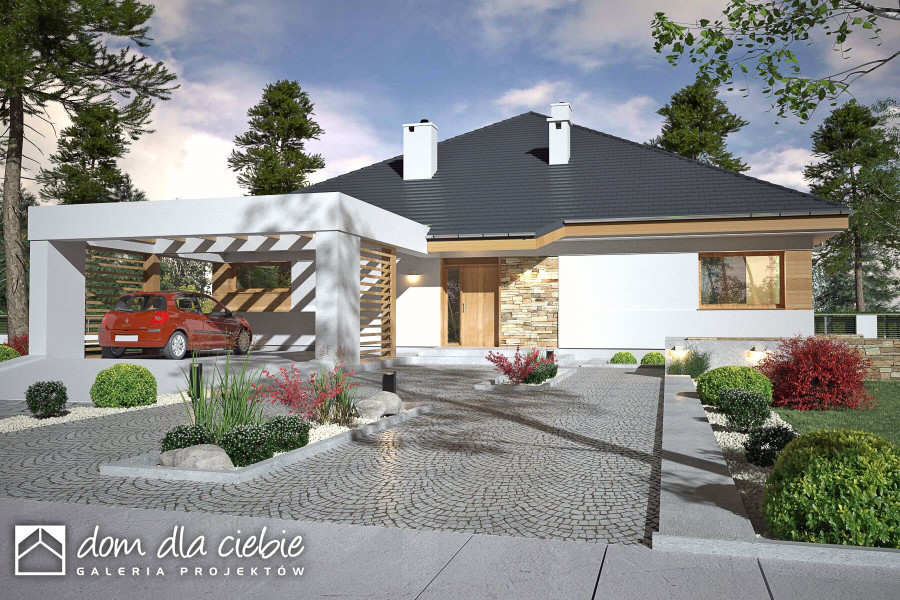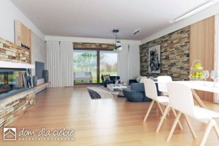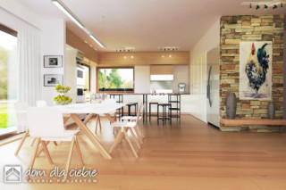 Czarnuszka to projekt dużego, bazkompromisowego w funkcji domu jednorodzinnego dla 4-5 osobowej rodziny. Główna bryła Czarnuszki jest założona na planie kwadratu przekryta regularnym dachem o kącie nachylenia 30 stopni. Strefa wejściowa znajduje się pośrodku elewacji frontowej zaakcentowana jest naturalną okładziną kamienną. Podobnie podcień tarasowy ozdobiony jest kamienną okładziną. Elewacje budynku są na przeważającej powierzchni białe z drewnianymi i kamiennymi detalami. Wewnątrz Czarnuszki zaprojektowano cztery sypialnie. Trzy z nich mają identyczne powierzchnie, własne wyjścia balkonowe na tarasy i wspólną łazienkę a czwarta jest większa posiada własną garderobę oraz indywidualna łazienkę. Największa sypialnia, usytuowana w centralnej, tylnej części budynku ma własne wyjście na ogród poprzez taras, podobnie części - w założeniu dwuosobowa, posiada indywidualną garderobę, łazienkę i osobne wyjście na taras ogrodowy. Przy dużej kuchni, otwartej na jadalnię i salon, przewidziano wygodną spiżarnię. Duży salon z kominkiem posiada duże przeszklenie z wyjściem na zadaszony taras. Z jadani można wyjść na osobny taras na którym nożna ustawić stolik. W holu przewidziano miejsce na garderobę wnękową a w holu wnęka na szafę oraz WC. W centralnej strefie znajduje się niewielka pralnia. Do kotłowni wchodzi się bezpośrednio z wiatrołapu. Cały projekt zawiera wszystko co niezbędne dla komfortowego życia dla nowoczesnej rozwojowej rodziny. Polecamy go do budowy na nowych osiedlach.
