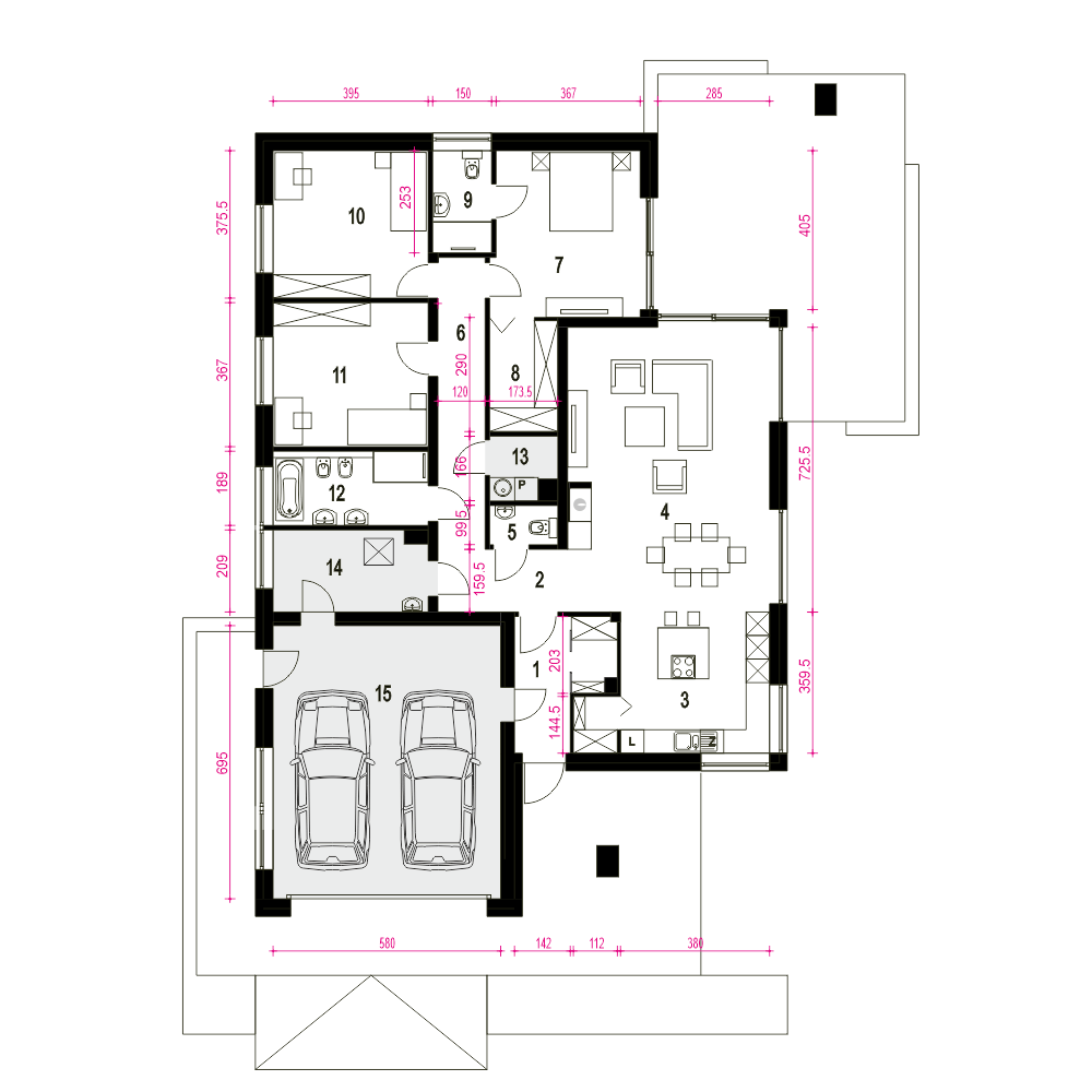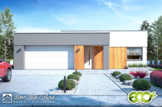 Projekt domu jednorodzinnego, parterowego z płaskim dachem dla 4- osobowej rodziny. Strefa dzienna w projekcie to: salon, kuchnia z wyspą i spiżarnią oraz wc dla gości. Strefa nocna zawiera 3 sypialnie w tym jedną z własną łazienką i garderobą, spora łazienka oraz pralnia i kotłownia z przejściem do garażu.