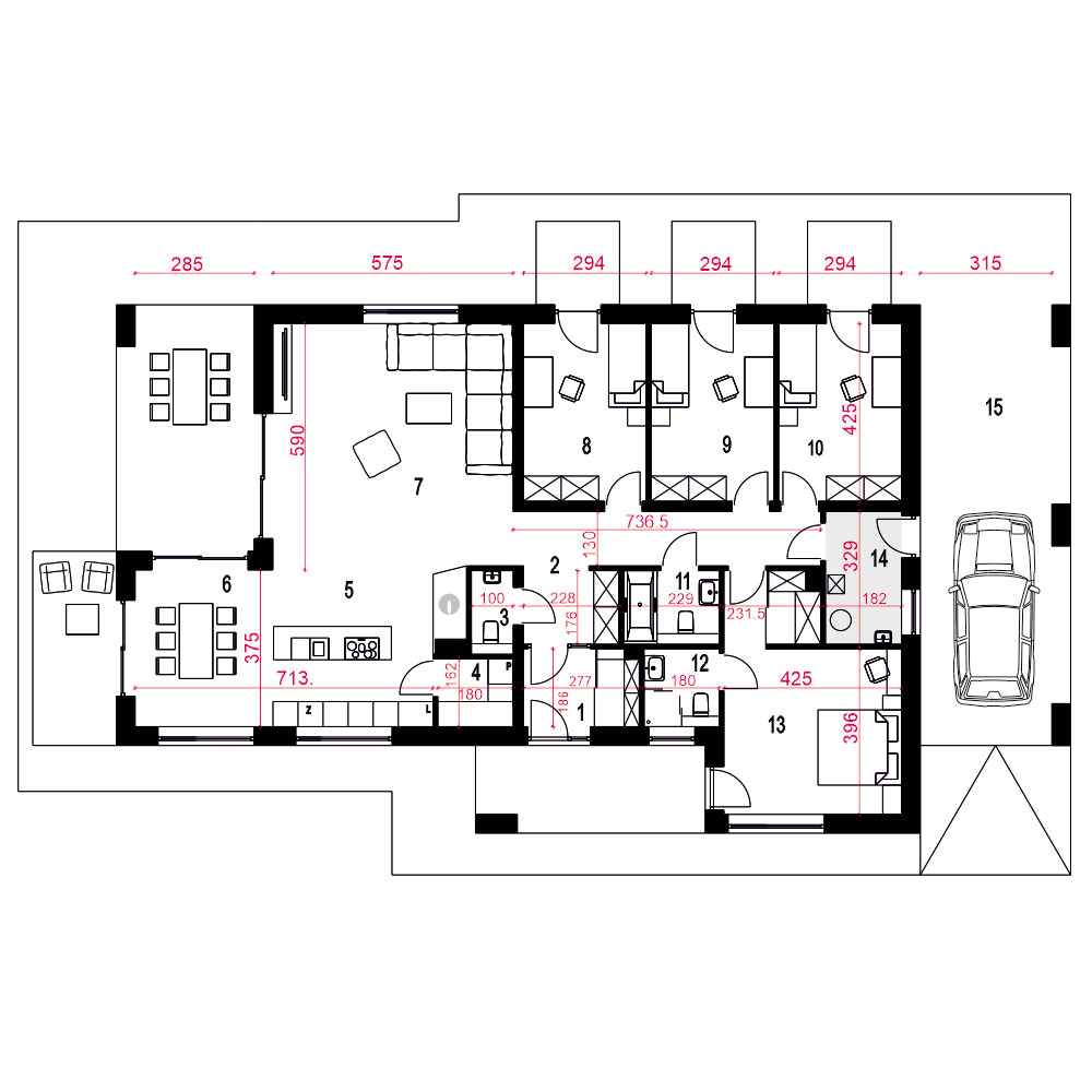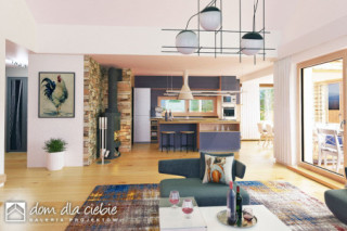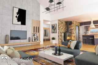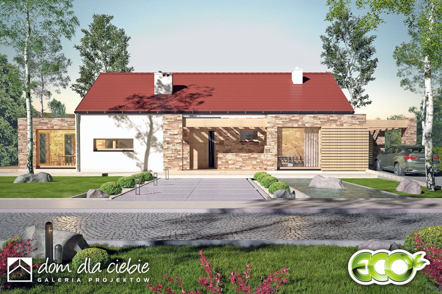 Ślęza to projekt funkcjonalnego parterowego domu jednorodzinnego zaprojektowanego z myślą o stworzeniu takiej przestrzeni, która odpowie na czasy izolacji społecznej. Ilość pokoi mieszkalnych umożliwia zorganizowanie w jednym z nich gabinetu, lub pokoju komputerowego, również jak większy pokój w razie potrzeby może zostać zagospodarowany jako gabinet usługowy. Tarasy zewnętrzne i indywidualne, ogrodowe wyjścia z pokoi sypialnych umożliwiają wybór miejsca relaksu. Budynek zaspakaja potrzeby 4-5 osobowej rodziny. Po przejściu przez obszerny wiatrołap z garderobą i holu wchodzimy do jednoprzestrzennego pomieszczenia z salonem, kuchnią i jadalnią. Nad salonem mamy otwartą przestrzeń do dachu. Strefa nocna to trzy identyczne sypialnie, wspólna łazienka dostępna z korytarza oraz wejście do sypialni typu master bedroom z indywidualną łazienką oraz miejscem na garderobę. Na końcu korytarza znajduje się pomieszczenie techniczne z piece CO. Architektura zewnętrzna budynku to połączenie białego tynku i naturalnej kolorystyki kamienia oraz drewnafundamenty: BETONOWE ściany zewnętrzne: POROTHERM+STYROPIAN TERMO ORGANIKA ściany wewnętrzne: POROTHERM rodzaj stropu: TERIVA elewacje: TYNK STRUKTURALNY, OKŁADZINA KAMIENNA pokrycie dachu: DACHÓWKA CERAMICZNA