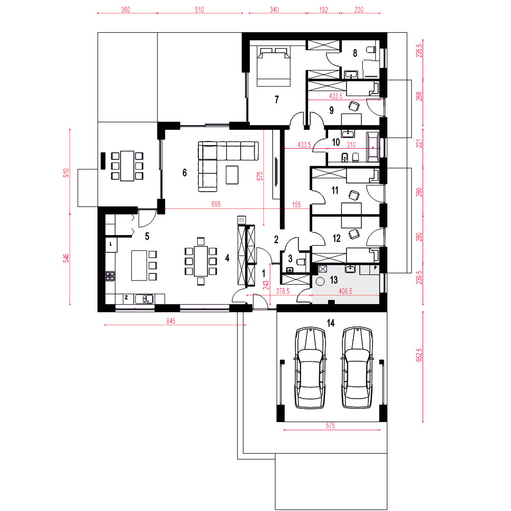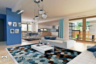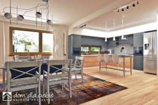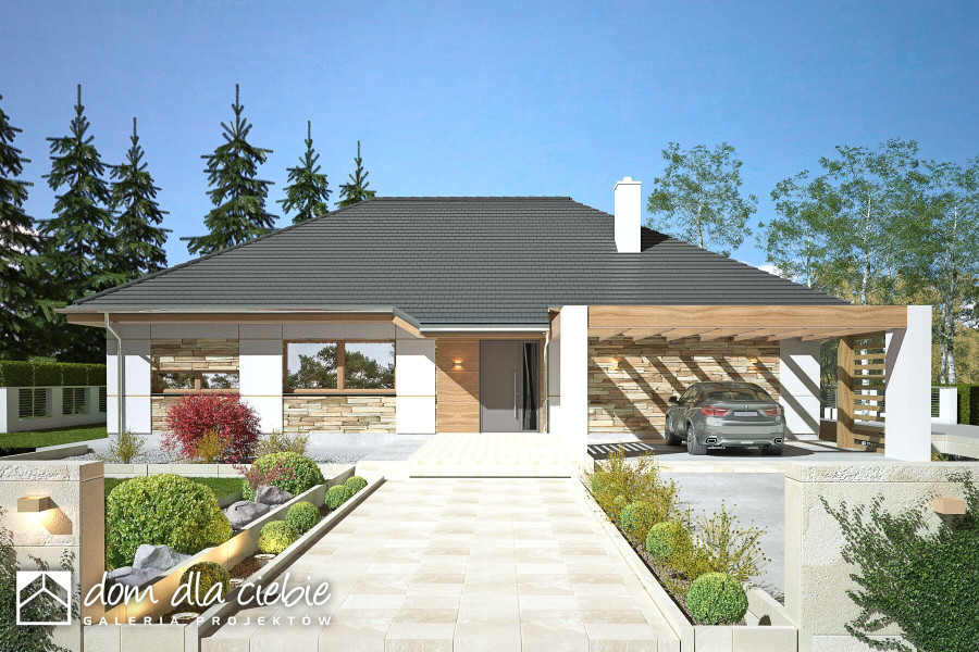 Projekt gotowy Arnika to propozycja nowoczesnego domu parterowego. Dom jest przekryty dachem wielospadowym. Od przodu znajduje się wiata. Do wnętrza wchodzi się poprzez duży wiatrołap rozprowadzający do pomieszczenia technicznego oraz części mieszkalnej. Hol wraz z komunikacją łączy część dzienną i nocną budynku. Wspólna przestrzeni salonu, kuchni i jadalni to strefa dzienna. Bezpośrednio z kuchni i salonu można dostać się na zadaszony taras. W części indywidualnej mamy cztery sypialnie i komfortową łazienkę. Największa dwuosobowa sypialnia posiada własną garderobę i indywidualną łazienkę. Wszystkie pomieszczenia sypialne łączy długi korytarz. Z każdej sypialni można wyjść bezpośrednio na ogród dzięki drzwiom balkonowym. Arnika to wygodny, nowoczesny dom dla dużej rodziny, w której każdy z domowników znajdzie dla siebie miłą przestrzeń.