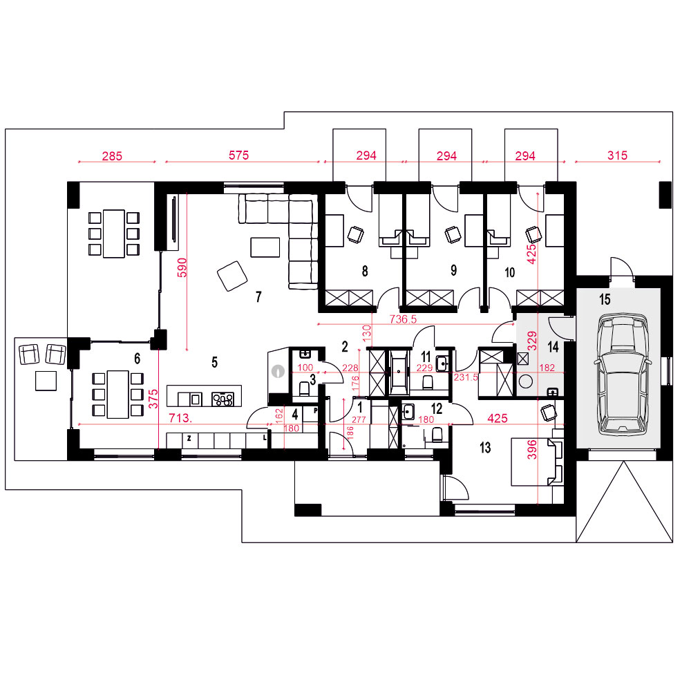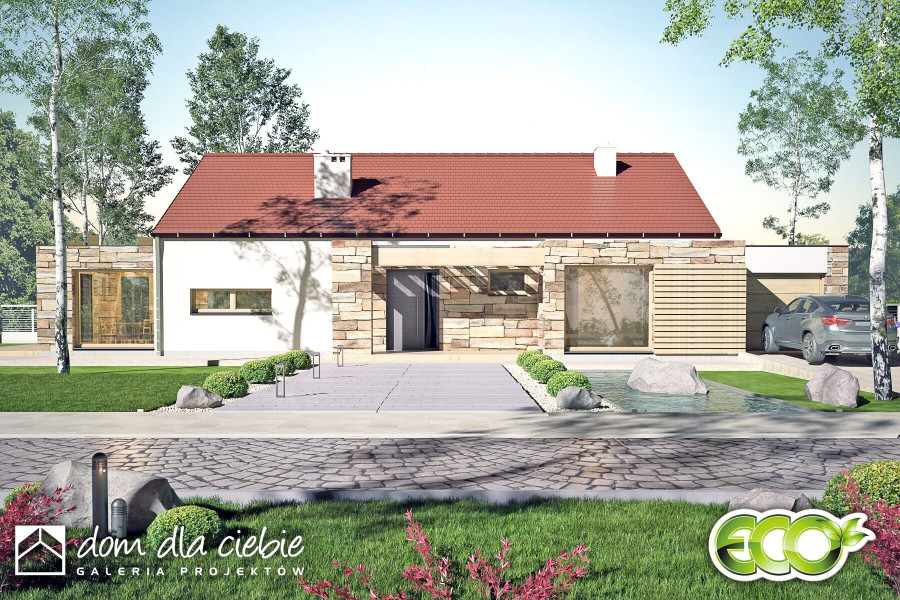 Ślęza to projekt funkcjonalnego parterowego domu jednorodzinnego zaprojektowanego z myślą o stworzeniu takiej przestrzeni, która odpowie na czasy izolacji społecznej. Ilość pokoi mieszkalnych umożliwia zorganizowania w jednym z nich gabinetu, lub pokoju komputerowego, również jak większy pokój w razie potrzeby może zostać zagospodarowany jako gabinet usługowy. Tarasy zewnętrzne i indywidualne, ogrodowe wyjścia z pokoi sypialnych umożliwiają wybór miejsca relaksu. Budynek zaspakaja potrzeby 4-5 osobowej rodziny. Po przejściu przez obszerny wiatrołap z garderobą i holu wchodzimy do jednoprzestrzennego pomieszczenia z salonem, kuchnią i jadalnią. Nad salonem mamy otwartą przestrzeń do dachu. Strefa nocna to trzy identyczne sypialnie, wspólna łazienka dostępna z korytarza oraz wejście do sypialni typu master bedroom z indywidualną łazienką oraz miejscem na garderobę. Na końcu korytarza znajduje się pomieszczenie techniczne z piecem CO, a za nim garaż. Architektura zewnętrzna budynku to połączenie białego tynku i naturalnej kolorystyki kamienia oraz drewna