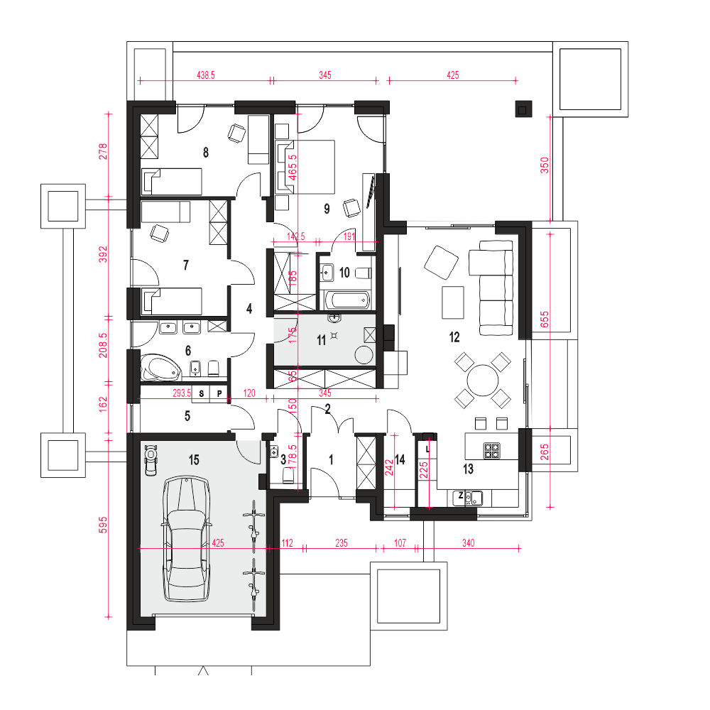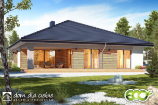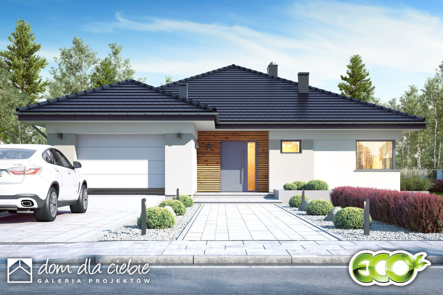 Projekt domu parterowego Klara III z garażem to idealna propozycja dla 4 do 5cio osobowej rodziny. Dom zaprojektowany jest w technologii murowanej z tradycyjną więźbą dachową, przekryty spadzistym dachem kopertowym. Klara III to funkcjonalny projekt domu parterowego, łączący strefę ogólnodostępną i prywatną na jednej kondygnacji. Projekt jest zmienioną wersją projektu Klara II, gdzie w zamian pokoju został doprojektowany garaż. W części wejściowej mamy zaprojektowany wygodny wiatrołap i hol z szafami wnękowymi, pralnię oraz toaletę. W części ogólnodostępnej przewidziano przestronny i dobrze doświetlony salon z miejscem na wygodny stół jadalniany, z widokiem na ogród. Dzięki dużym drzwiom tarasowym od strony ogrodowej, dostaniemy się wprost na taras zewnętrzny, zadaszony podcieniem. W strefie ogólnodostępnej projekt przewiduje również wygodną kuchnię z wyspą i praktyczną spiżarnią. Kuchnia z układem mebli w kształcie litery "L", zapewnia wygodną przestrzeń do pracy, a duże frontowe okno doświetla idealnie przestrzeń roboczą. Do części prywatnej domu dostaniemy się przez korytarz dostępny z holu wejściowego. W części prywatnej mamy zaprojektowane cztery pokoje sypialne w tym jeden typu master bedroom. Znajdziemy tu też wygodną, wspólną łazienkę z wanną oraz pomieszczenie techniczne z piecem CO. Klara III to atrakcyjna propozycja domu energooszczędnego, o nowoczesnym wyglądzie. To projekt domu z serii "eco" - ekonomiczny w budowie i w utrzymaniu - idealna propozycja dla rodzin planujących budowę pierwszego domu.fundamenty: BETONOWE ściany zewnętrzne: POROTHERM+STYROPIAN TERMO ORGANIKA rodzaj stropu: TERIVA I elewacje: TYNK STRUKTURALNY pokrycie dachu: DACHÓWKA CEM. lub CER.