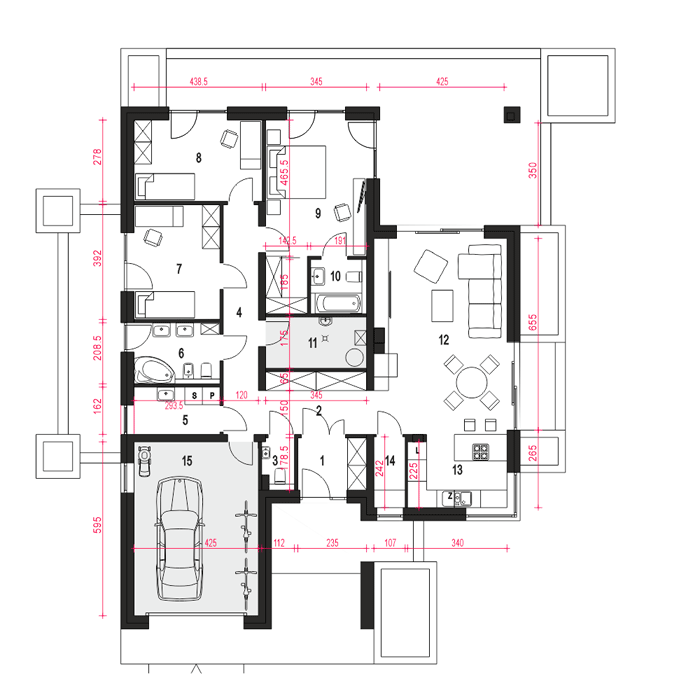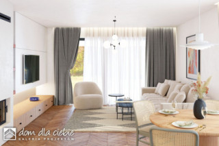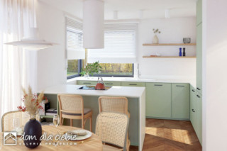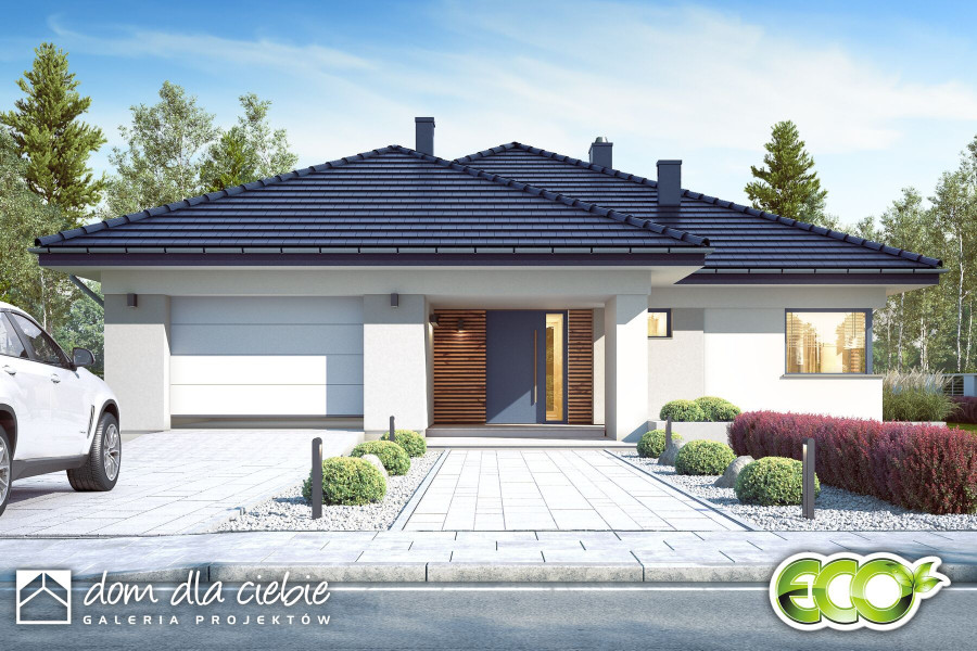 Projekt domu parterowego Klara IV z garażem to idealna propozycja dla 4 do 5cio osobowej rodziny. Dom zaprojektowany jest w technologii murowanej z tradycyjną więźbą dachową, przekryty spadzistym dachem kopertowym. Klara IV to funkcjonalny projekt domu parterowego, łączący strefę ogólnodostępną i prywatną na jednej kondygnacji. Projekt jest opracowany w oparciu o projekt Klara III, względem którego różni się zadaszeniem strefy wejściowej dachem opartym na filarach przekrywającym garaż. W części wejściowej mamy zaprojektowany wygodny wiatrołap i hol z szafami wnękowymi, pralnię oraz toaletę. W części ogólnodostępnej przewidziano przestronny i dobrze doświetlony salon z miejscem na wygodny stół jadalniany, z widokiem na ogród. Dzięki dużym drzwiom tarasowym od strony ogrodowej, dostaniemy się wprost na taras zewnętrzny, zadaszony podcieniem. W strefie ogólnodostępnej projekt przewiduje również wygodną kuchnię z wyspą i praktyczną spiżarnią. Kuchnia z układem mebli w kształcie litery "L", zapewnia wygodną przestrzeń do pracy, a duże frontowe okno doświetla idealnie przestrzeń roboczą. Do części prywatnej domu dostaniemy się przez korytarz dostępny z holu wejściowego. W części prywatnej mamy zaprojektowane cztery pokoje sypialne w tym jeden typu master bedroom. Znajdziemy tu też wygodną, wspólną łazienkę z wanną oraz pomieszczenie techniczne z piecem CO. Klara III to atrakcyjna propozycja domu energooszczędnego, o nowoczesnym wyglądzie. To projekt domu z serii "eco" - ekonomiczny w budowie i w utrzymaniu - idealna propozycja dla rodzin planujących budowę pierwszego domu.fundamenty: BETONOWE ściany zewnętrzne: POROTHERM+STYROPIAN TERMO ORGANIKA rodzaj stropu: TERIVA I elewacje: TYNK STRUKTURALNY pokrycie dachu: DACHÓWKA CEM. lub CER.