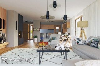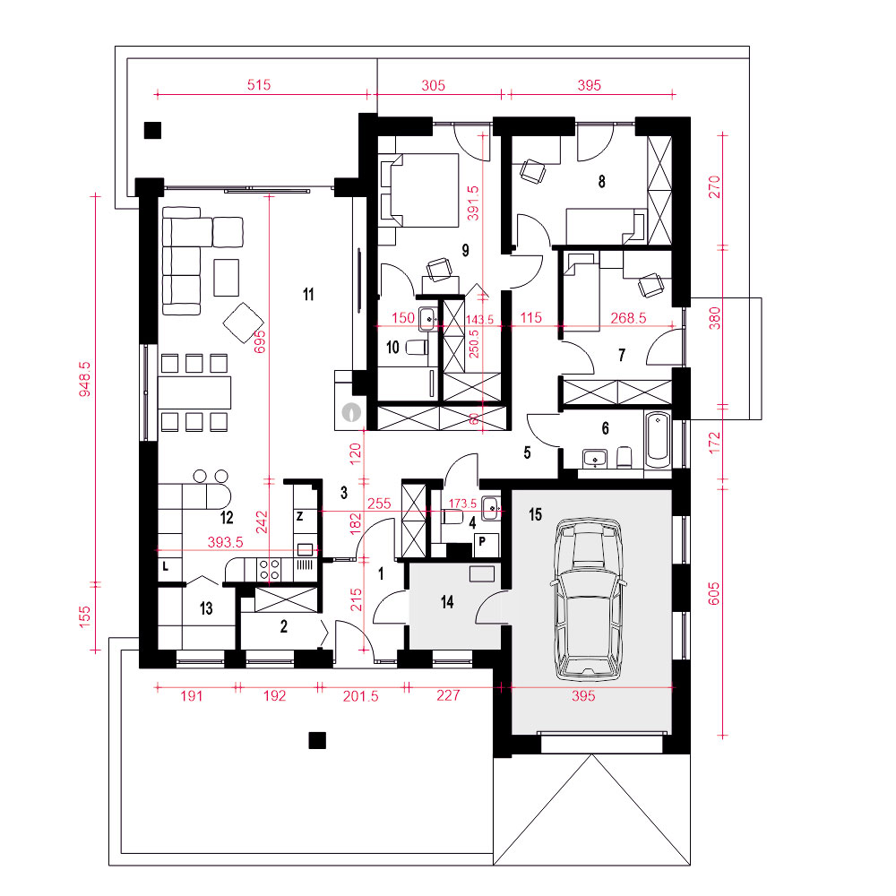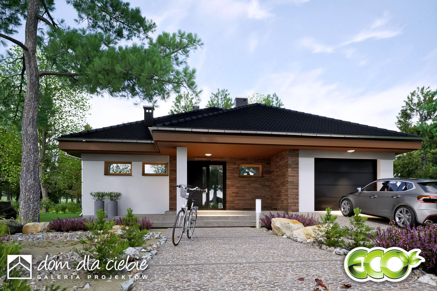 Melisa II to propozycja optymalnego domu jednorodzinnego dla 3-4osobowej rodziny. Główna bryła Melisy jest założona na planie kwadratu przekryta regularnym dachem o kącie nachylenia 30 stopni z garażem jednostanowiskowym. Zadaszenie strefy wejściowej przed domem oraz dwustanowiskowy wysunięty garaż tworzą zgrabne zadaszenie wejścia. W środku zaprojektowano trzy sypialnie umiejscowione od strony ogrodowej w głębi domu. Dwuosobowa sypialnia, zaprojektowana w centrum budynku, posiada indywidualną łazienkę oraz garderobę. Z każdej z sypialni można wyjść bezpośrednio na ogród. W strefie indywidualnej zaplanowano wspólną łazienkę z wanną. Przy kuchni otwartej na jadalnię i salon przewidziano wygodną spiżarnię. Z salonu można wyjść do strefy ogrodowej poprzez zadaszony taras. Z wiatrołapu można się dostać do garażu poprzez pomieszczenie techniczne z piecem CO. W holu mamy miejsce na szafę wnękową. Obok przewidziano niewielki WC. Cały projekt zawiera wszystko co niezbędne dla wygodnego, rodzinnego życia, a duży salon z zadaszonym tarasem i kominkiem jest jego sercem.fundamenty: BETONOWE ściany zewnętrzne: POROTHERM+STYROPIAN TERMO ORGANIKA ściany wewnętrzne: POROTHERM rodzaj stropu: TERIVA elewacje: TYNK STRUKTURALNY, CEGŁA KLINKIEROWA pokrycie dachu: DACHÓWKA CERAMICZNA