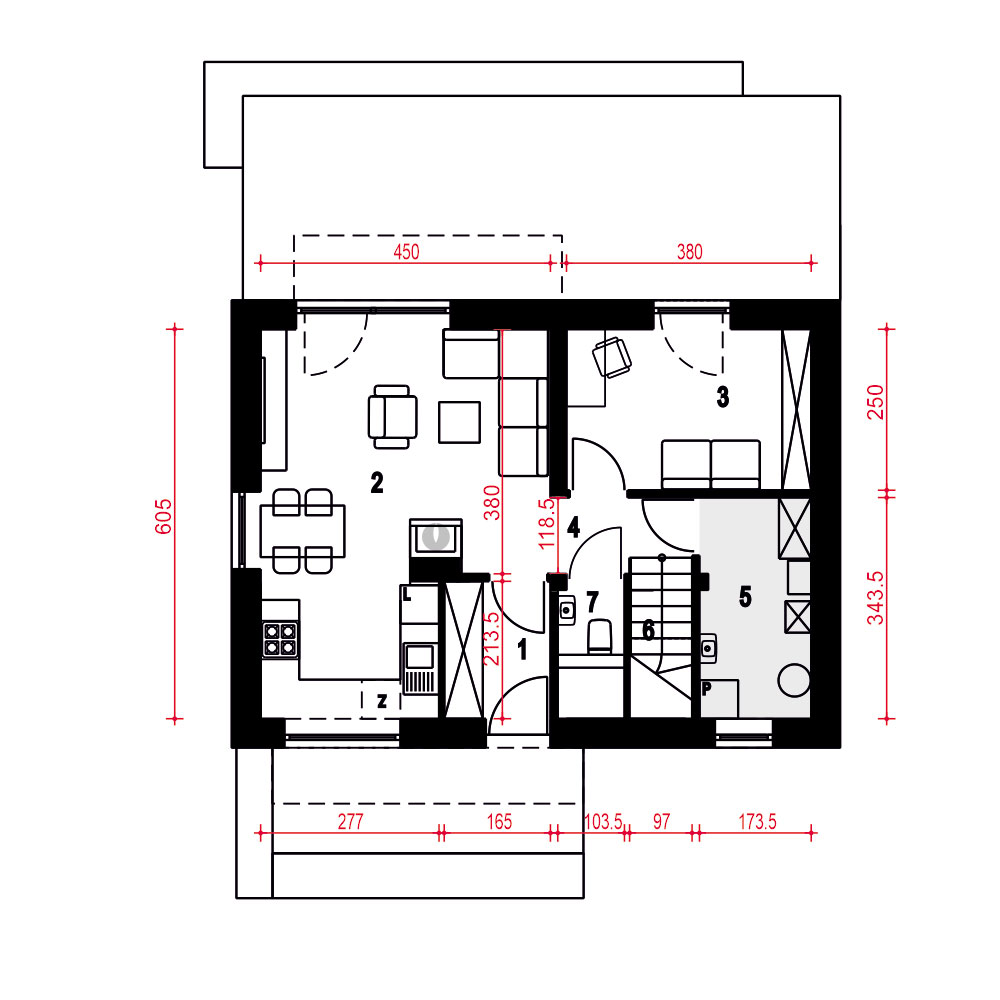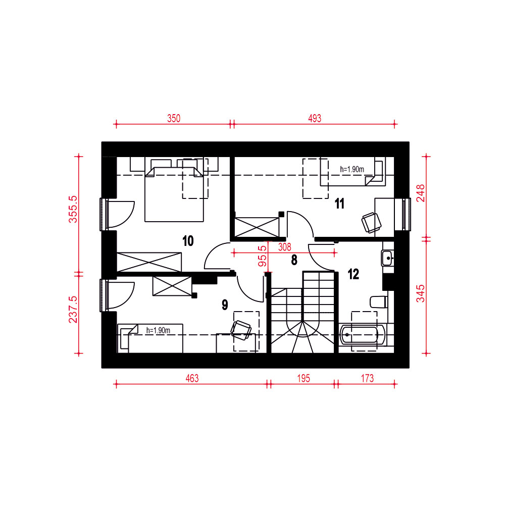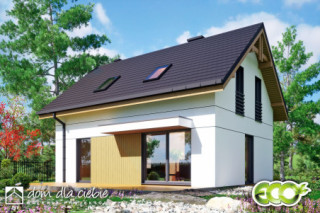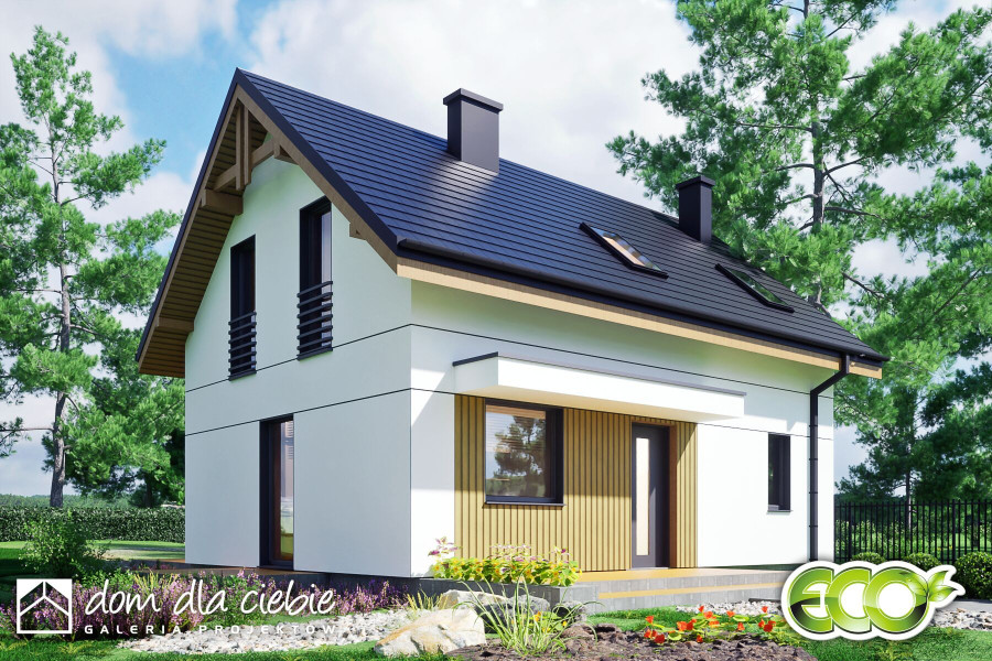 Borówka to mały domek o pow. zabudowy do 70m2. Projekt zawiera salon z kuchnia oraz dodatkowy pokój na parterze a na poddaszu 3 pokoje i łazienkę. Urokliwa Borówka może z powodzeniem stać się wygodnym lokum dla dla 4 osobowej rodziny. Projekt cechuje proporcjonalna bryła oraz eleganckie w wykończeniu elewacje.fundamenty: BETONOWE ściany zewnętrzne: POROTHERM+STYROPIAN TERMO ORGANIKA ściany wewnętrzne: POROTHERM rodzaj stropu: TERIVA elewacje: TYNK STRUKTURALNY, CEGŁA KLINKIEROWA pokrycie dachu: DACHÓWKA CERAMICZNA