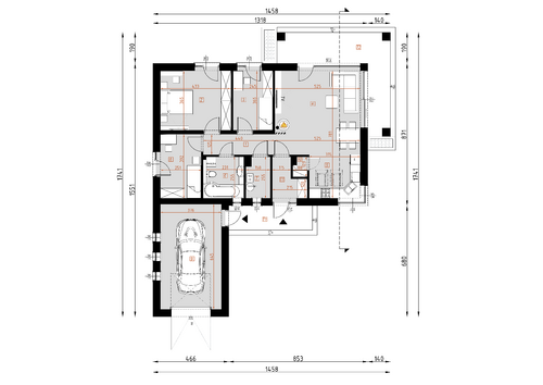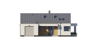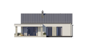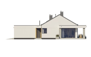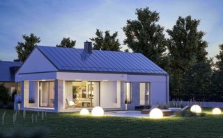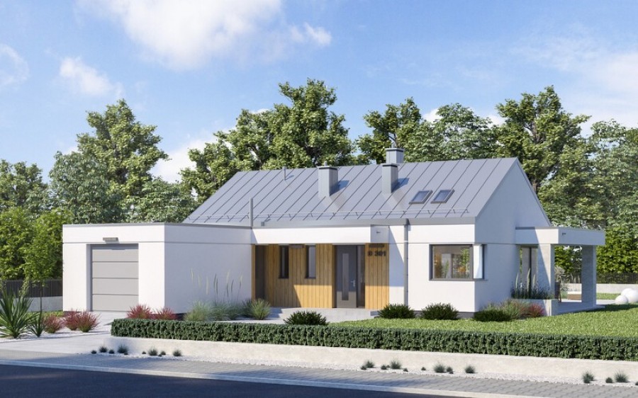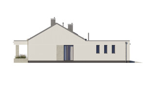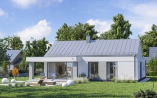 Projekt domu parterowego bez poddasza. Na salonem jest otwarcie stropu do dachu. Widoczne są krokwie. Okna dachowe doświetlają w tym miejscu salon.