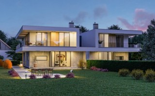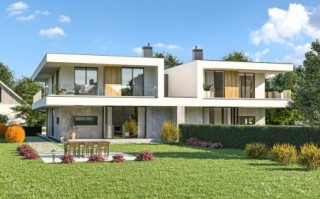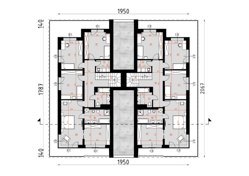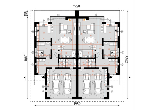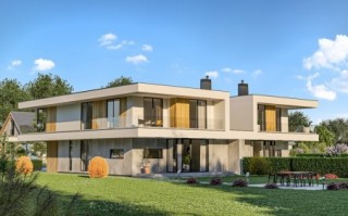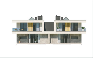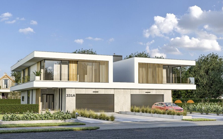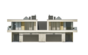 Układ funkcjonalny budynku: Kondygnacja parteru, każdego z lokali składa się z przedsionka wejściowego, salonu z jadalnią oraz kuchnią, łazienki, gabinetu, kotłowni oraz garażu dwustanowiskowego Kondygnacja piętra każdego z lokali składa się z głównej sypialni z łazienką oraz garderobą, trzech pokoi sypialnianych, łazienki, pralni, oraz korytarza z klatką schodową łączącego pomieszczenia. Całość zabudowy okala taras zewnętrzny. D331 to wersja tego projektu połówka bliźniaka. WYSOKOŚĆ BUDYNKU (od poz. posadzki parteru +/-0.00 do świetlika) 7,76 m WYSOKOŚĆ BUDYNKU (od poz. terenu do świetlika) MAX. 8,10 m WYSOKOŚĆ BUDYNKU (od poz. terenu do dachu płaskiego) MAX. 7,20 m