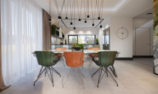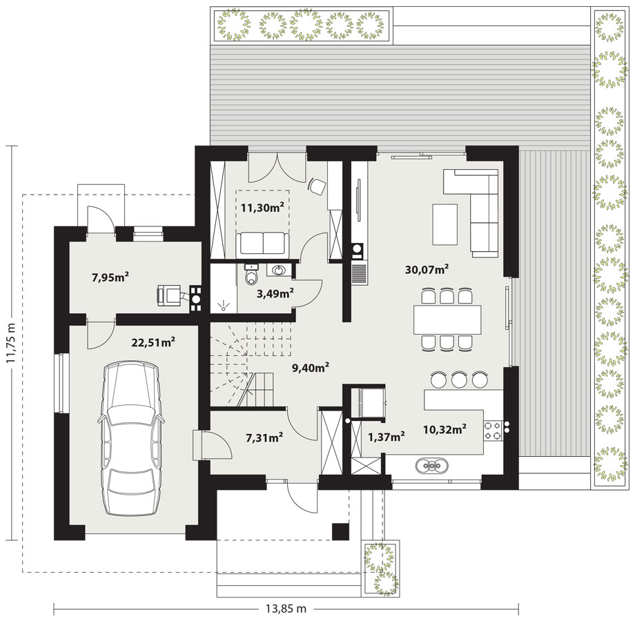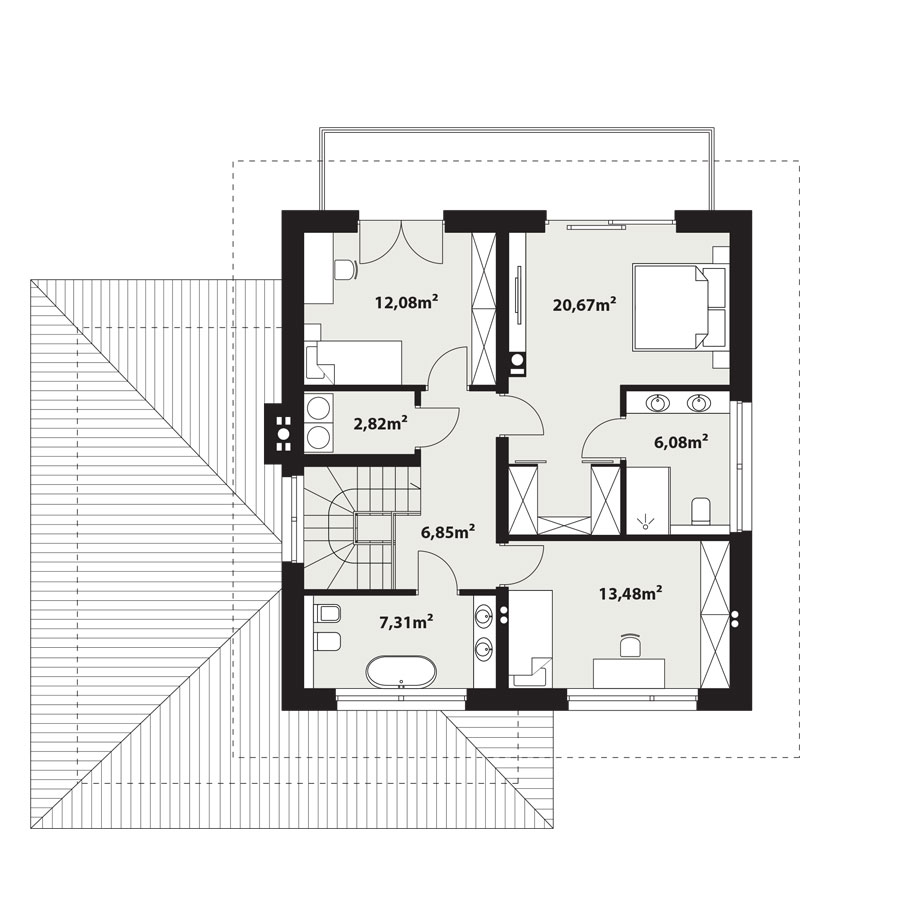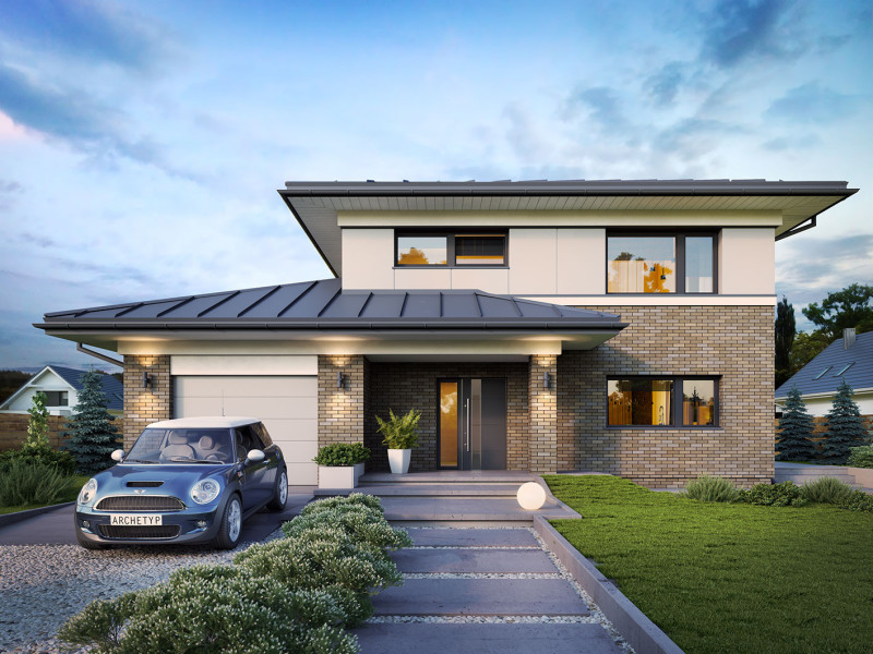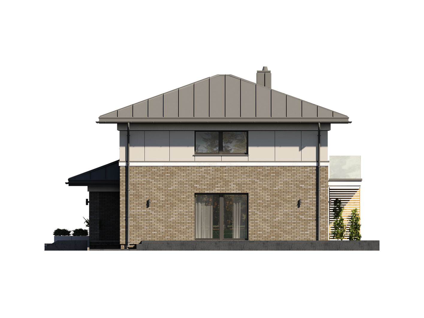 Terra, to projekt reprezentacyjnego domu piętrowego przeznaczonego dla 4-osobowej rodziny. Jest to typowo miejska rezydencja o nowoczesnym wyglądzie i optymalnej powierzchni użytkowej. Posiada bogaty program funkcjonalny, rozłożony na dwóch pełnych kondygnacyjnych, który zapewni komfort nawet dla wymagających inwestorów. Parter zaprojektowano jako otwartą przestrzeń dzienną, złożoną z połączonego salonu, jadalni i kuchni. Przewidziano tutaj także dodatkowy pokój, który można wykorzystać jako gabinet lub dodatkową sypialnię. Na parterze znajduje się również duża kotłownia, na każdy rodzaj paliwa oraz jednostanowiskowy garaż. Dzięki osłonięciu częściowo zadaszonych tarasów, uzyskano na tarasie prywatną strefę wypoczynku. Na piętrze zaprojektowano 3 sypialnie, łazienkę i pralnię. Główna sypialnia ma zapewnioną własną garderobę oraz łazienkę. Taką dodatkową przestrzeń można według potrzeb przerobić np. na kącik do pracy. Terra zachwyca wysmakowaną, ponadczasową, klasyczną bryłą ujętą we współczesny elegancki wizerunek. Rezydencja ta stanowi doskonałą propozycję dla inwestorów poszukujących komfortowego domu w estetycznym wydaniu.