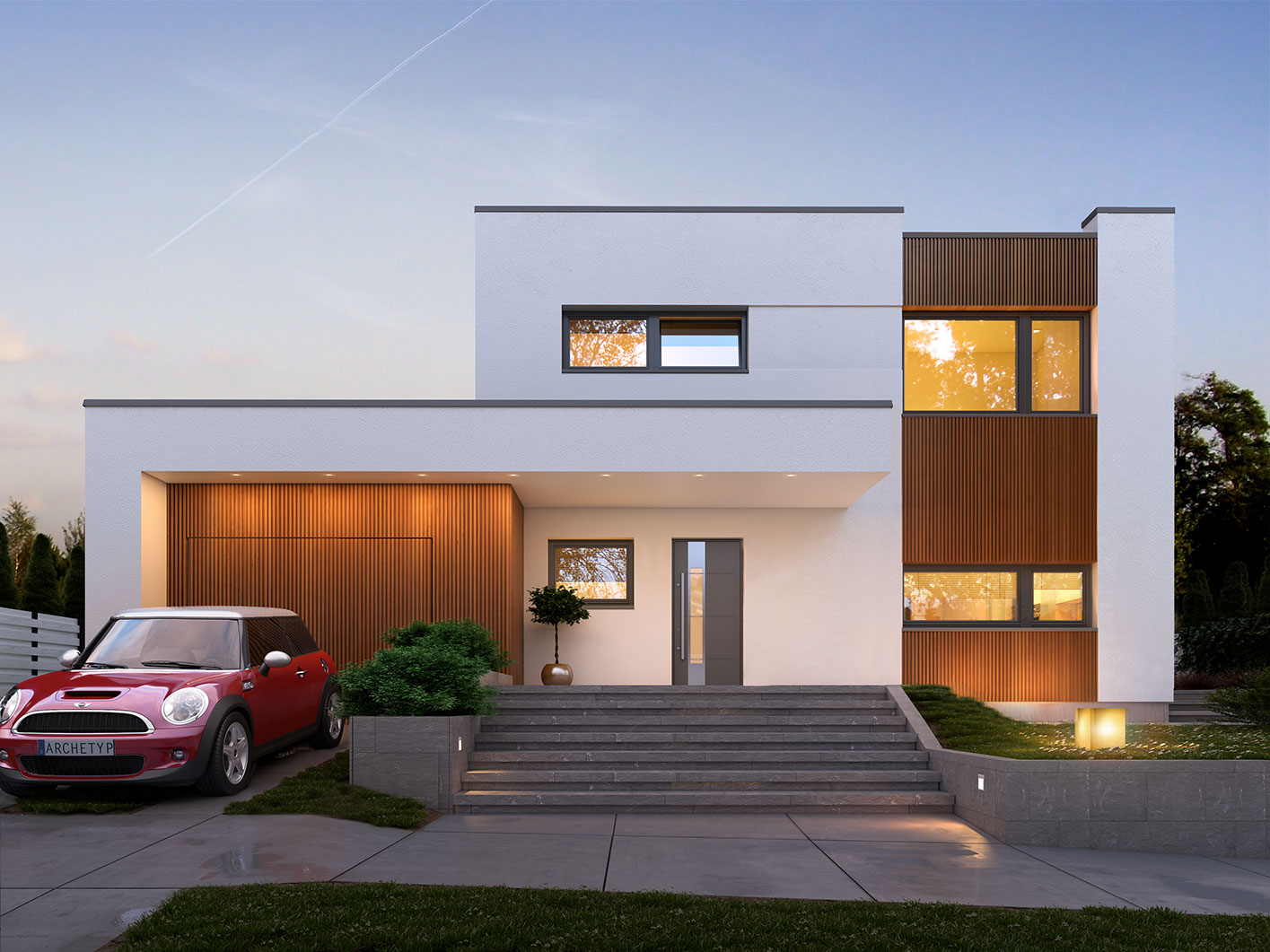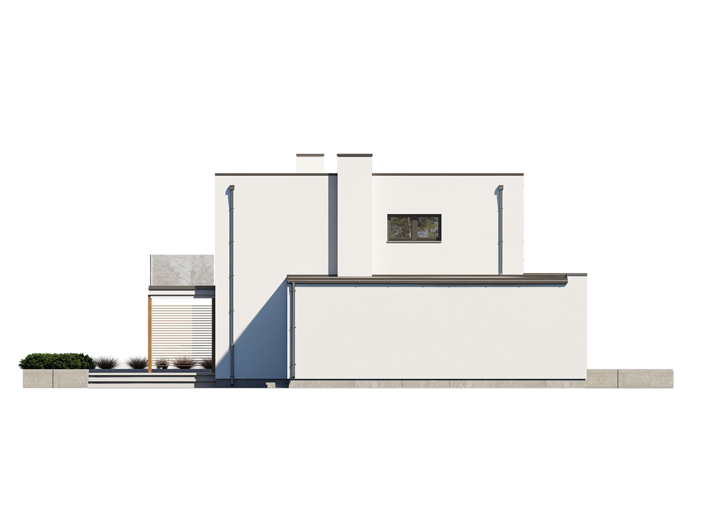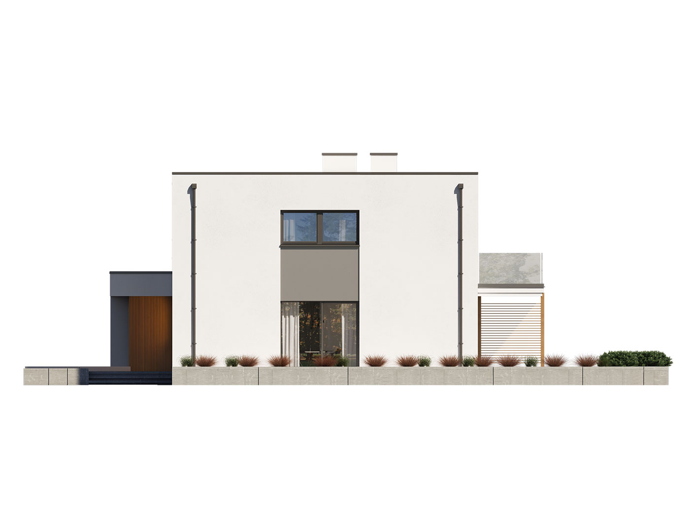 Nowik 2 to interesująca propozycja domu skierowana do inwestorów ceniących prostotę i minimalizm w nowoczesnym wydaniu. To przykład eleganckiej wielkomiejskiej willi przeznaczonej dla 4 -osobowej rodziny. Bryłę tego piętrowego domu, przykryto płaskim dachem, na elewacjach pojawiają się biały tynk, którego surowość „ociepla” drewniana szalówka. Zastosowane materiały i podziały elewacji świetnie ze sobą współgrają nadając budynkowi elegancki charakter i klimat współczesnych willi. Elementami determinującymi bryłę są przeszklenia zarówno w dziennej jak i nocnej części budynku. Tworzą one szerokie otwarcie na rozległy taras i balkon. W tej eleganckiej, nowoczesnej formie budynku ujęty został optymalny program użytkowy. W części dziennej pojawił się przestronny salon z otwartą jadalnią oraz kuchnia ze spiżarnią, a także gabinet, który można przerobić na dodatkową sypialnię. W części nocnej znalazły się 3 sypialnie z łazienką oraz pralnią. Główna sypialnia posiada dodatkowo garderobę i odrębną łazienkę. W części gospodarczej przewidziano jednostanowiskowy garaż oraz dużą kotłownię. Nowik 2 zachwyca ciekawą, ale zarazem prostą bryłą. Rezydencja ta stanowi doskonałą propozycję dla inwestorów poszukujących komfortowego domu w nowoczesnym, estetycznym i eleganckim wydaniu.