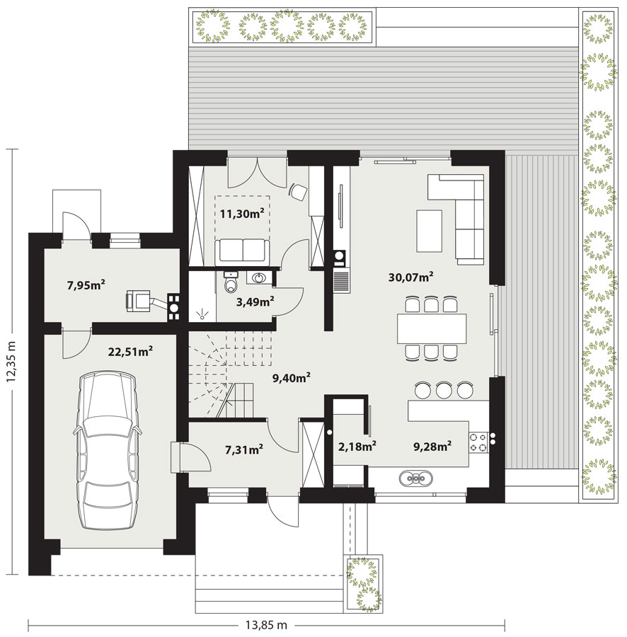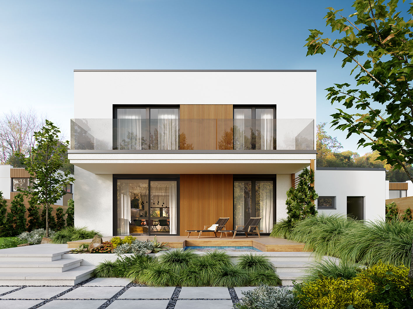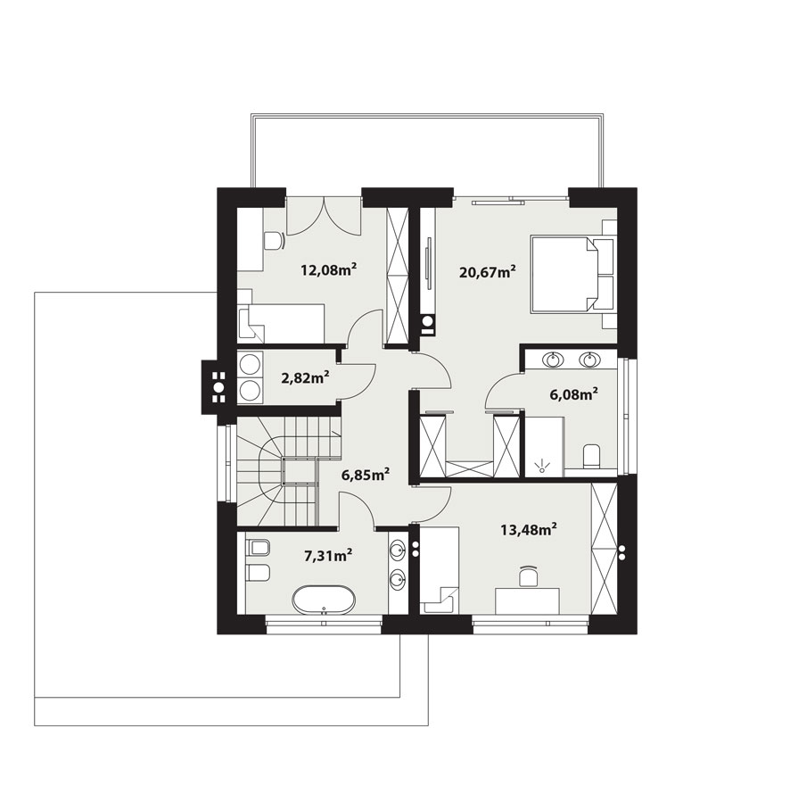 Nowik 2 to interesująca propozycja domu skierowana do inwestorów ceniących prostotę i minimalizm w nowoczesnym wydaniu. To przykład eleganckiej wielkomiejskiej willi przeznaczonej dla 4 -osobowej rodziny. Bryłę tego piętrowego domu, przykryto płaskim dachem, na elewacjach pojawiają się biały tynk, którego surowość „ociepla” drewniana szalówka. Zastosowane materiały i podziały elewacji świetnie ze sobą współgrają nadając budynkowi elegancki charakter i klimat współczesnych willi. Elementami determinującymi bryłę są przeszklenia zarówno w dziennej jak i nocnej części budynku. Tworzą one szerokie otwarcie na rozległy taras i balkon. W tej eleganckiej, nowoczesnej formie budynku ujęty został optymalny program użytkowy. W części dziennej pojawił się przestronny salon z otwartą jadalnią oraz kuchnia ze spiżarnią, a także gabinet, który można przerobić na dodatkową sypialnię. W części nocnej znalazły się 3 sypialnie z łazienką oraz pralnią. Główna sypialnia posiada dodatkowo garderobę i odrębną łazienkę. W części gospodarczej przewidziano jednostanowiskowy garaż oraz dużą kotłownię. Nowik 2 zachwyca ciekawą, ale zarazem prostą bryłą. Rezydencja ta stanowi doskonałą propozycję dla inwestorów poszukujących komfortowego domu w nowoczesnym, estetycznym i eleganckim wydaniu.