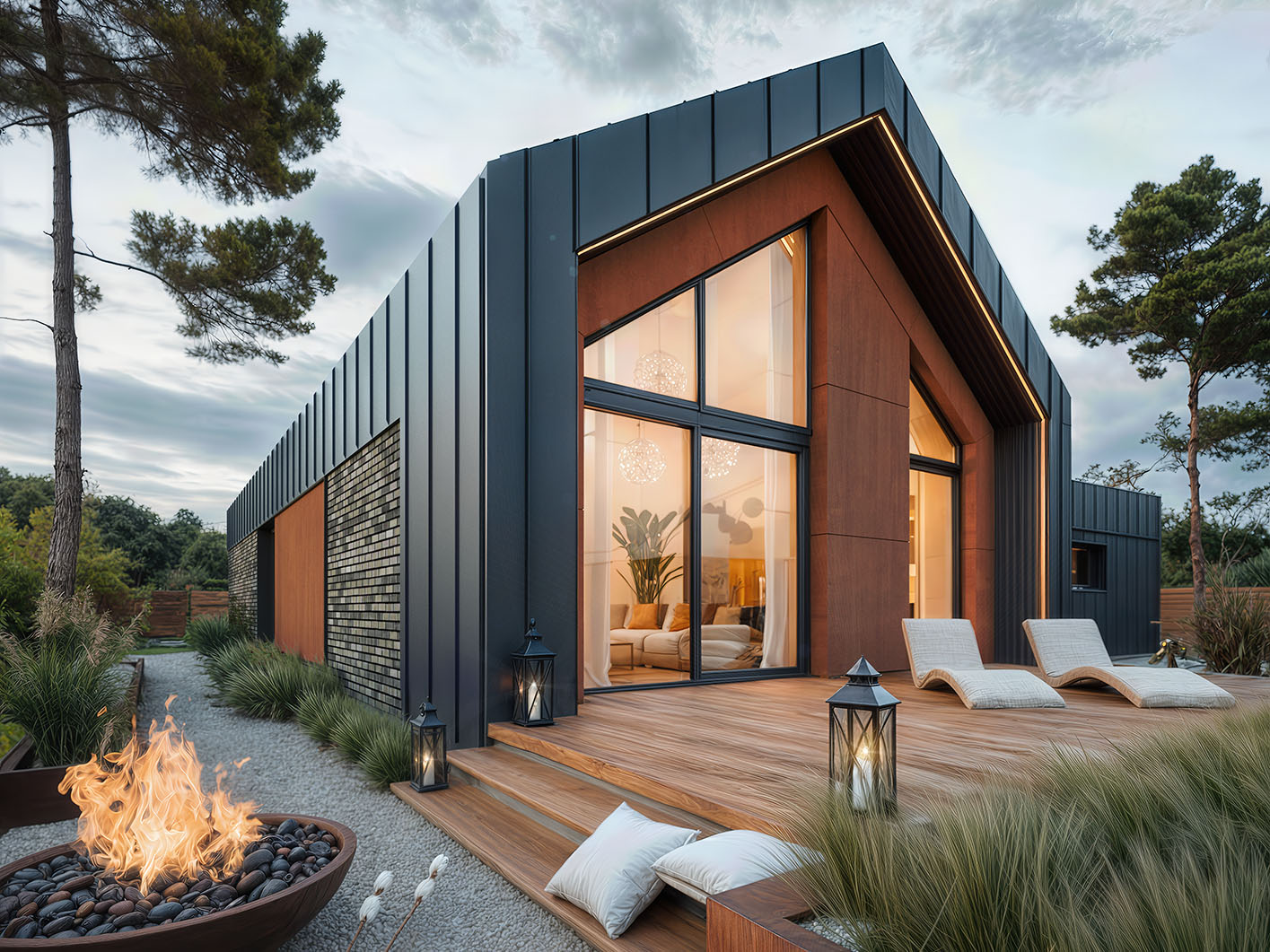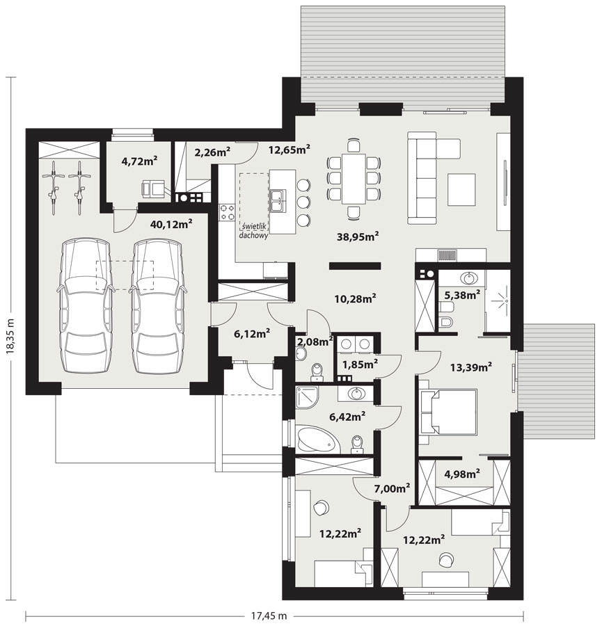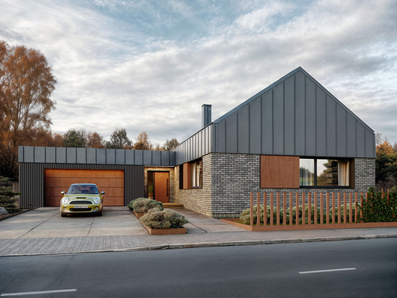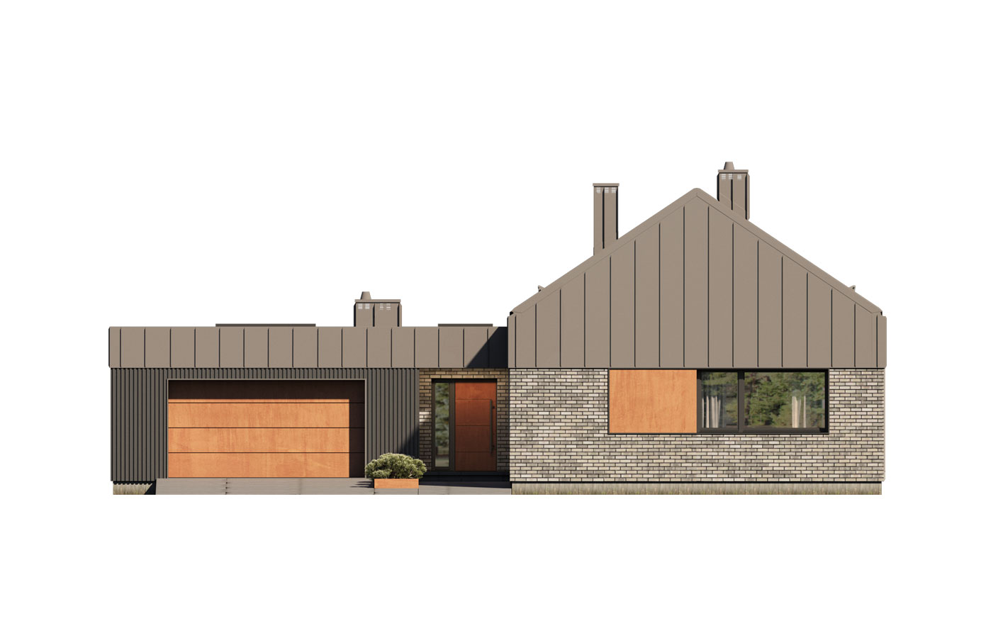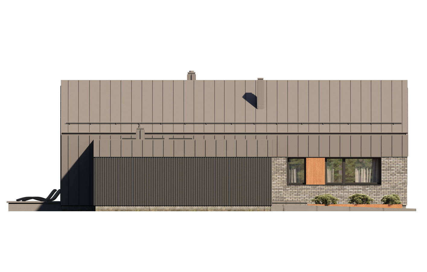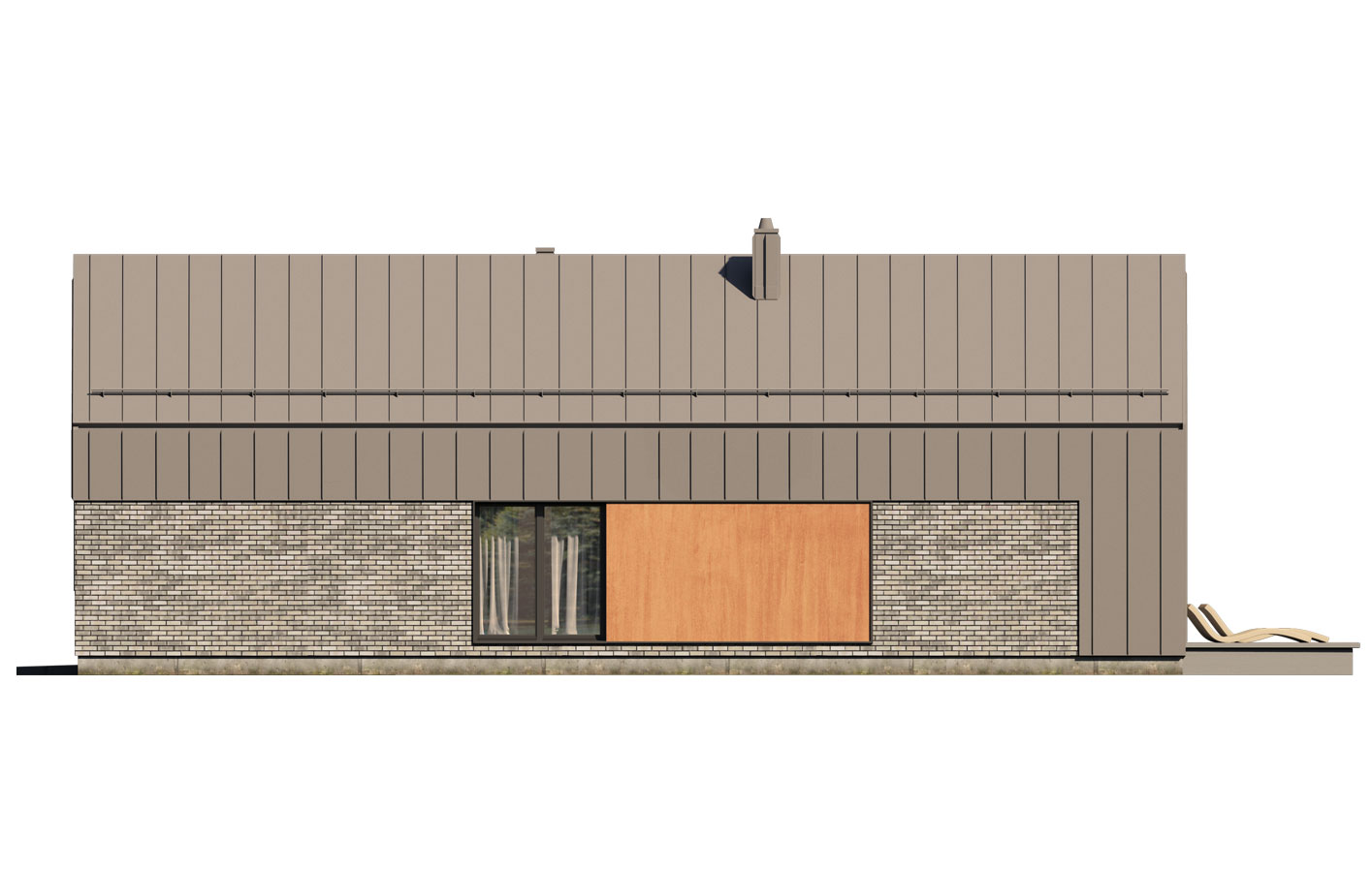 Dom Lili 2 to ciekawa propozycja dla inwestorów ceniących współczesne spojrzenie na architekturę. Projekt ma bardzo interesującą aranżację zewnętrzną i swoim charakterem nawiązuje do stylu nowoczesnej stodoły. W domu Lili 2 główna bryła budynku, która odwołuję się do archetypu domu, na rzucie prostokąta przykrytego dwuspadowym, bezokapowym dachem, zestawiona jest z prostą bryłą garażu i wejścia z płaskim dachem. Nowoczesną stylistykę podkreśla dodatkowo ogromne przeszklenie w części dziennej, stanowiące obok cofniętego wejścia, główny akcent budynku. Współczesny, minimalistyczny charakter domu uzyskano dzięki elewacjom wykończonym kontrastującym ze sobą białym i czarnym tynkiem, urozmaiconym szalówką w kolorze naturalnego drewna, które idealnie komponują się z szarą blachą na rąbek. Dom Lili 2, który kształtem nawiązuje do tradycyjnych wzorców typowych dla terenów wiejskich, we wnętrzu zachował bardzo przejrzysty, funkcjonalny i bogaty program użytkowy dla 3-4 osobowej rodziny. Układ domu został podzielony na 3 strefy, gdzie część dzienna to przestronny salon z jadalnią, kuchnia ze spiżarnią. Strefa intymna składa się z 3 sypialni, łazienki i pralni, z czego największa sypialnia ma własną garderobę i łazienkę. Część gospodarcza to dwustanowiskowy garaż i kotłownia. Niewątpliwym atutem projektu jest zastosowanie dużego tarasu oraz licznych przeszkleń zarówno w części dziennej, jak i w każdej z sypialni, co pozwala na otwarcie domu "na zewnątrz" i cieszenie się z pięknych, naturalnych walorów działki.