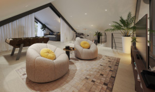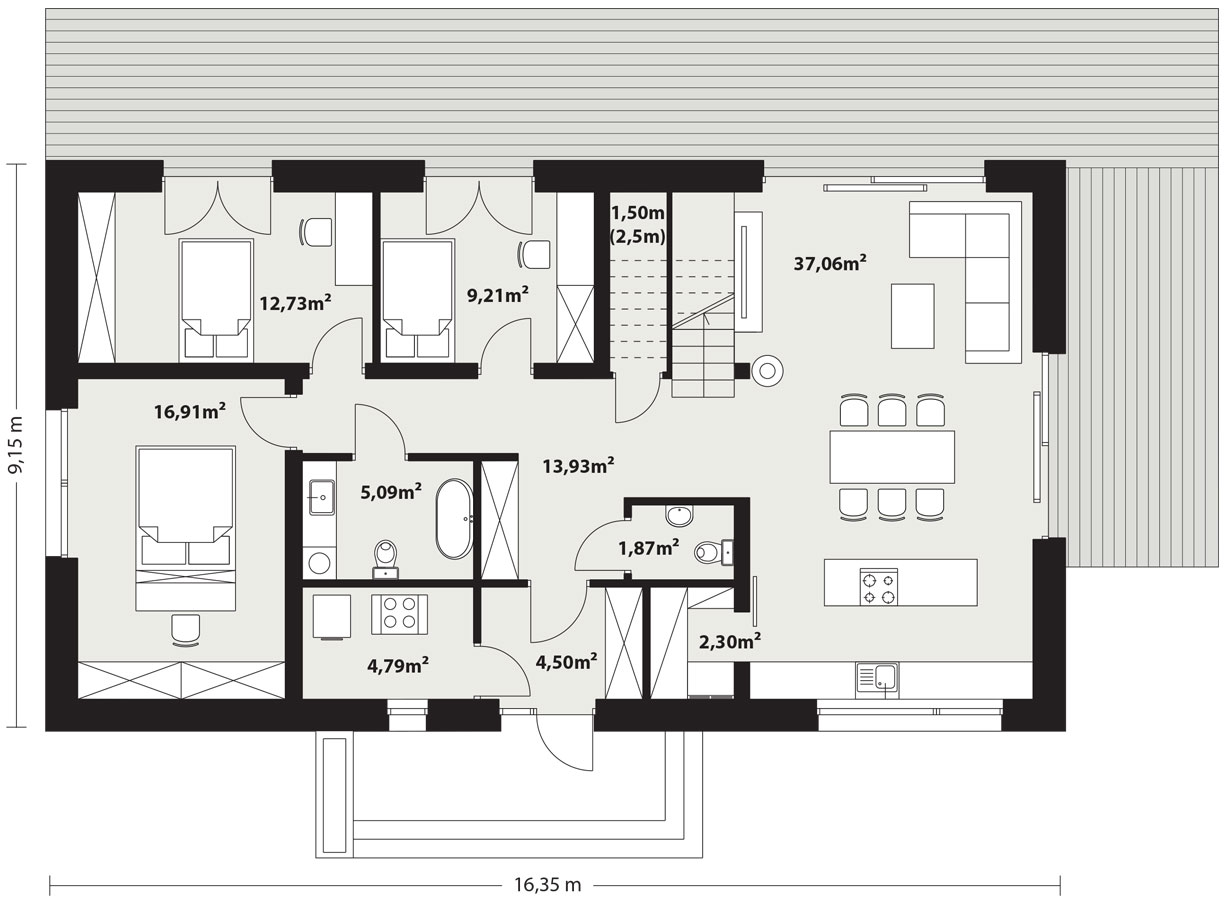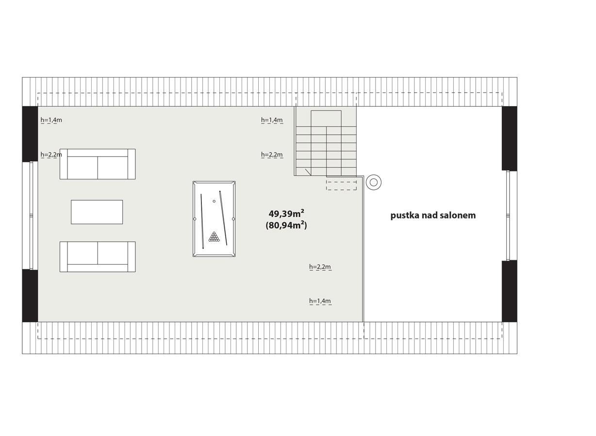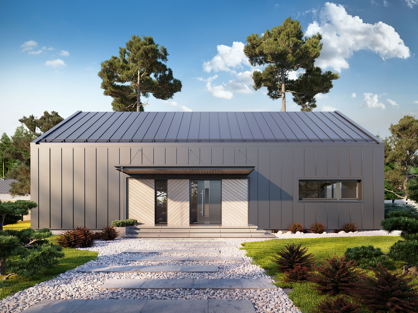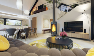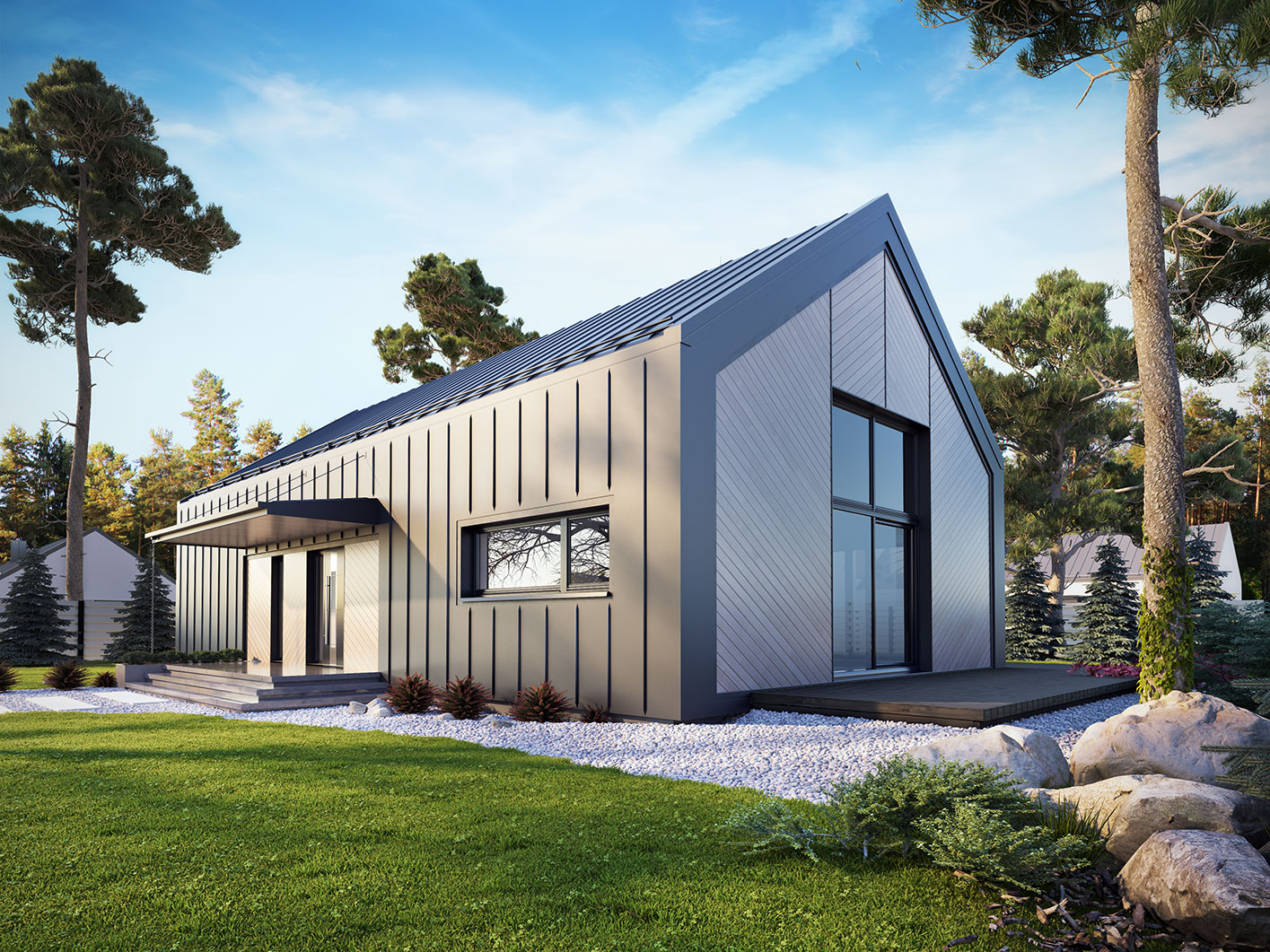 Projekt Hana to dom w stylu nowoczesnej stodoły. Bezokapowa bryła postawiona jest na planie prostokąta. Duże przeszklenia i otwarta przestrzeń salonu nadają nowoczesnego charakteru. Dom spełnia program użytkowy w parterze (109,89 m2) a antresola (49,39 m2) jest dodatkową powierzchnią, niewliczoną do powierzchni użytkowej, która może być zaadaptowana jako mieszkalna lub zabudowana w formie strychu. Dom Hana jest prosty i funkcjonalny a wnętrze pozwala na wiele sposobów aranżacji. Standardowo dom wyposażony jest w rekuperację oraz pompę ciepła.