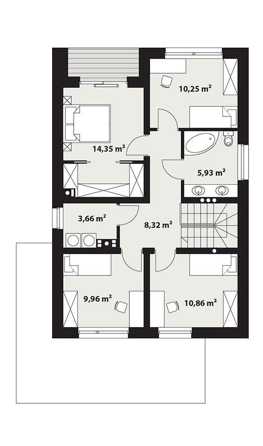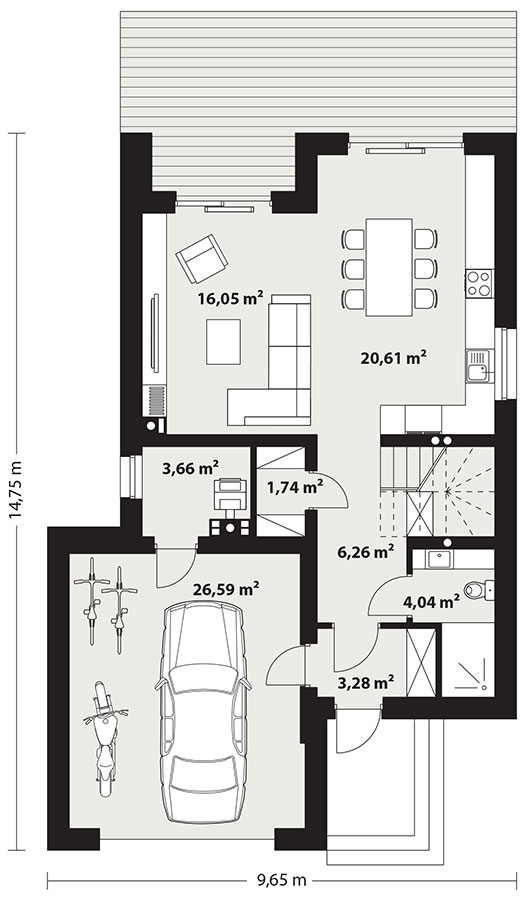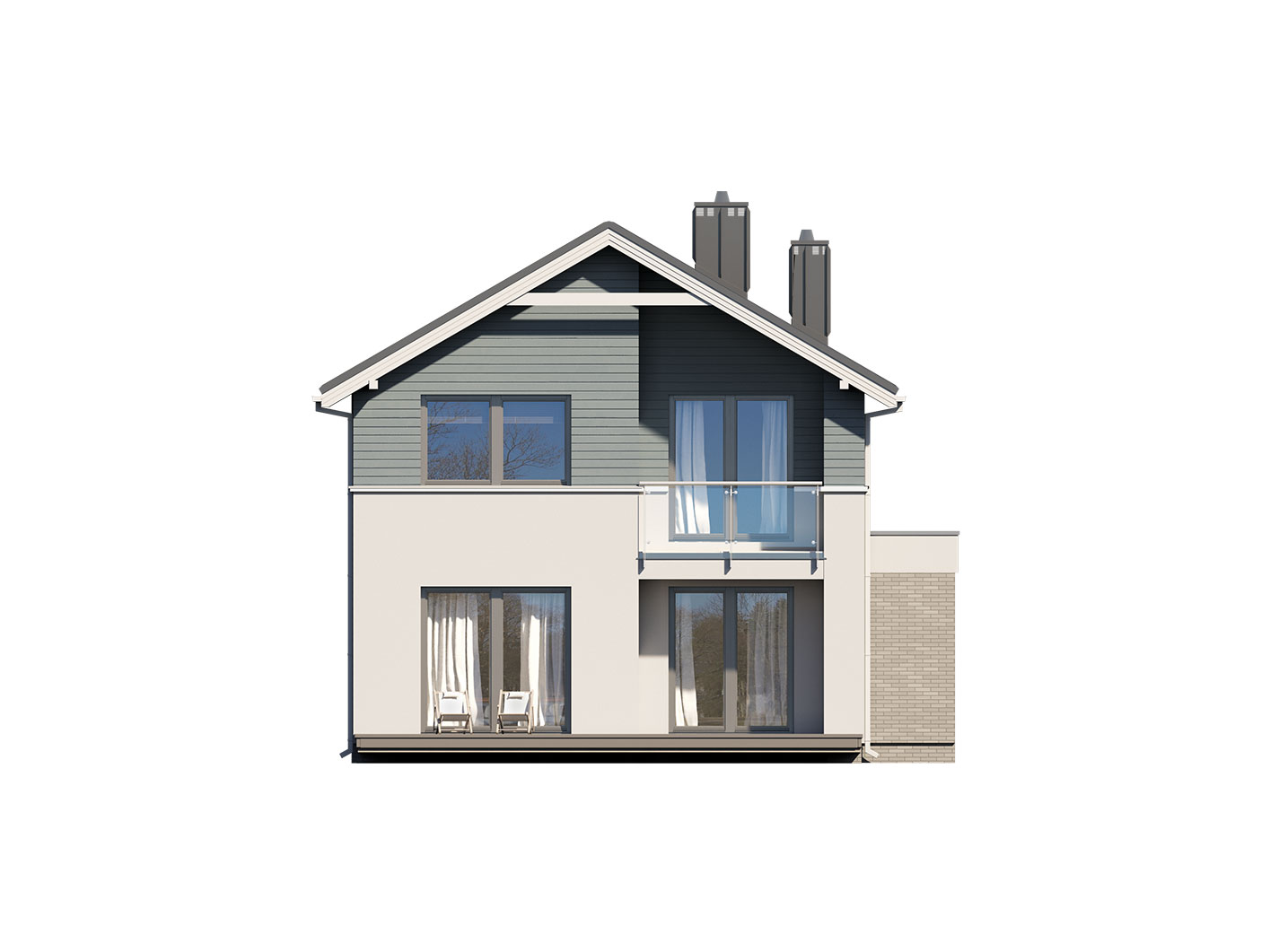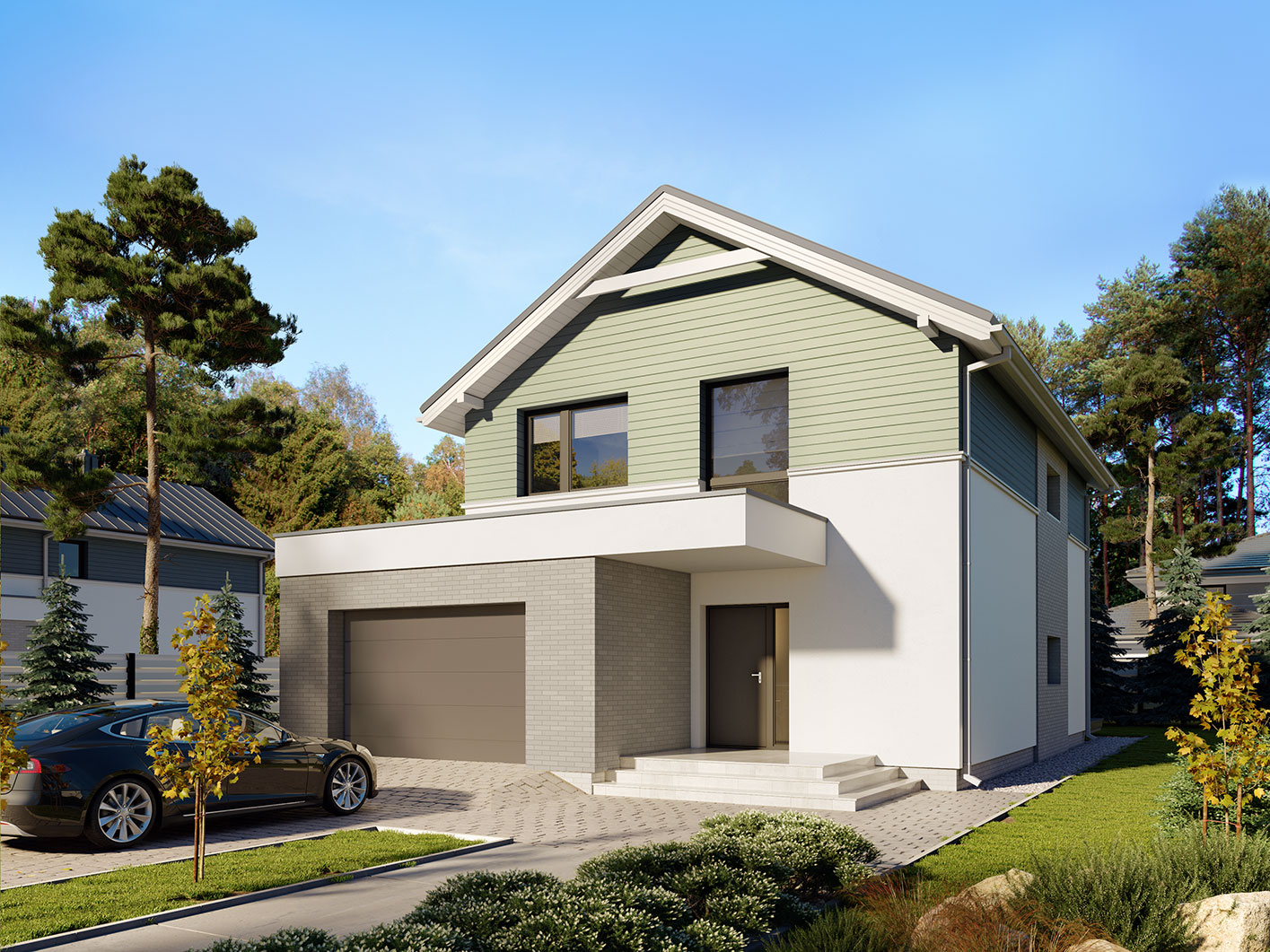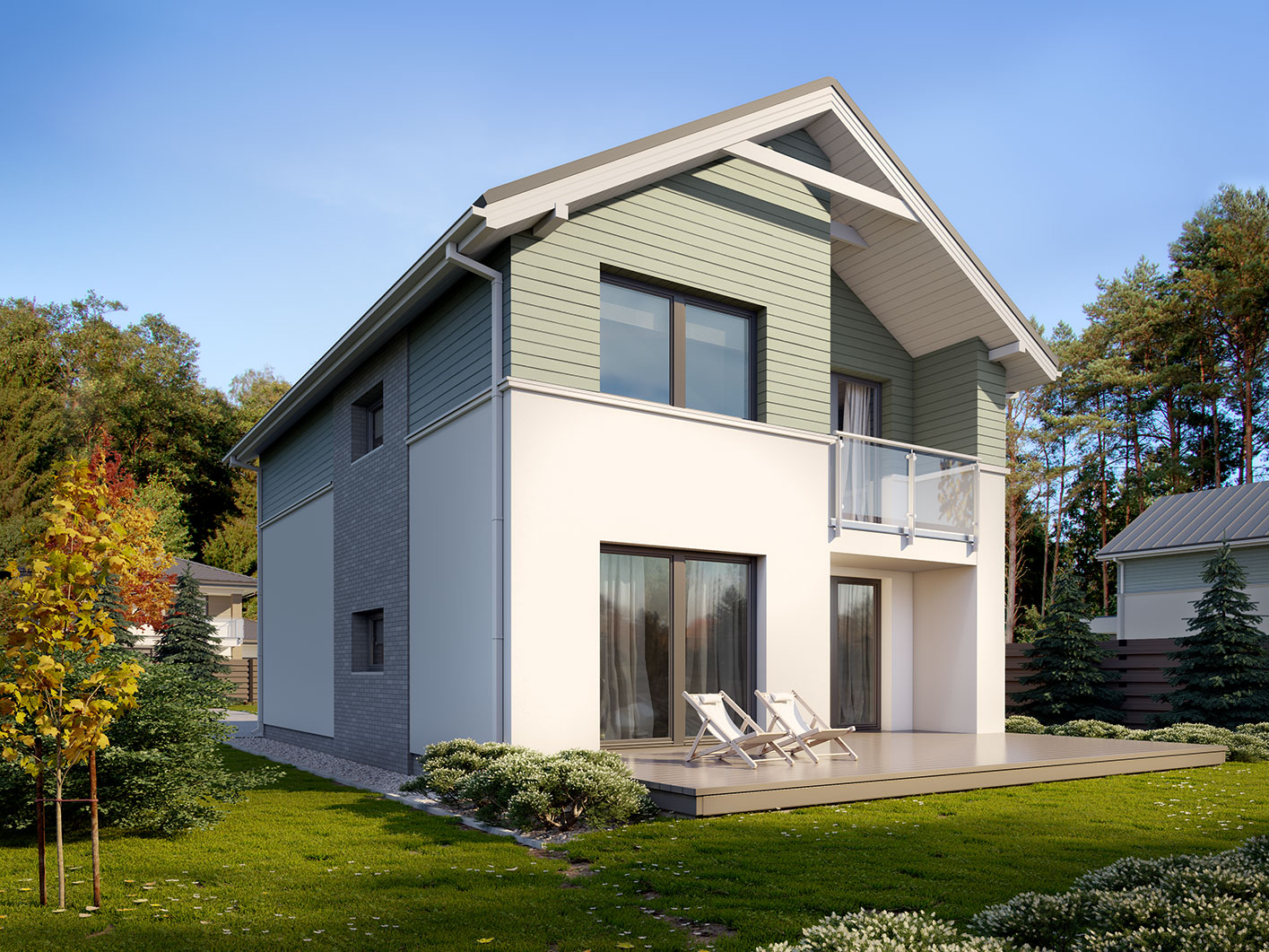 Emi to piętrowy dom jednorodzinny z garażem. W zwartej zabudowie z pełnym piętrem przykrytej dwuspadowym dachem, stworzono funkcjonalne wnętrze z przestronną częścią dzienną w parterze oraz czterema sypialniami na górze. W domu nie zabrakło również pomieszczeń pomocniczych jak garderoby, pralnia, kotłownia czy spiżarnia. Jest to ciekawa propozycja na wygodny dom w zwartej zabudowie gdy działka nie jest zbyt duża.